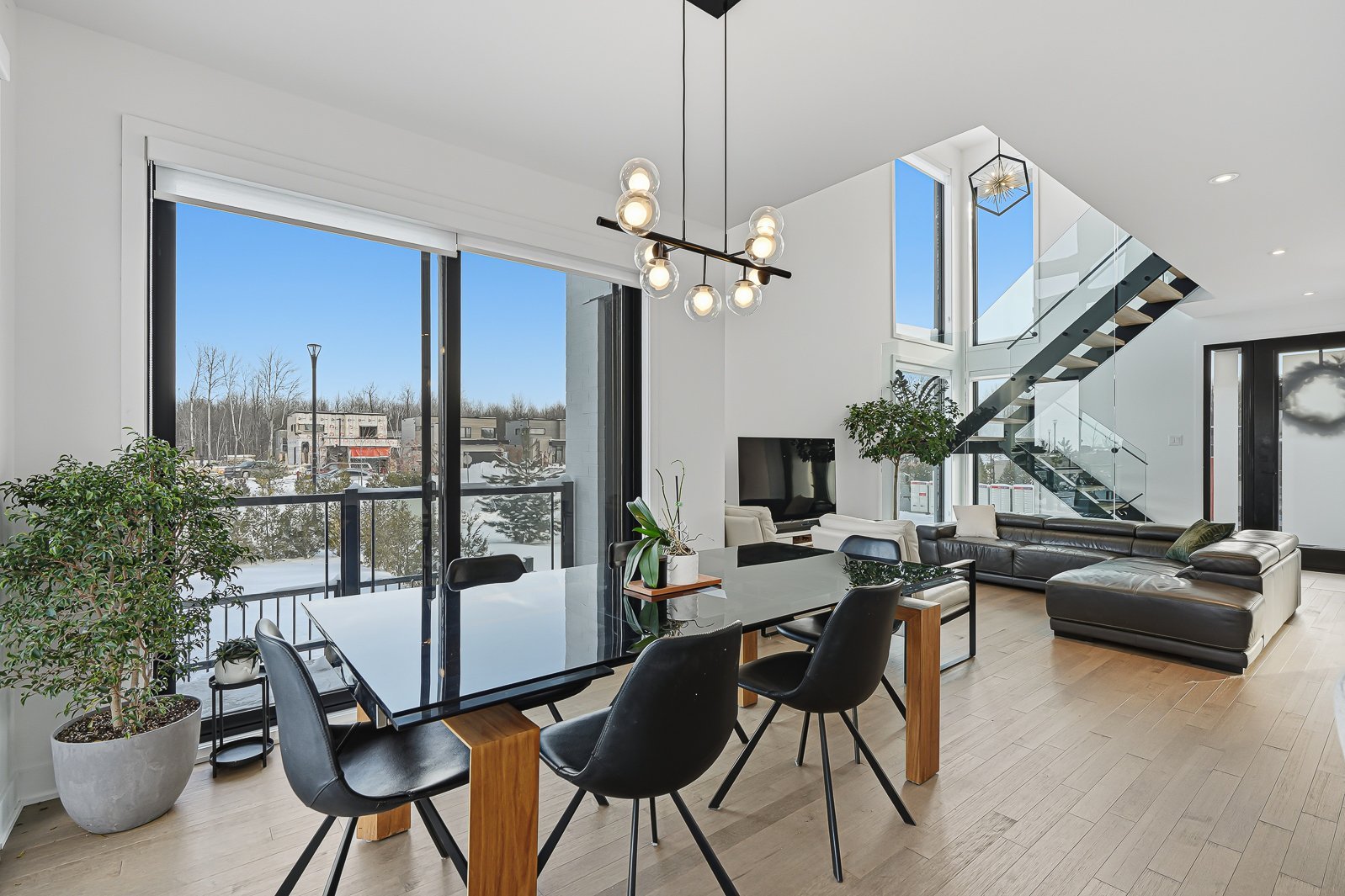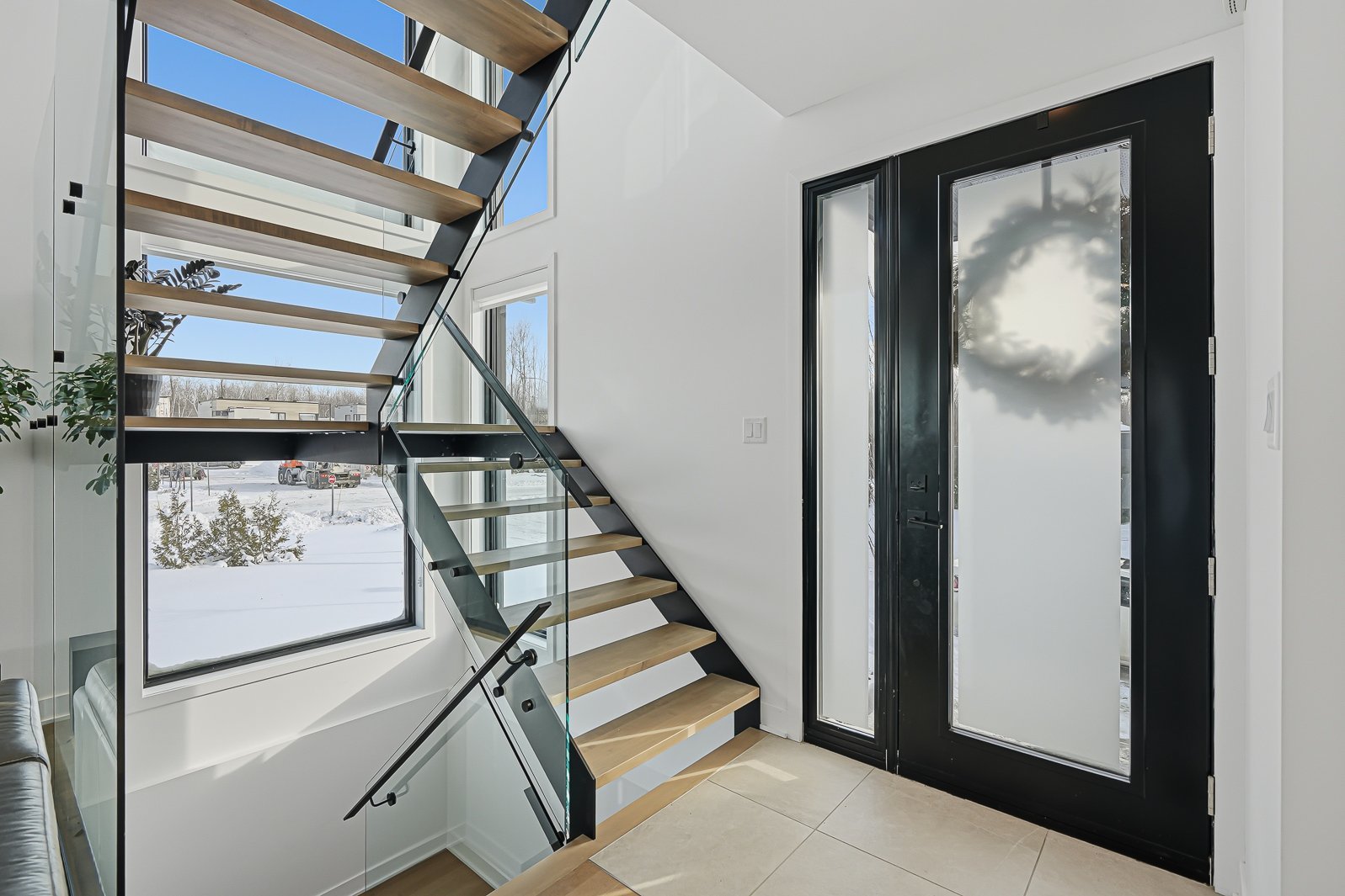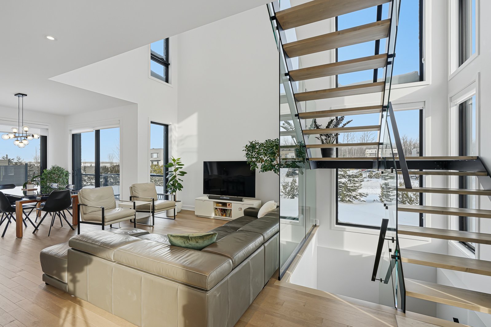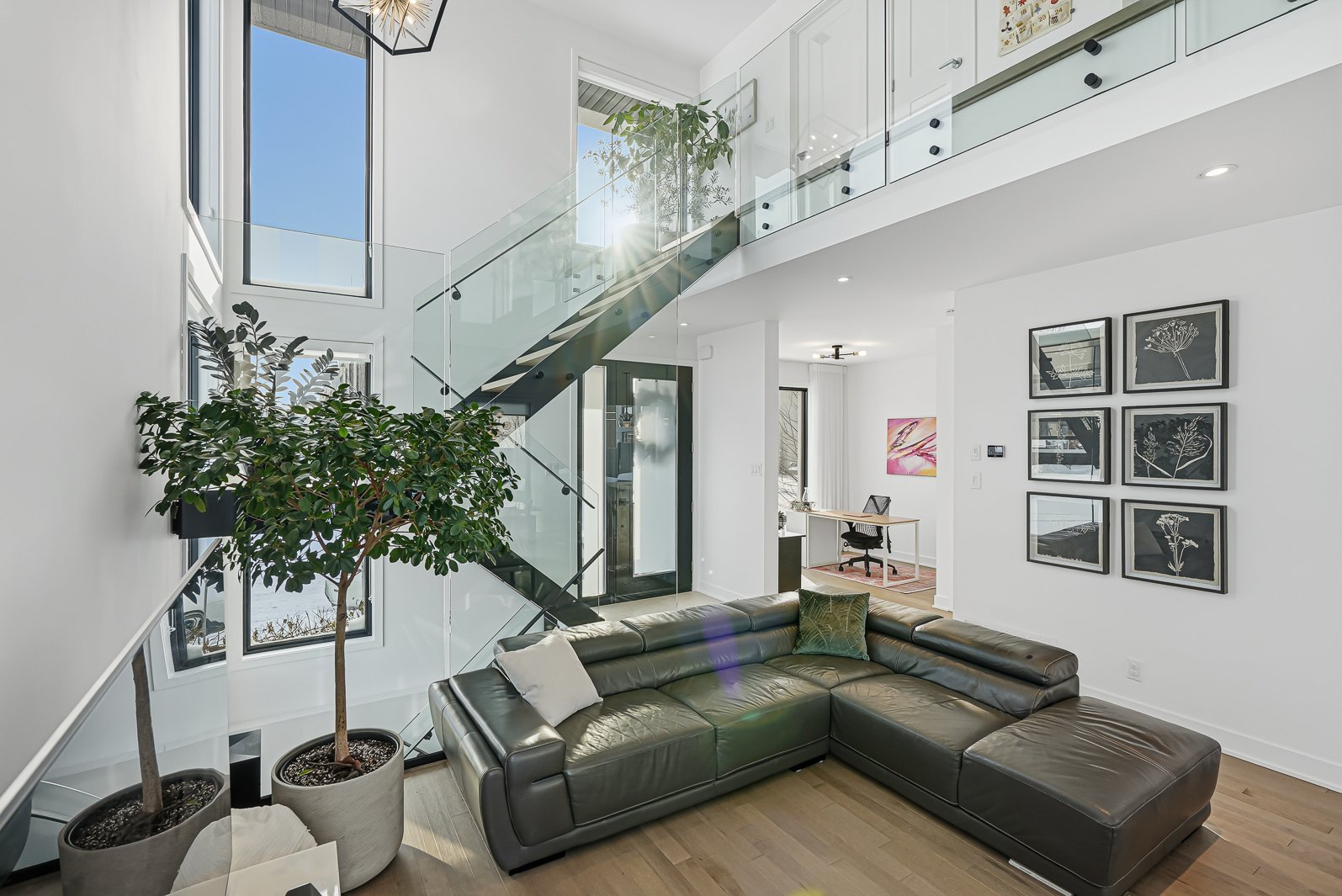 Upon entry, an open-concept living area immediately impresses with its soaring ceilings and a striking architectural staircase with glass railings, a true focal point that adds a modern and refined character to the home. High-quality materials and clean lines create a warm yet current atmosphere, ideal for entertaining or everyday living.
