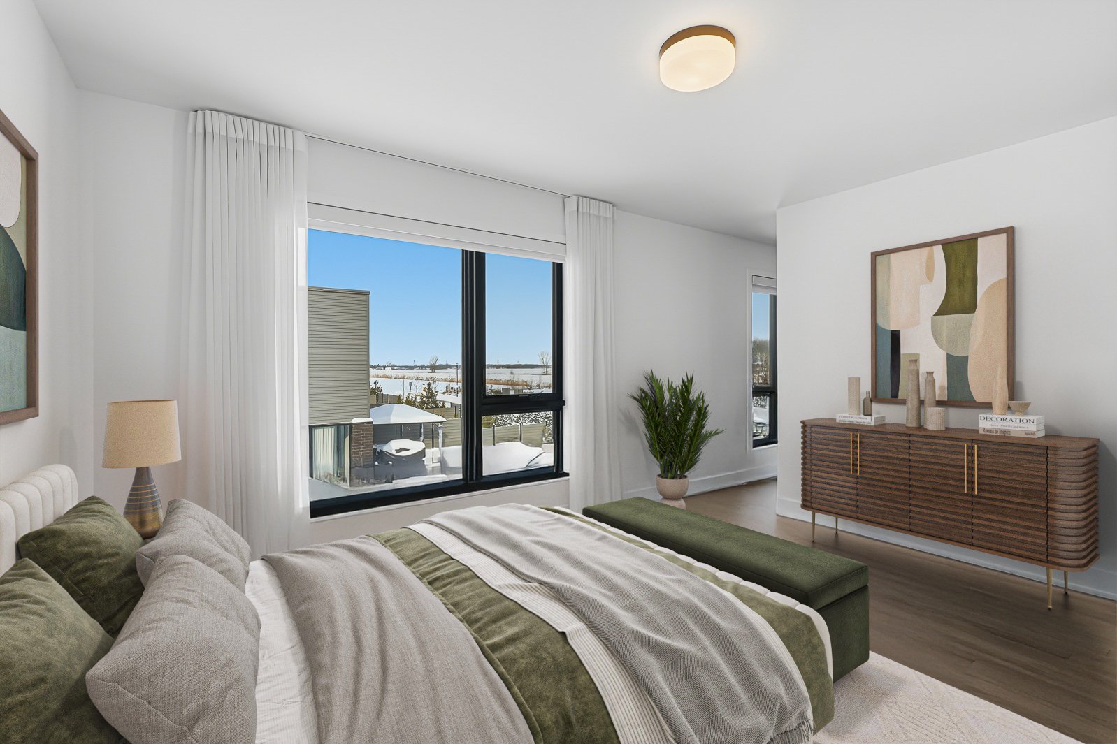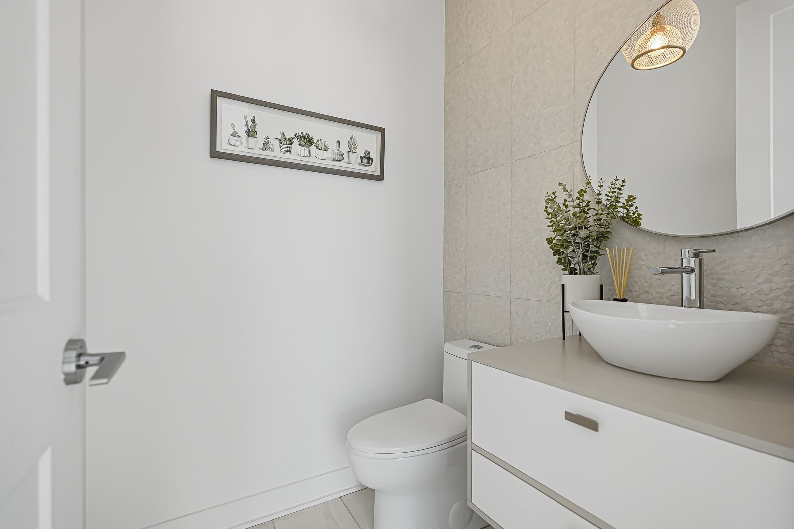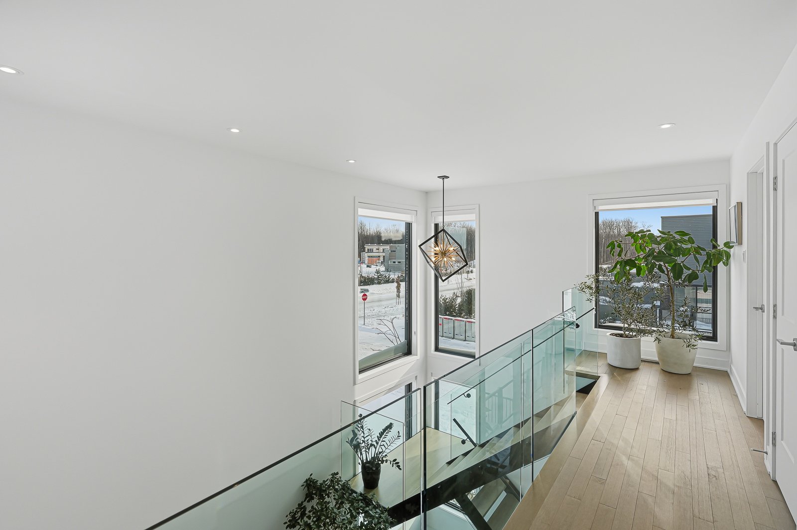 Located in a sought-after area of Sainte-Julie, this corner townhouse stands out for its private yard, contemporary design, exceptional natural light, and impressive volumes. The open-concept living area features soaring ceilings, abundant windows, and an architectural staircase with glass railings. The ground floor includes a home office, ideal for remote work or a flexible space to suit your needs. The modern kitchen impresses with its large island, clean lines, and quality materials. The bedrooms offer comfort and versatility, while the double garage provides a valuable practical advantage.
