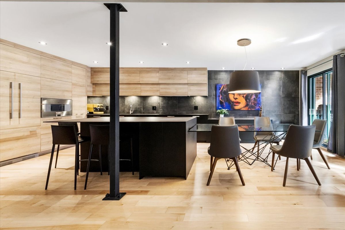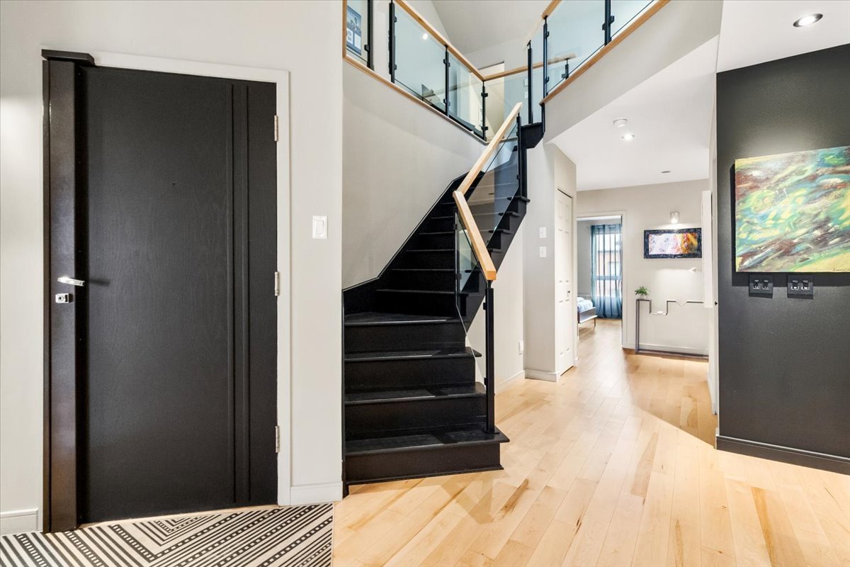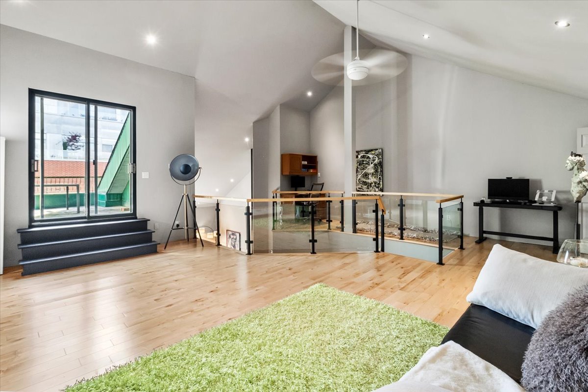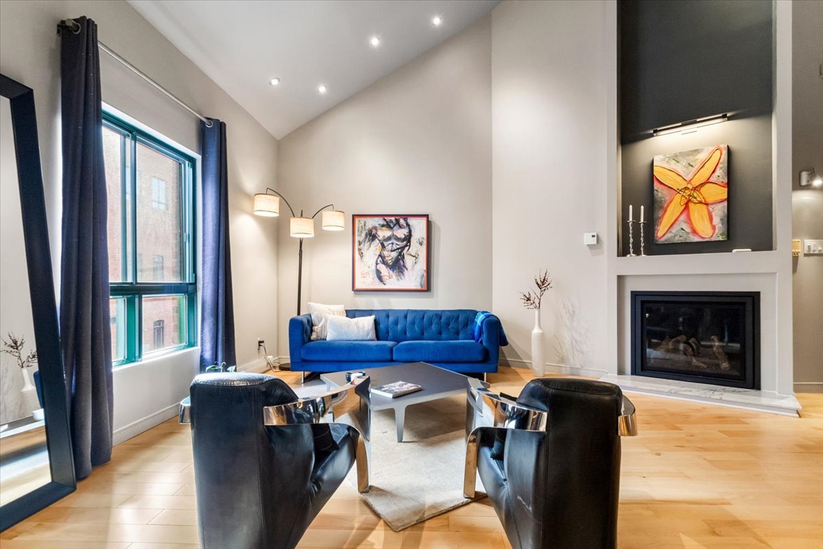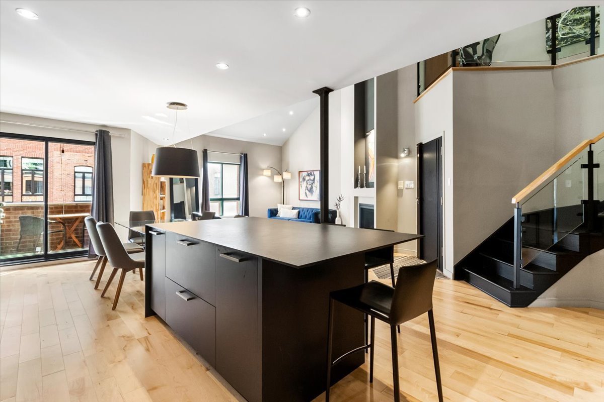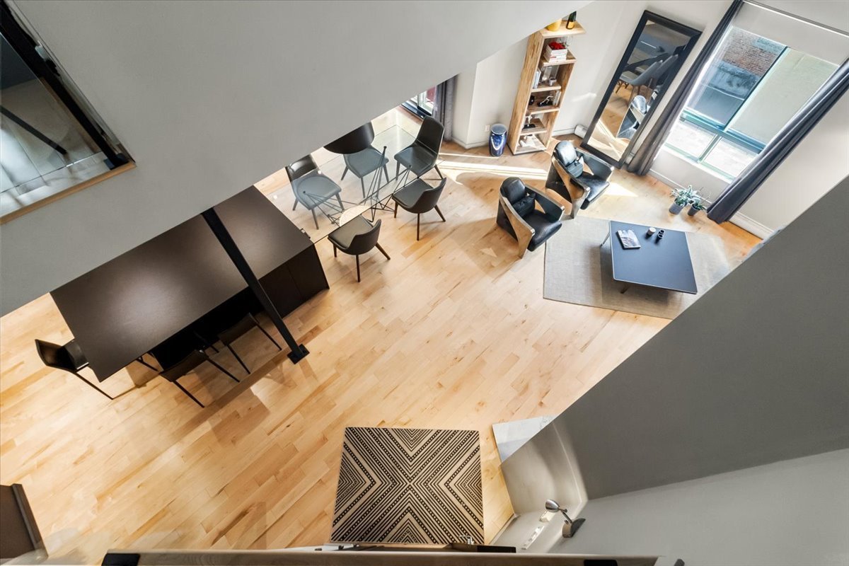 Exceptional 1,837 sq. ft. two-level penthouse in the heart of Petite-Bourgogne, just steps from Atwater Market and the Lachine Canal. Striking volume with 19-foot cathedral ceilings, hardwood floors, and a gas fireplace in an open-concept living space designed for entertaining. High-end kitchen, two bedrooms, and a versatile mezzanine ideal as a third bedroom, office, or family room. Balcony/loggia and a private terrace for comfortable outdoor living. Two wall-mounted A/C units, tandem garage parking, storage, and a shared interior courtyard. A rare address to enjoy the very best of the Atwater Market district on foot.