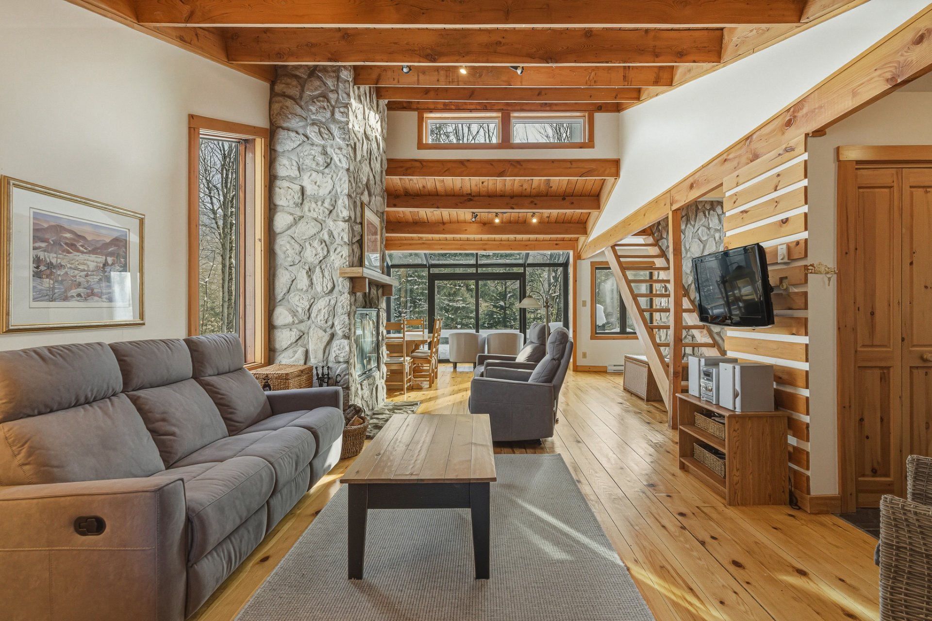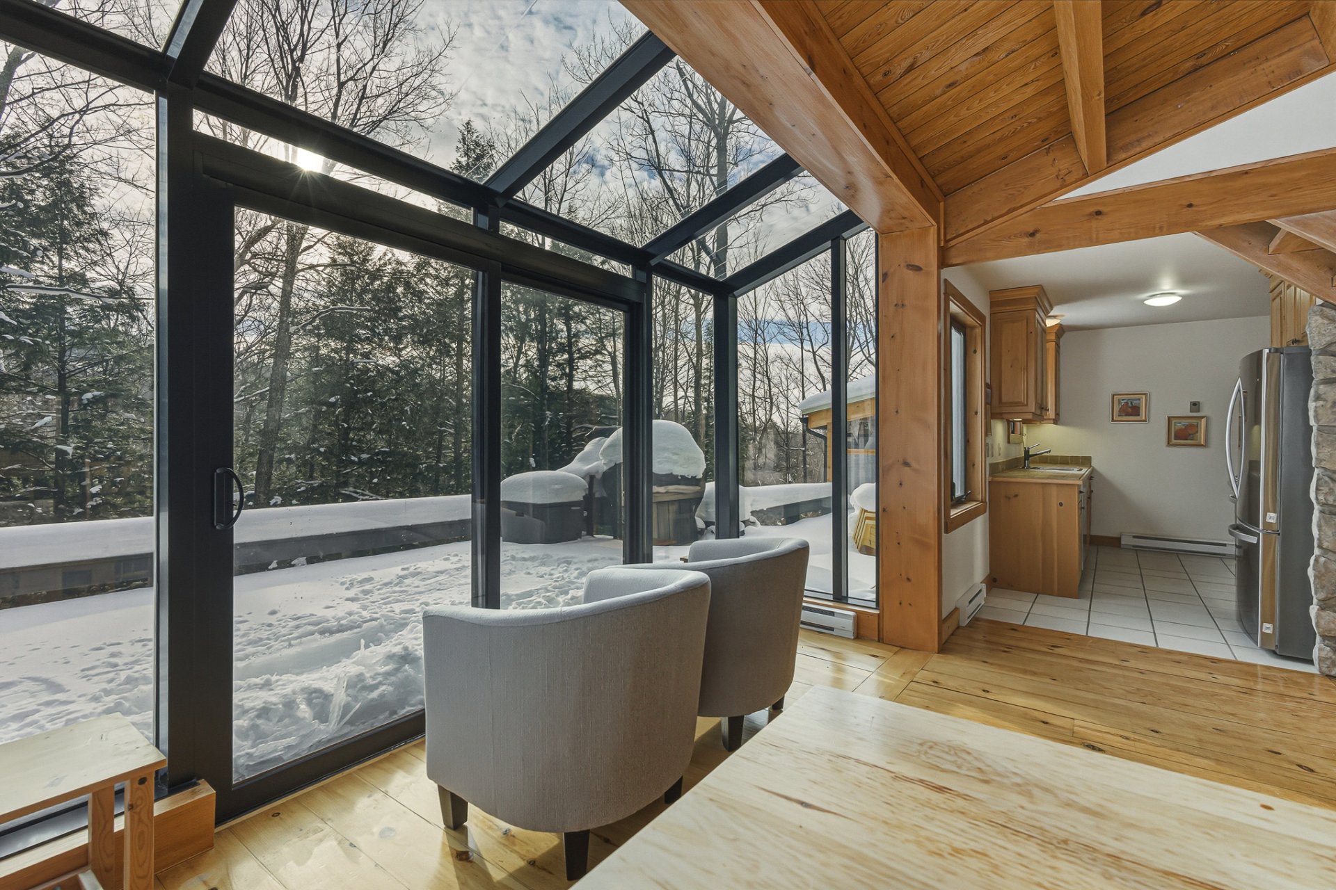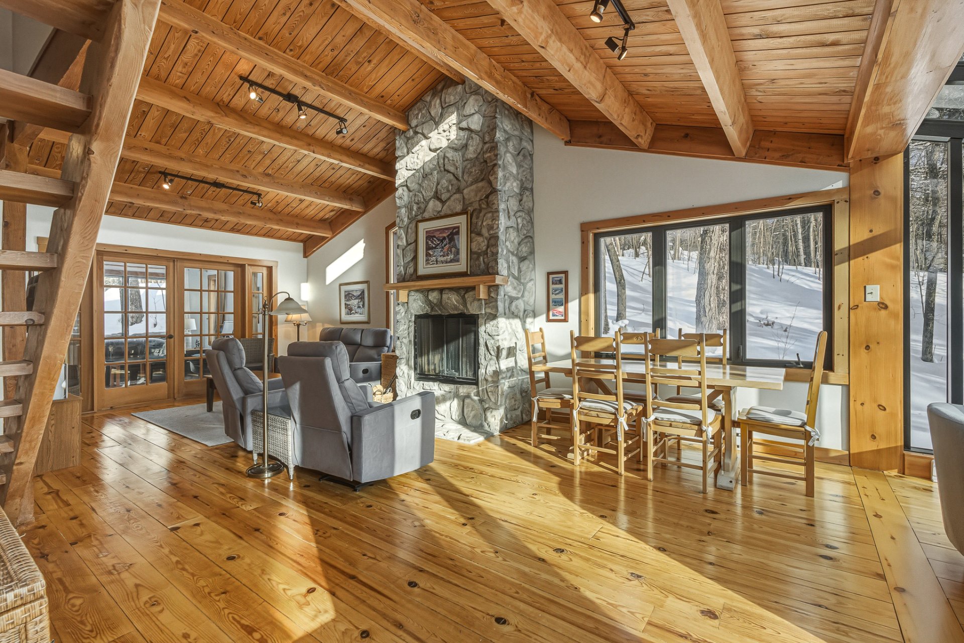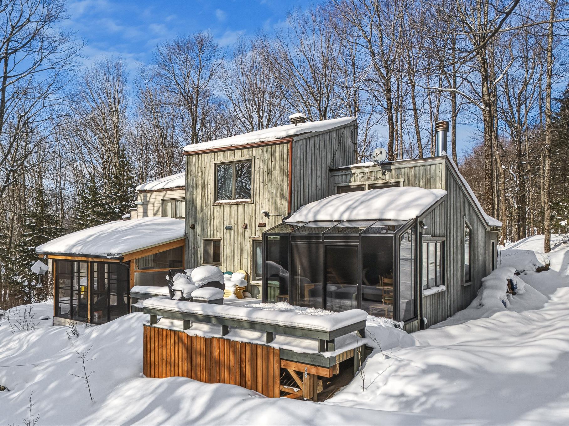 2 MINUTES FROM SKI MONT SUTTON. Contemporary mountain cabin with solid wood interior, located in an exceptional natural setting. Property backing onto the stream and Marmite aux Sorcières, with direct access to the Village-Montagne trail. Warm living areas enhanced by wood paneling, cathedral ceilings, wooden staircase, and stone fireplace. "Cocooning" guaranteed with the ski slopes as a backdrop. Functional kitchen open to the living areas with brand new appliances. Terrace and solarium offering immersion in nature and a view of the snow-covered ski slopes. 3 bedrooms and 2 bathrooms.