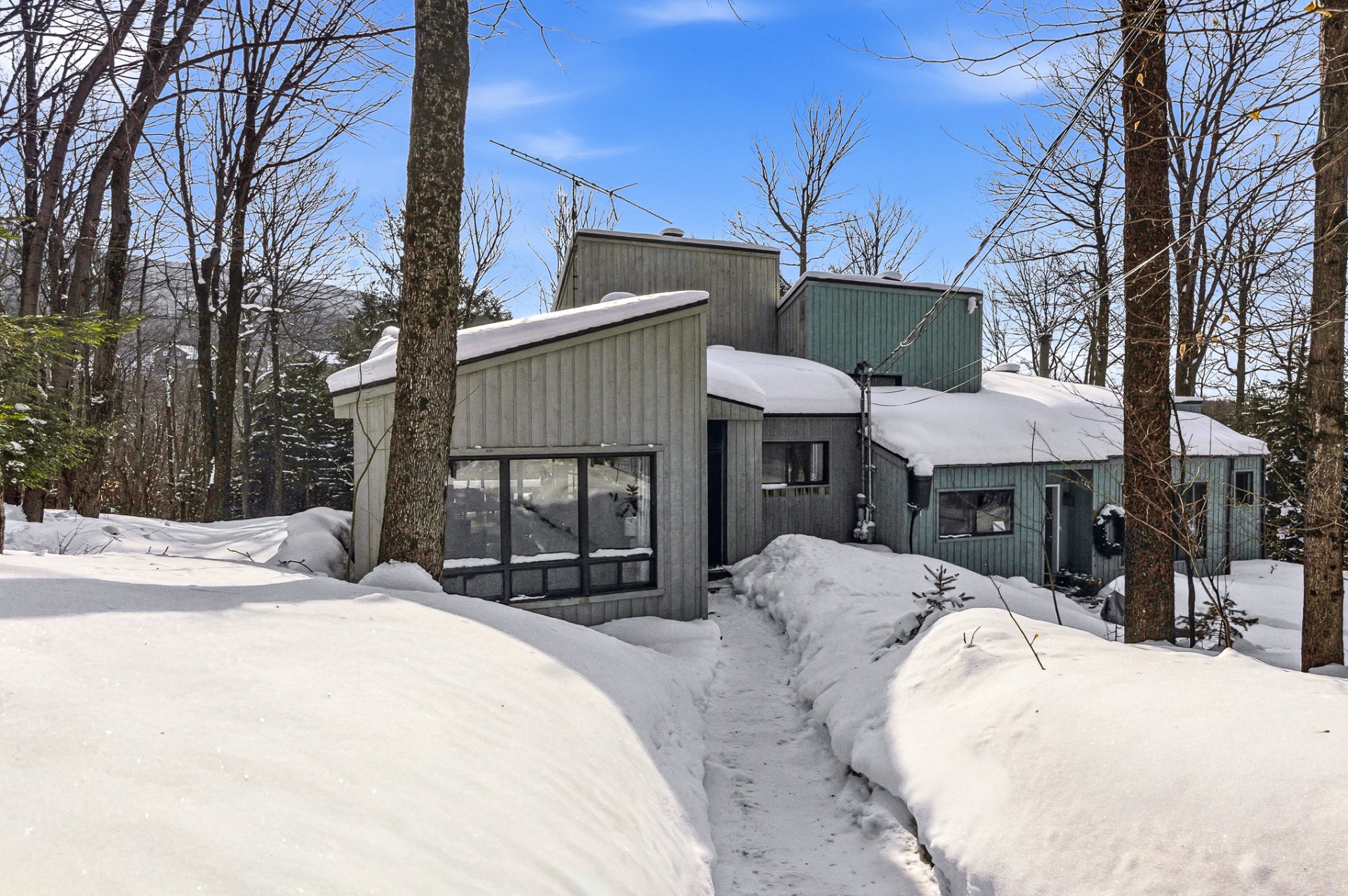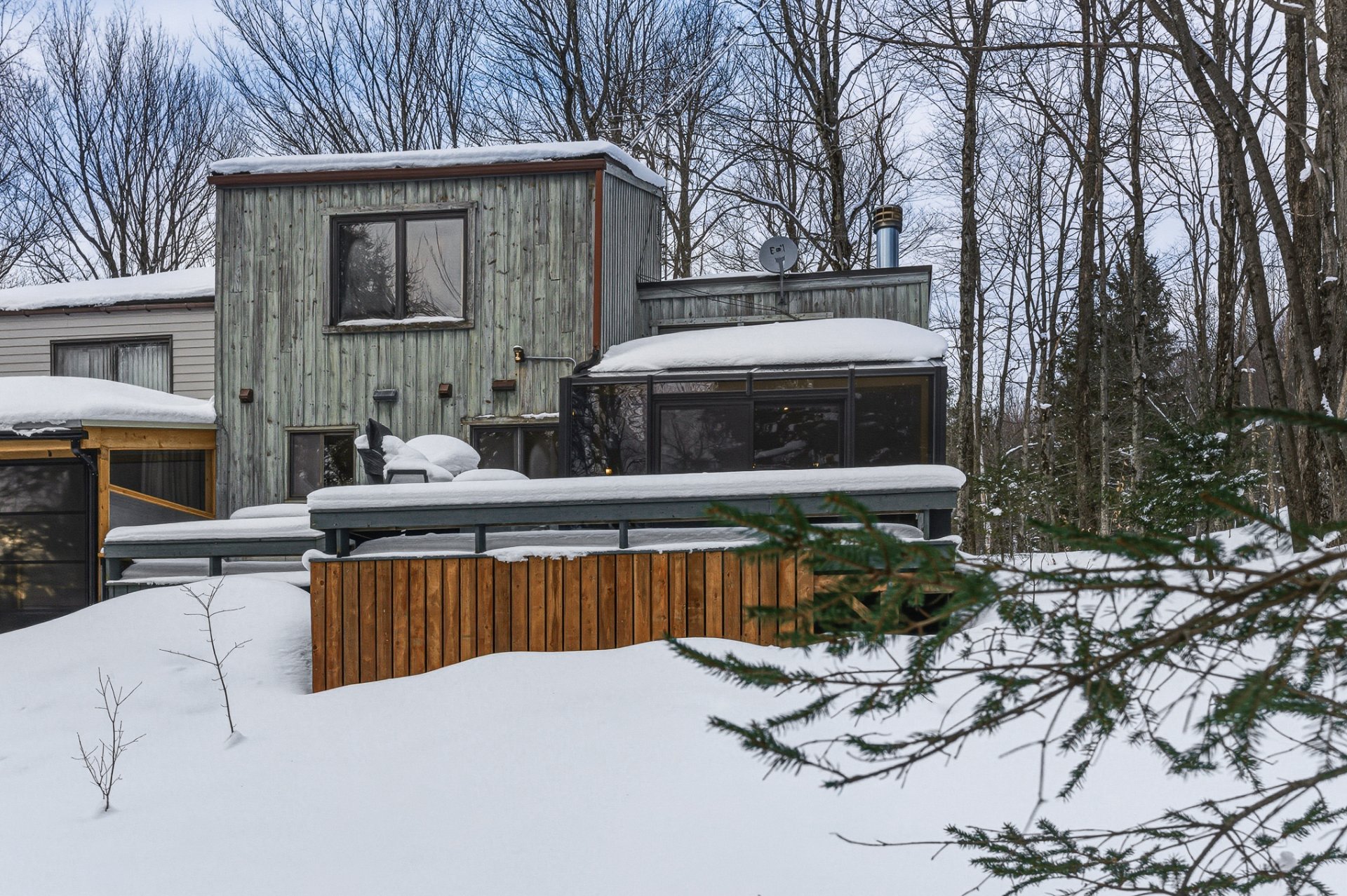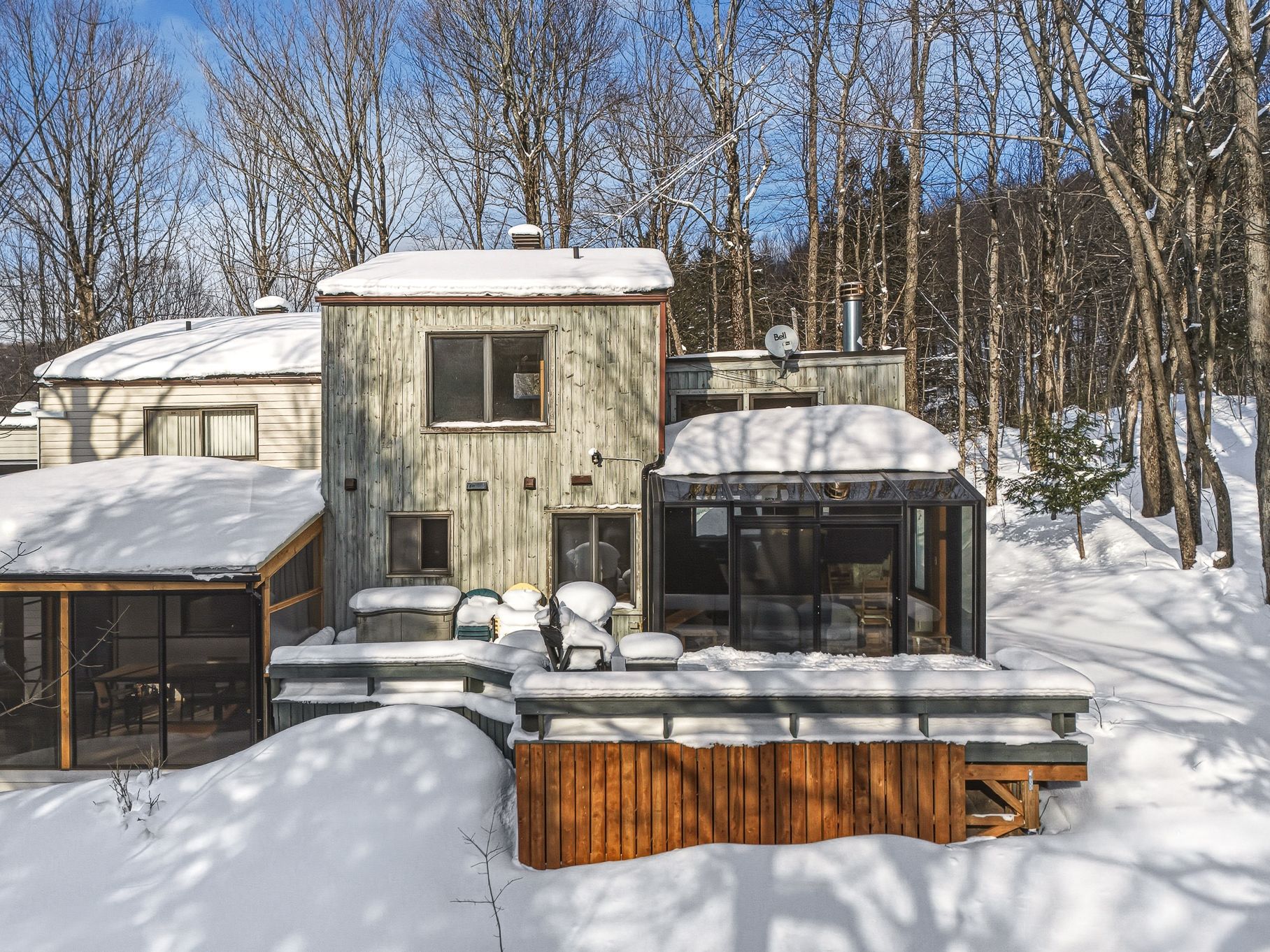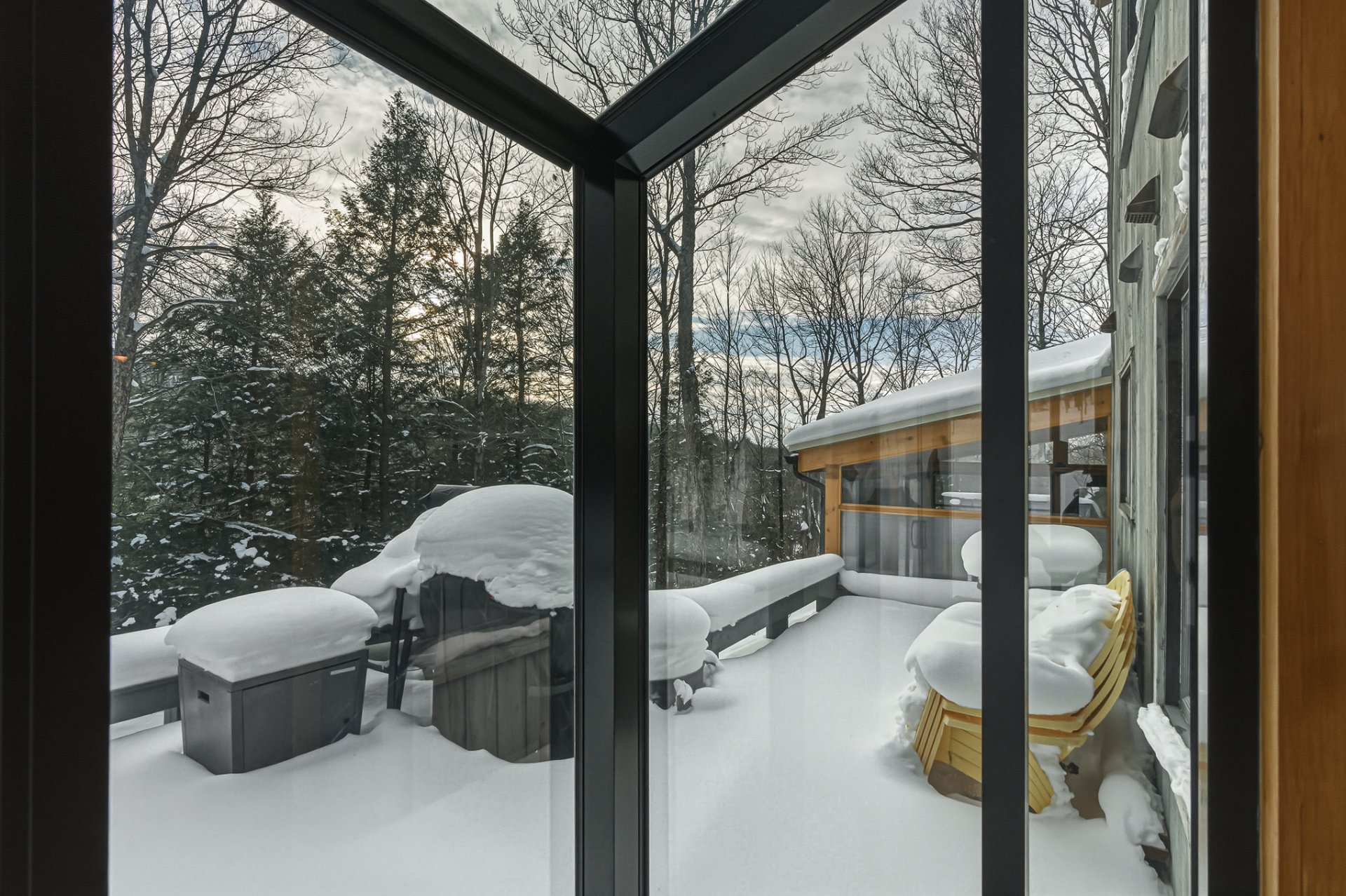 2 MINUTES FROM SKI MONT SUTTON. Contemporary mountain cabin with solid wood interior, located in an exceptional natural setting. Property backing onto the stream and Marmite aux Sorcières, with direct access to the Village-Montagne trail. Warm living areas enhanced by wood paneling, cathedral ceilings, wooden staircase, and stone fireplace. "Cocooning" guaranteed with the ski slopes as a backdrop. Functional kitchen open to the living areas with brand new appliances. Terrace and solarium offering immersion in nature and a view of the snow-covered ski slopes. 3 bedrooms and 2 bathrooms.