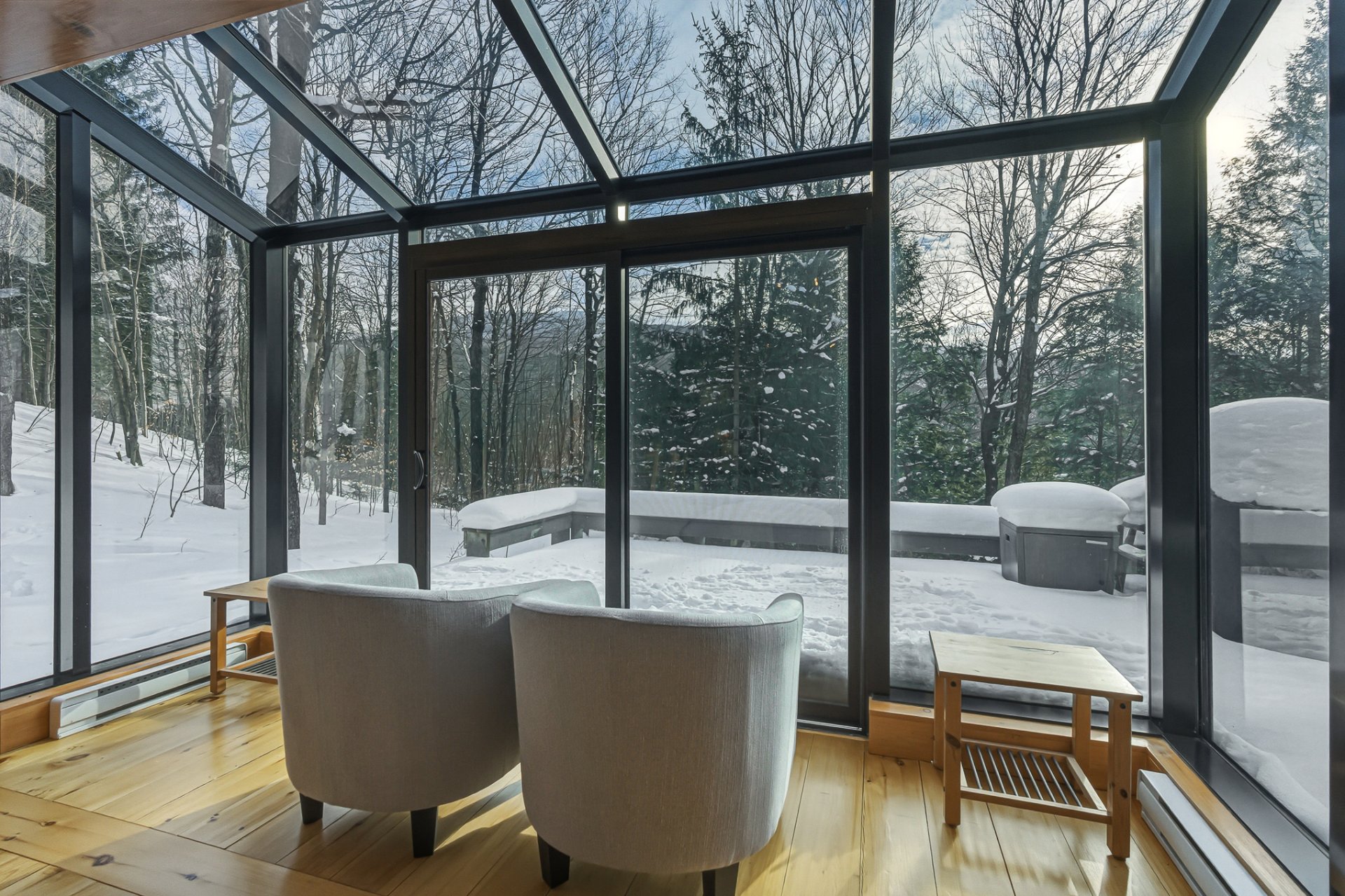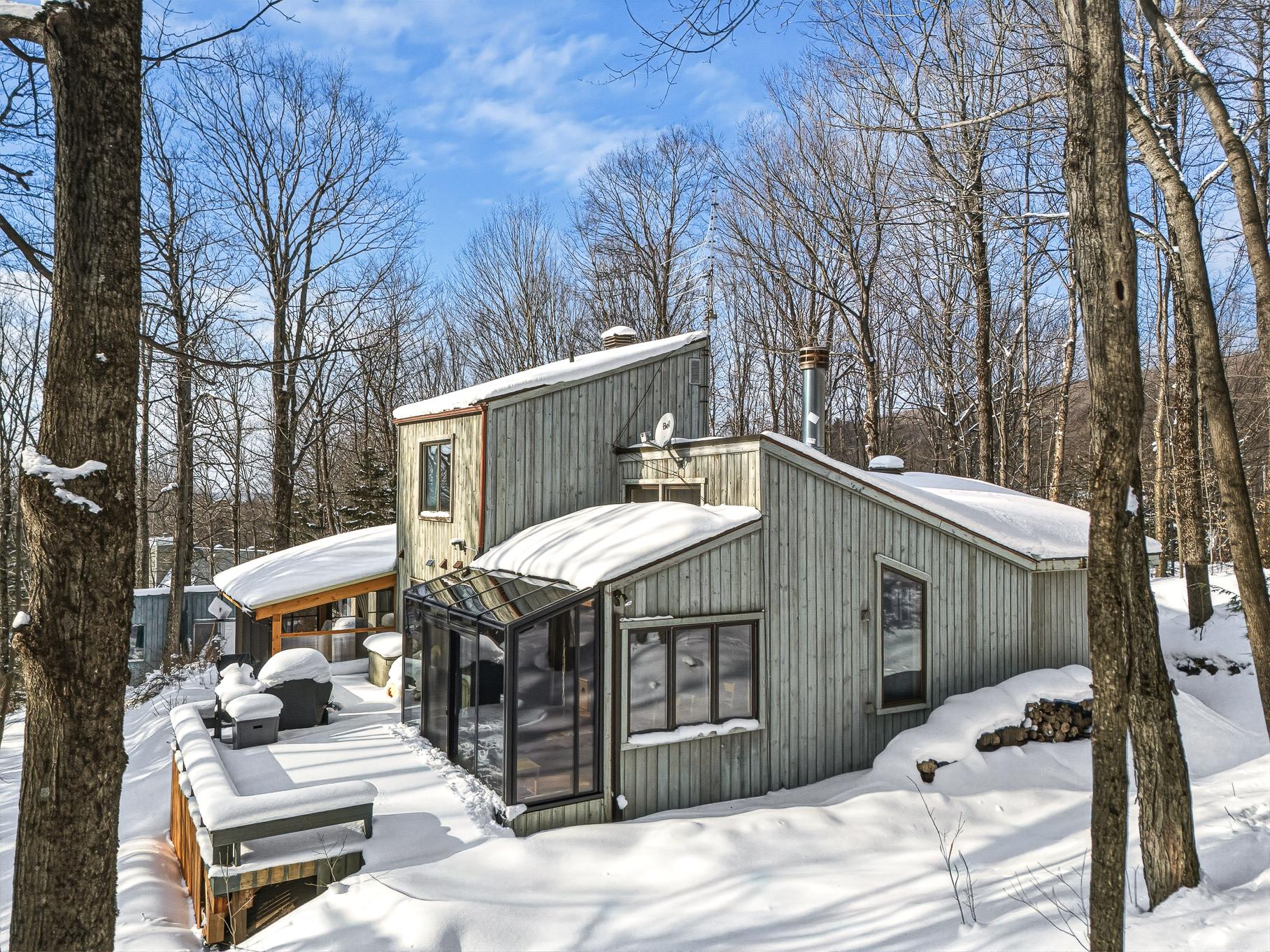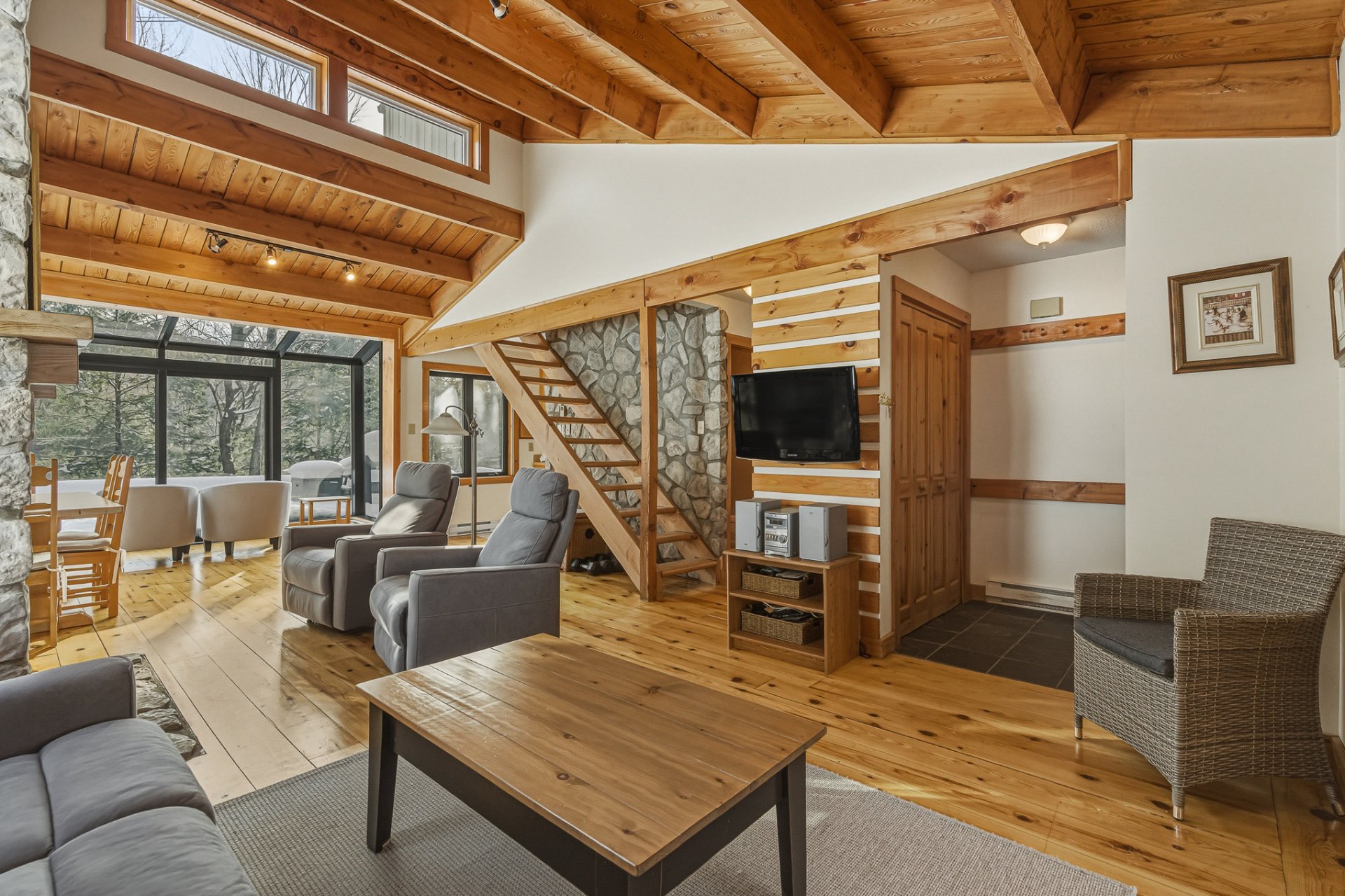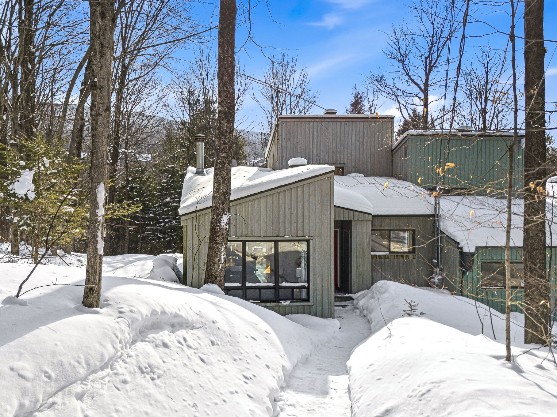 2 MINUTES FROM SKI MONT SUTTON. Contemporary mountain cabin with solid wood interior, located in an exceptional natural setting. Property backing onto the stream and Marmite aux Sorcières, with direct access to the Village-Montagne trail. Warm living areas enhanced by wood paneling, cathedral ceilings, wooden staircase, and stone fireplace. "Cocooning" guaranteed with the ski slopes as a backdrop. Functional kitchen open to the living areas with brand new appliances. Terrace and solarium offering immersion in nature and a view of the snow-covered ski slopes. 3 bedrooms and 2 bathrooms.
