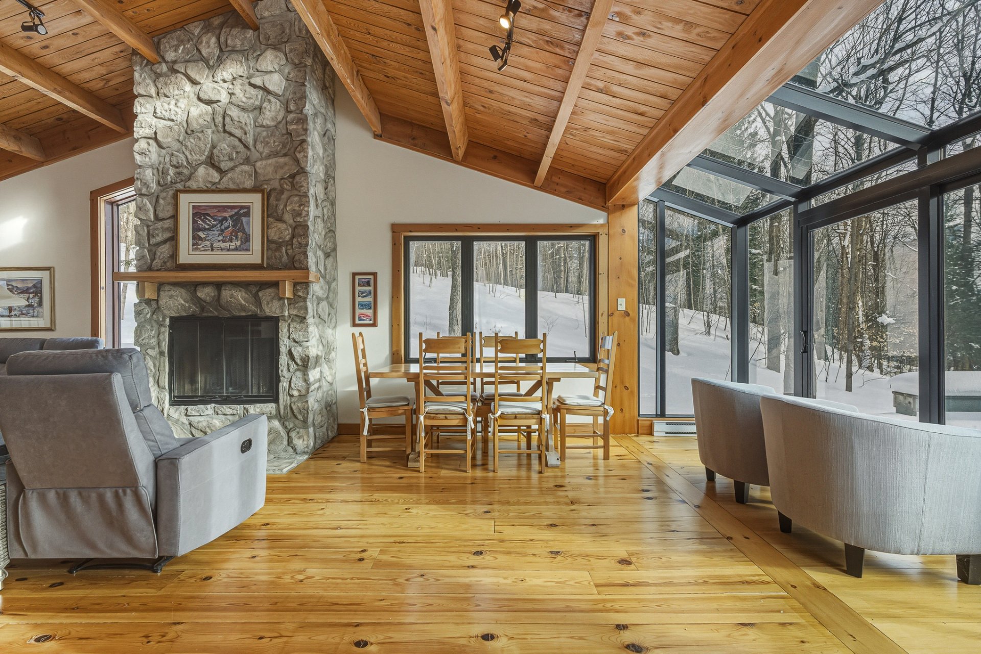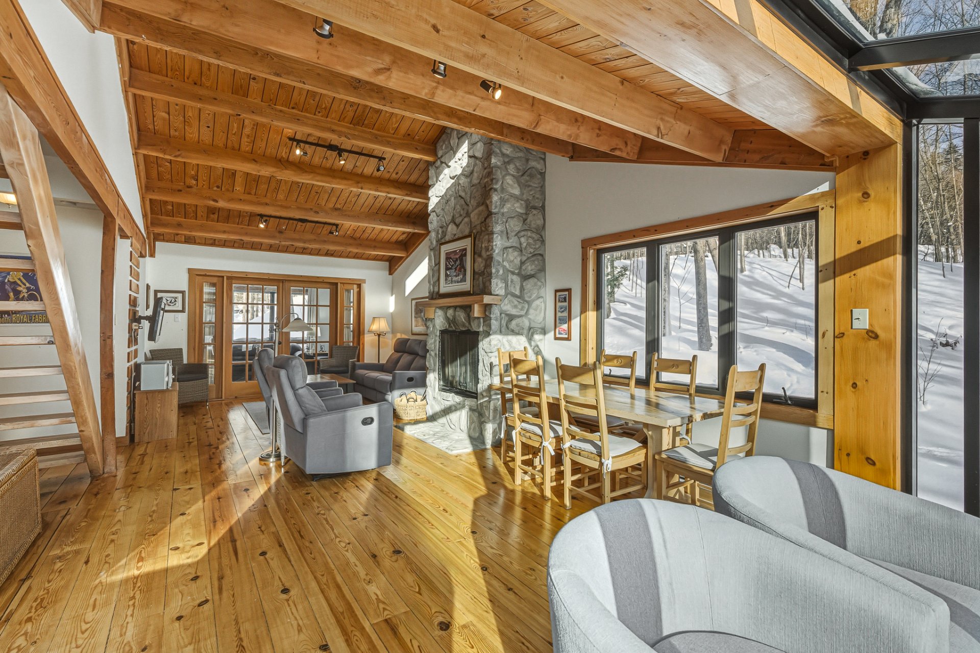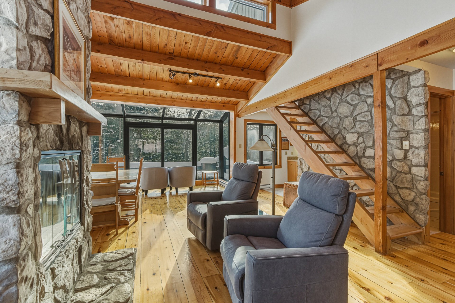 From the moment you enter, the bright and inviting living spaces captivate with their abundant wood finishes, cathedral ceilings, and stone fireplace, creating a warm, elegant, and timeless atmosphere. The functional kitchen, open to the living areas, integrates seamlessly into the space and is perfectly suited for entertaining and shared moments.