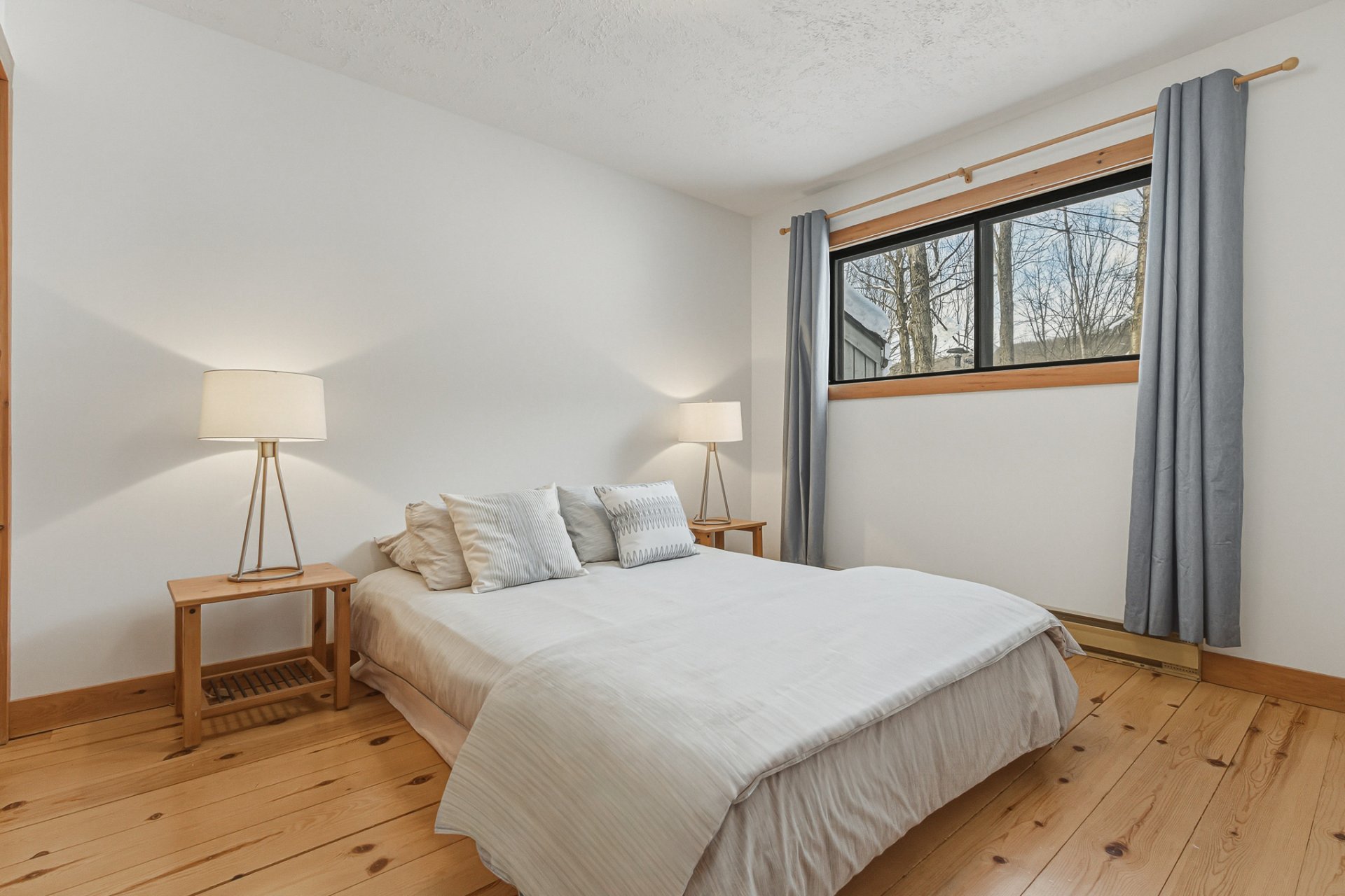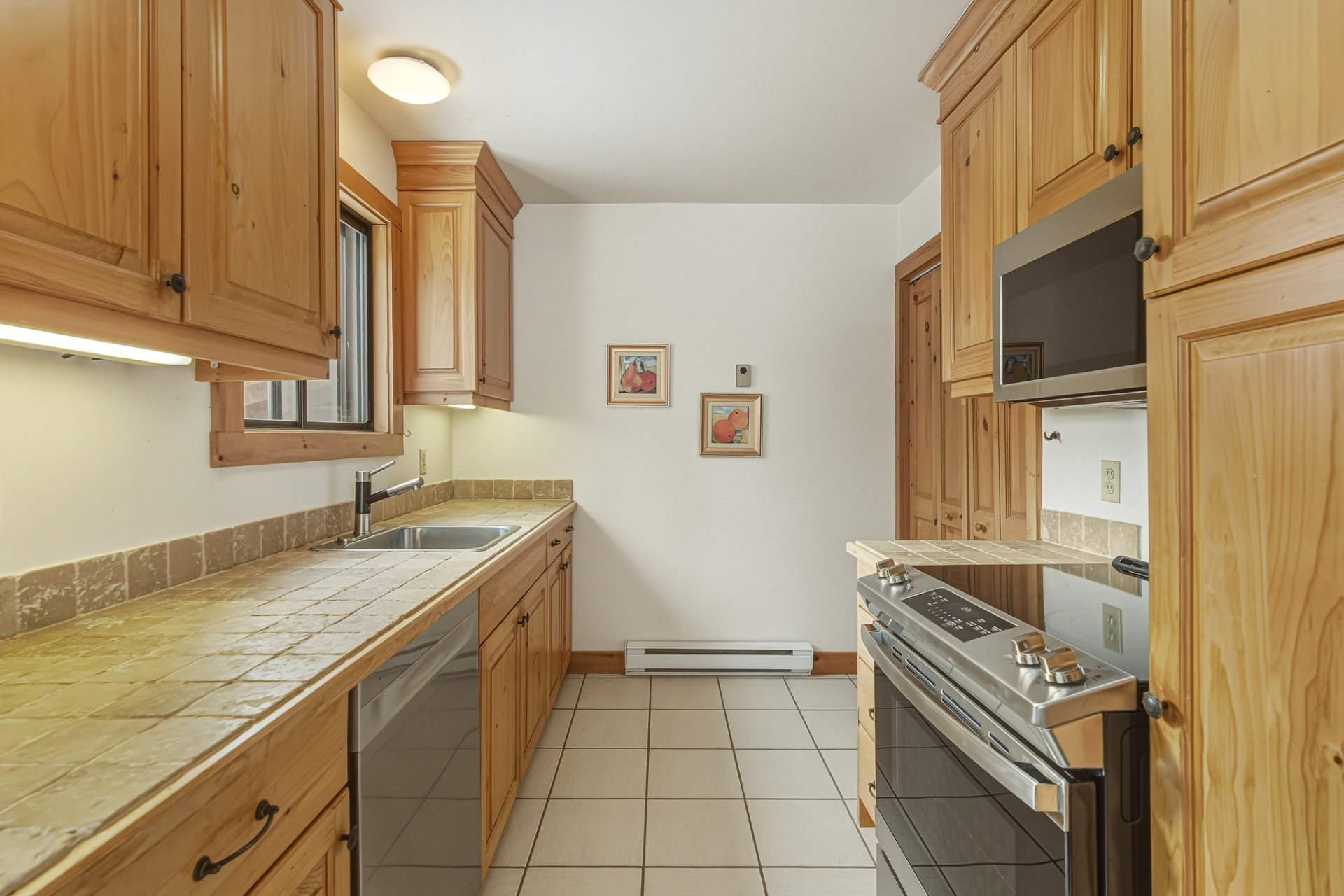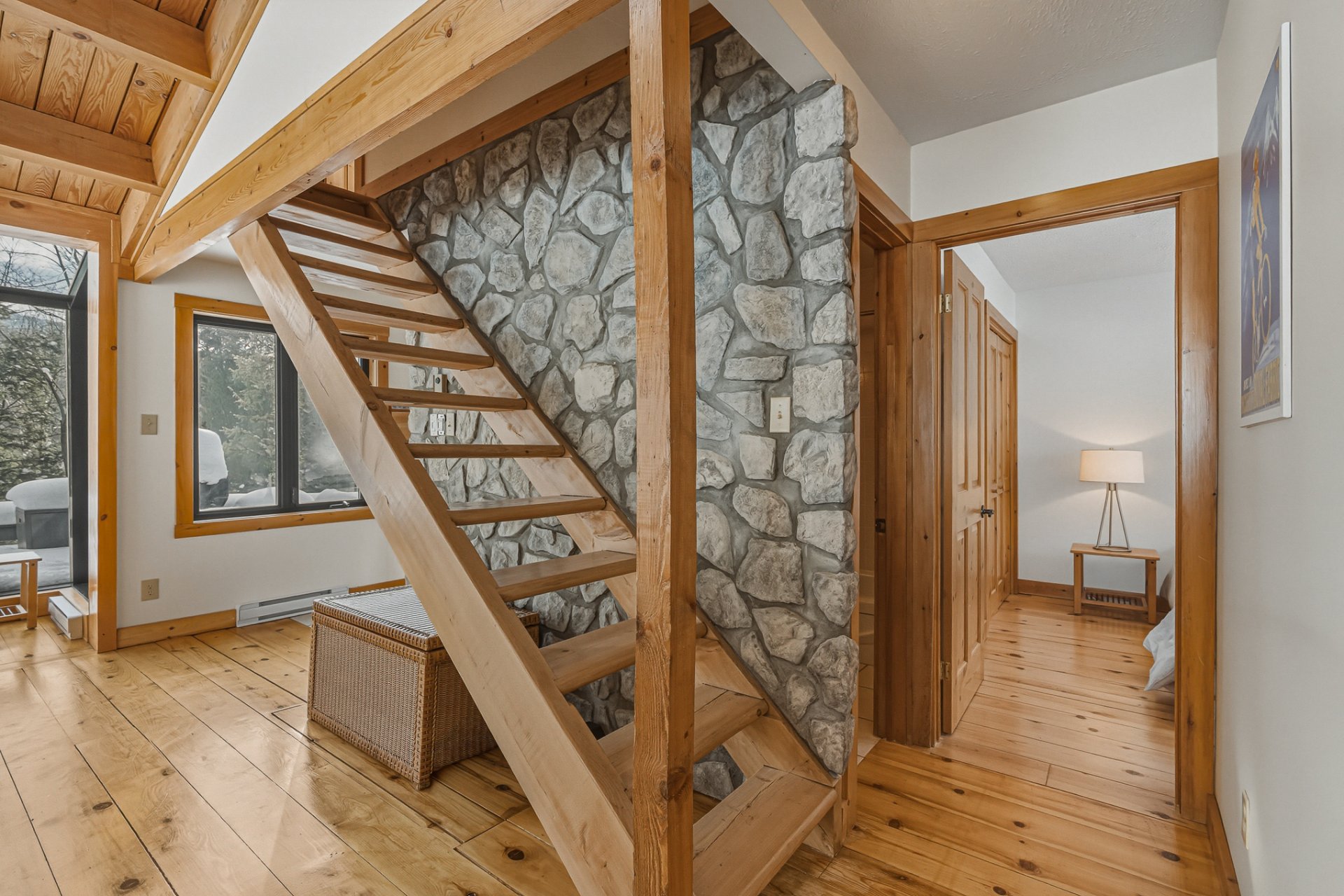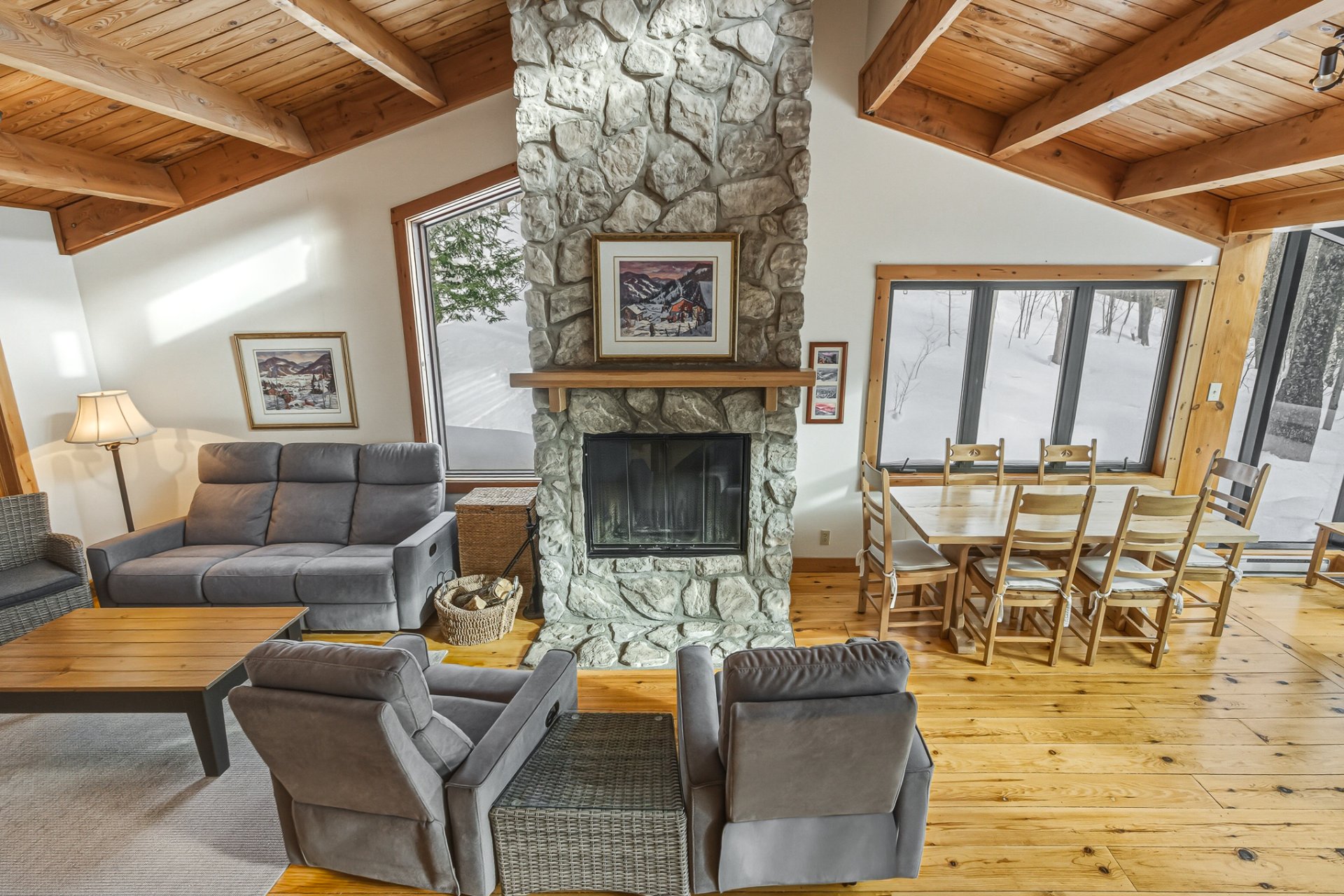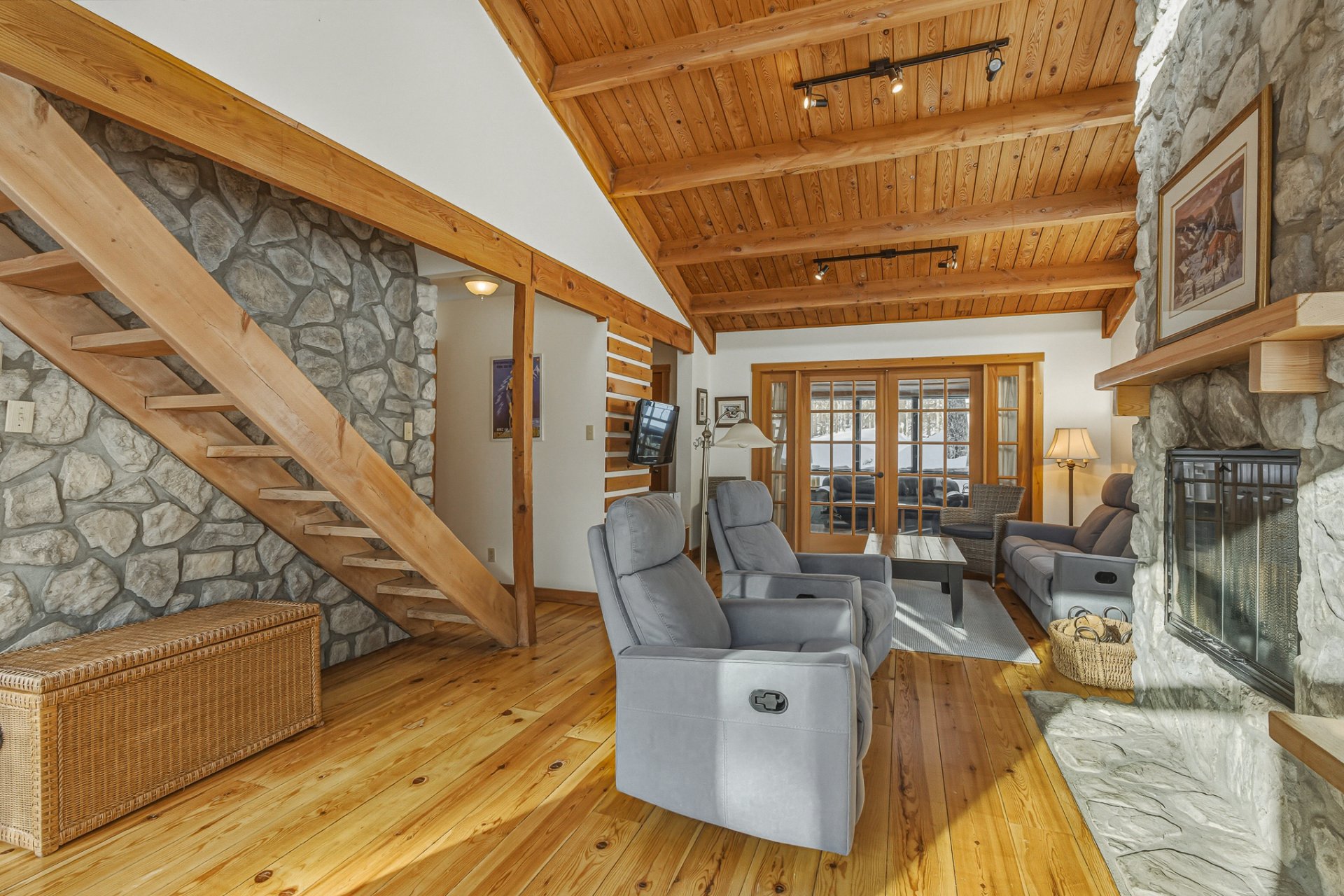 * Warm living spaces with wood finishes, cathedral ceilings, and stone fireplace