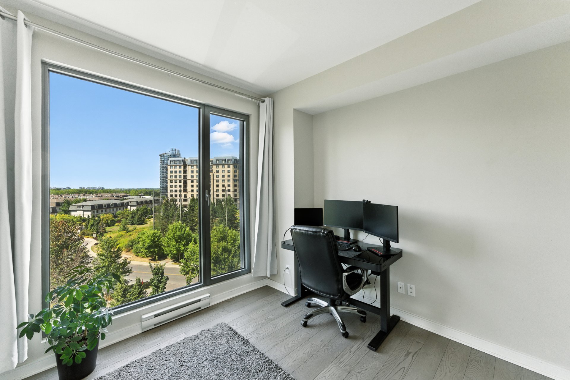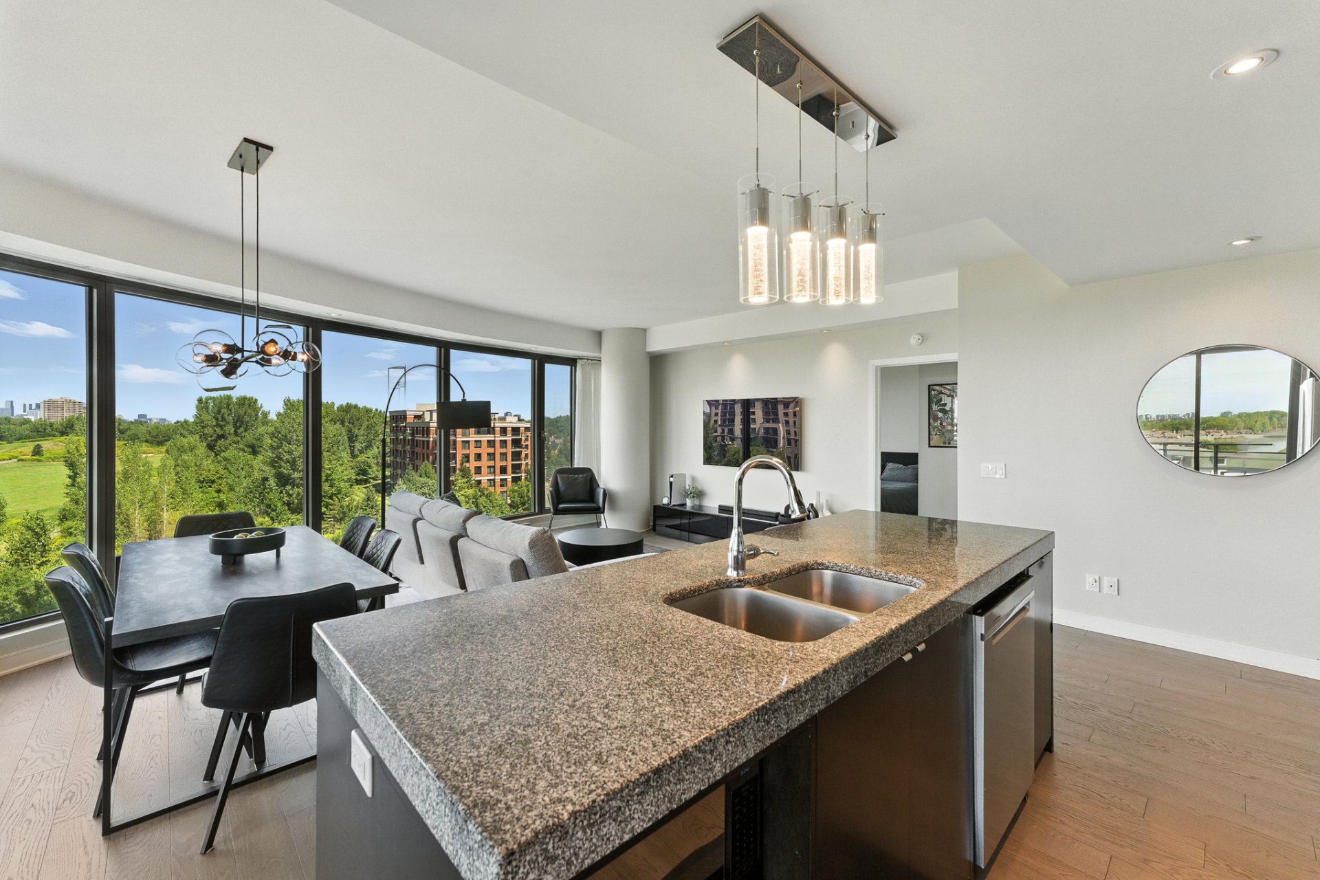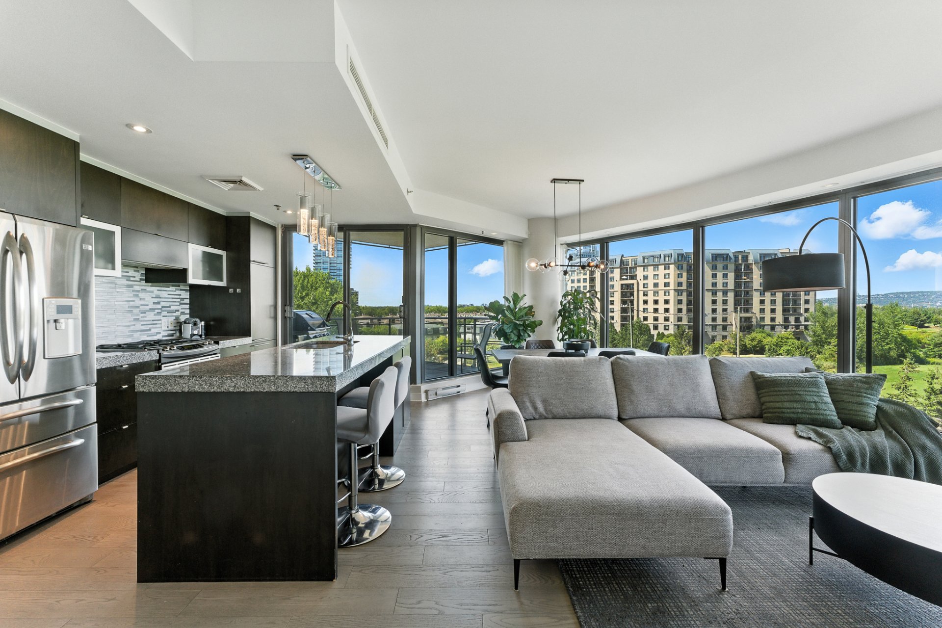 Elegant and move-in ready corner condo on the 6th floor of Vistal II (LEED-certified). Bright and spacious with panoramic golf-course and downtown views--so unique and ever-changing you'll never tire of them. Owner-occupied, freshly painted (Oct 2025), with modern flooring (2021) and a new cooling system (2025). Features two spacious bedrooms and two full bathrooms, high ceilings, and a private balcony. Enjoy resort-style amenities, forested nature trails, and quick access to downtown Montréal.