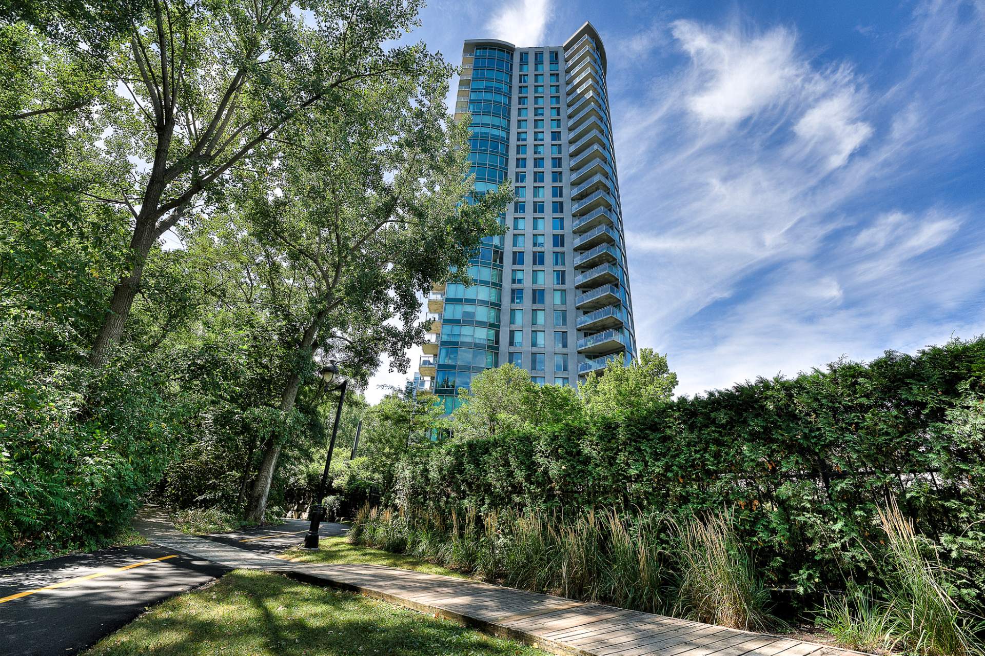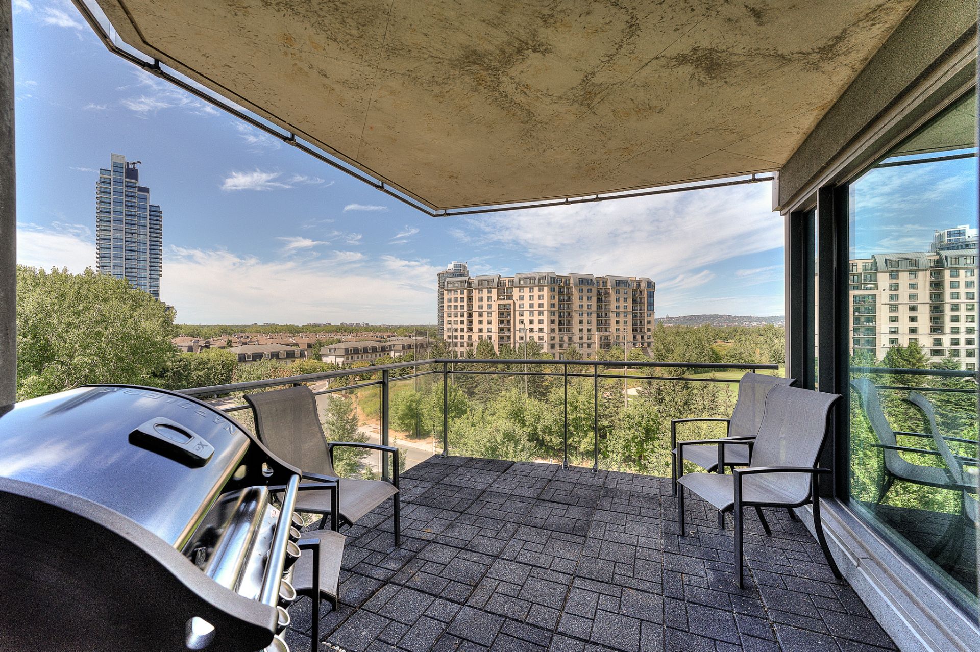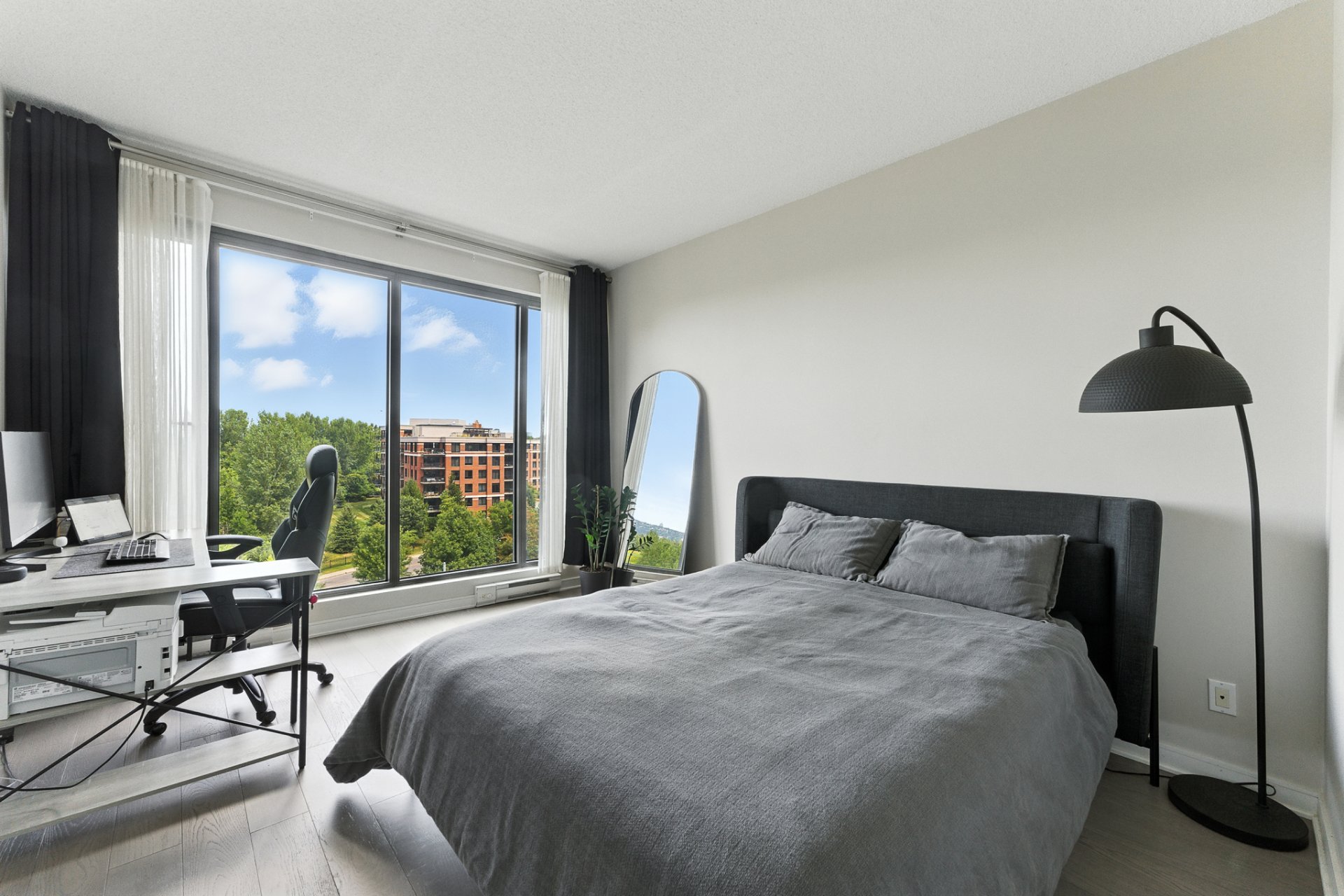 Elegant and move-in ready corner condo on the 6th floor of Vistal II (LEED-certified). Bright and spacious with panoramic golf-course and downtown views--so unique and ever-changing you'll never tire of them. Owner-occupied, freshly painted (Oct 2025), with modern flooring (2021) and a new cooling system (2025). Features two spacious bedrooms and two full bathrooms, high ceilings, and a private balcony. Enjoy resort-style amenities, forested nature trails, and quick access to downtown Montréal.