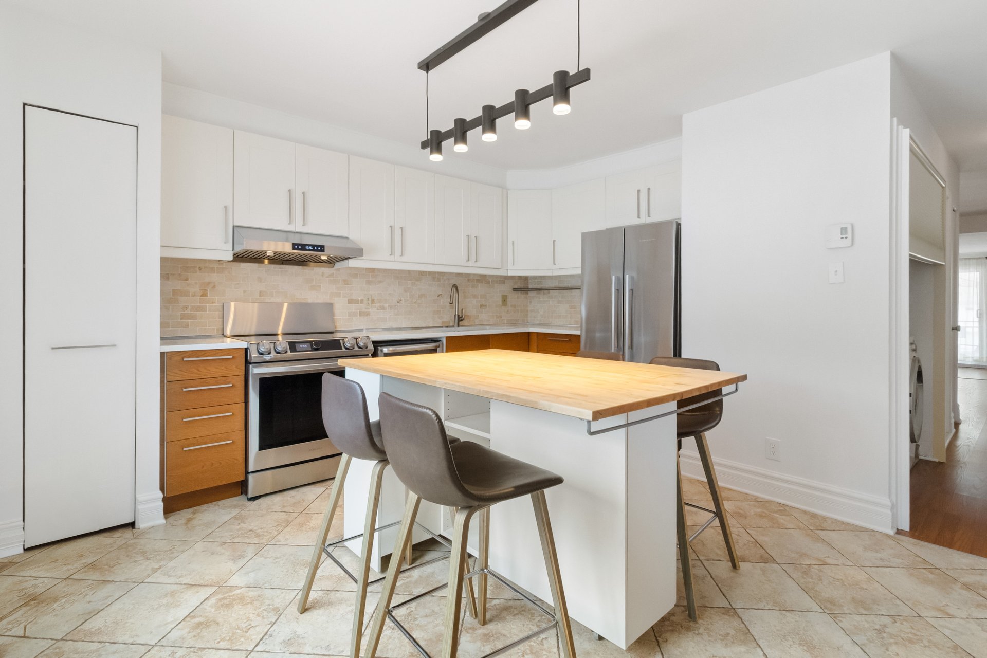 - Refrigerator, stove, washer, dryer, wine fridge, movable kitchen island, light fixtures, curtains and rods.