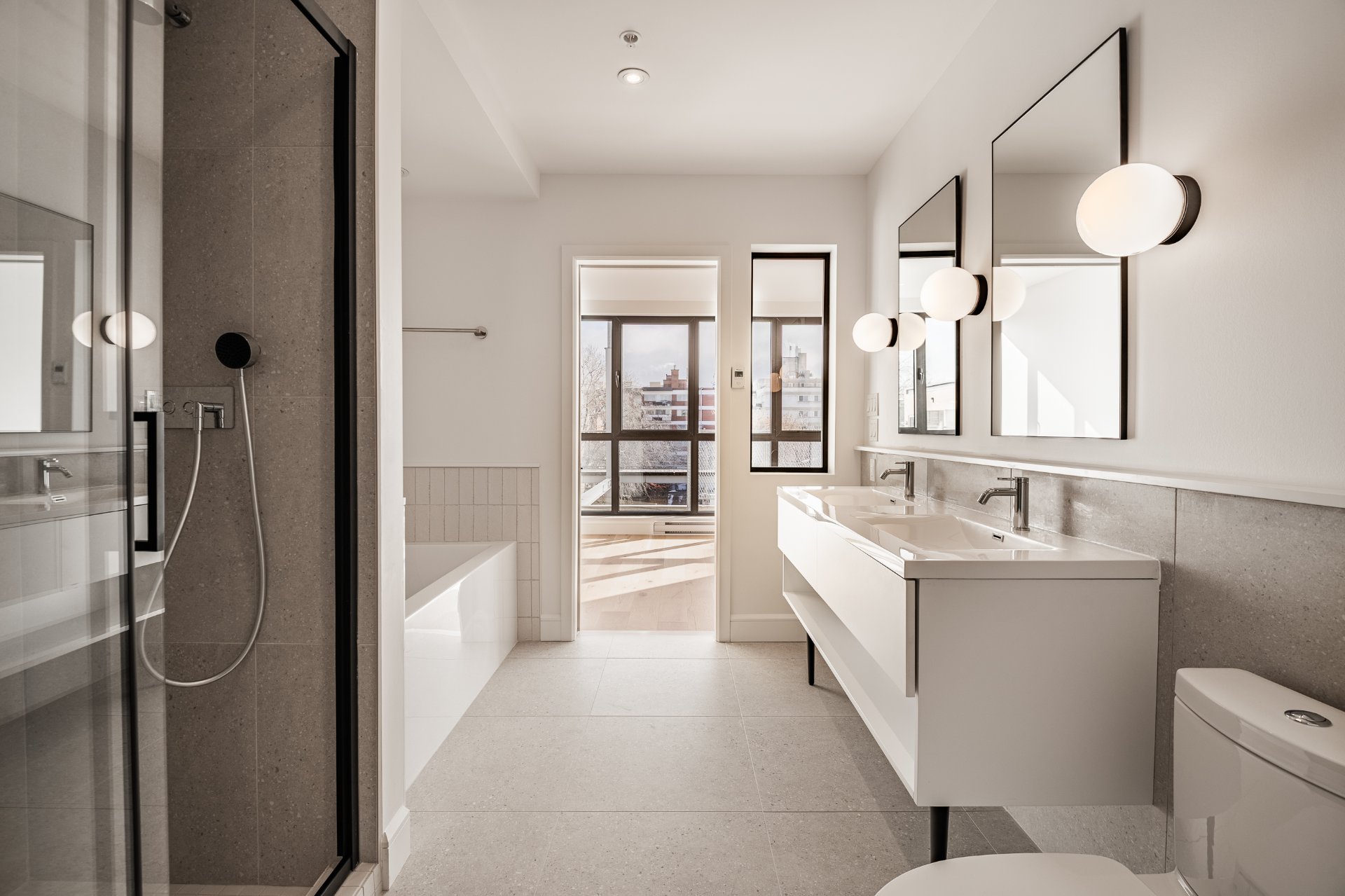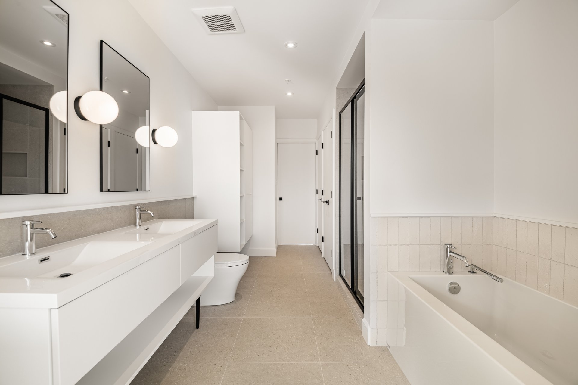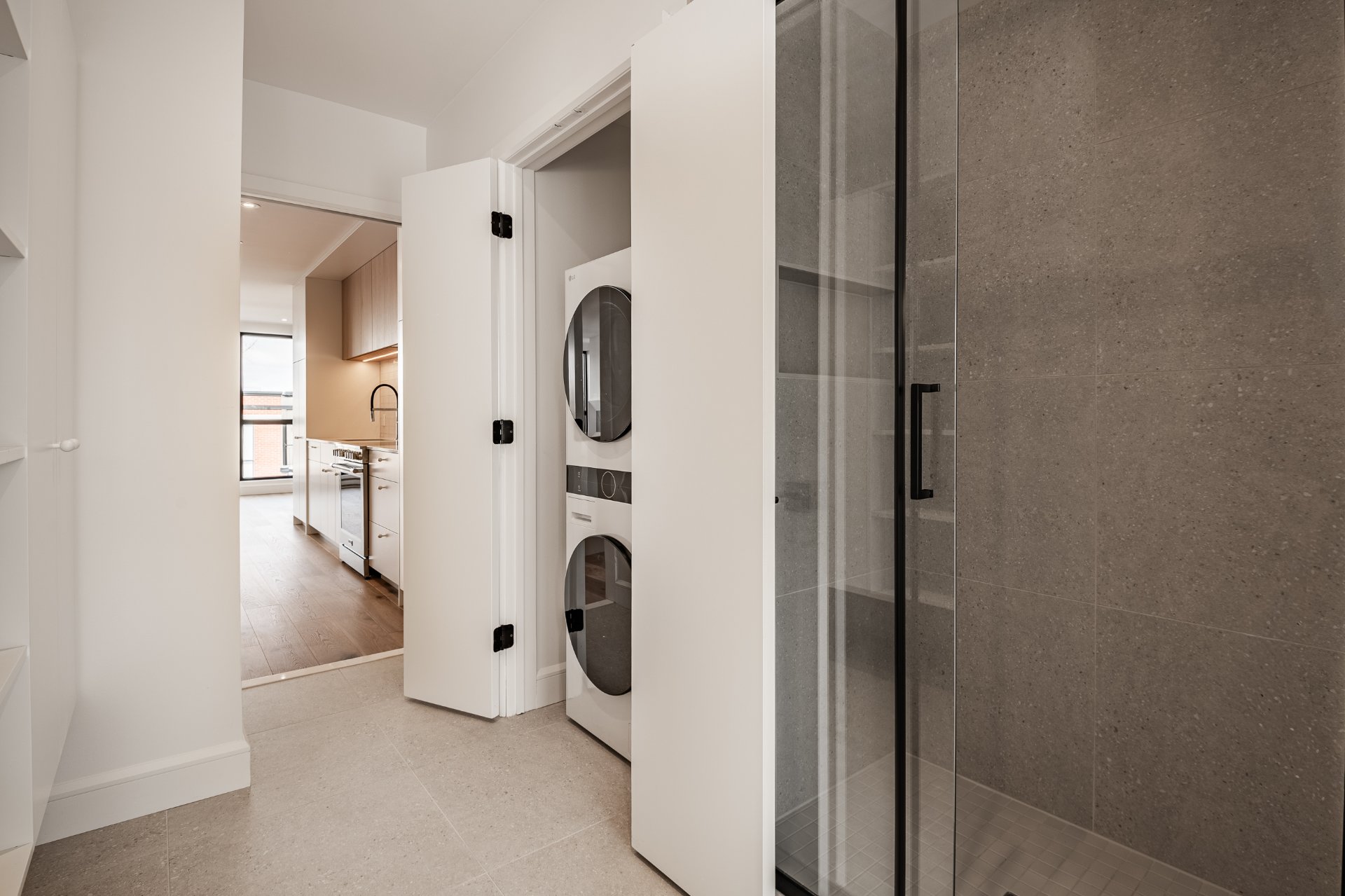 The bathroom is elegant and functional, featuring a double vanity, glass-enclosed shower, modern bathtub and integrated storage. A closed washer-dryer area adds everyday convenience.