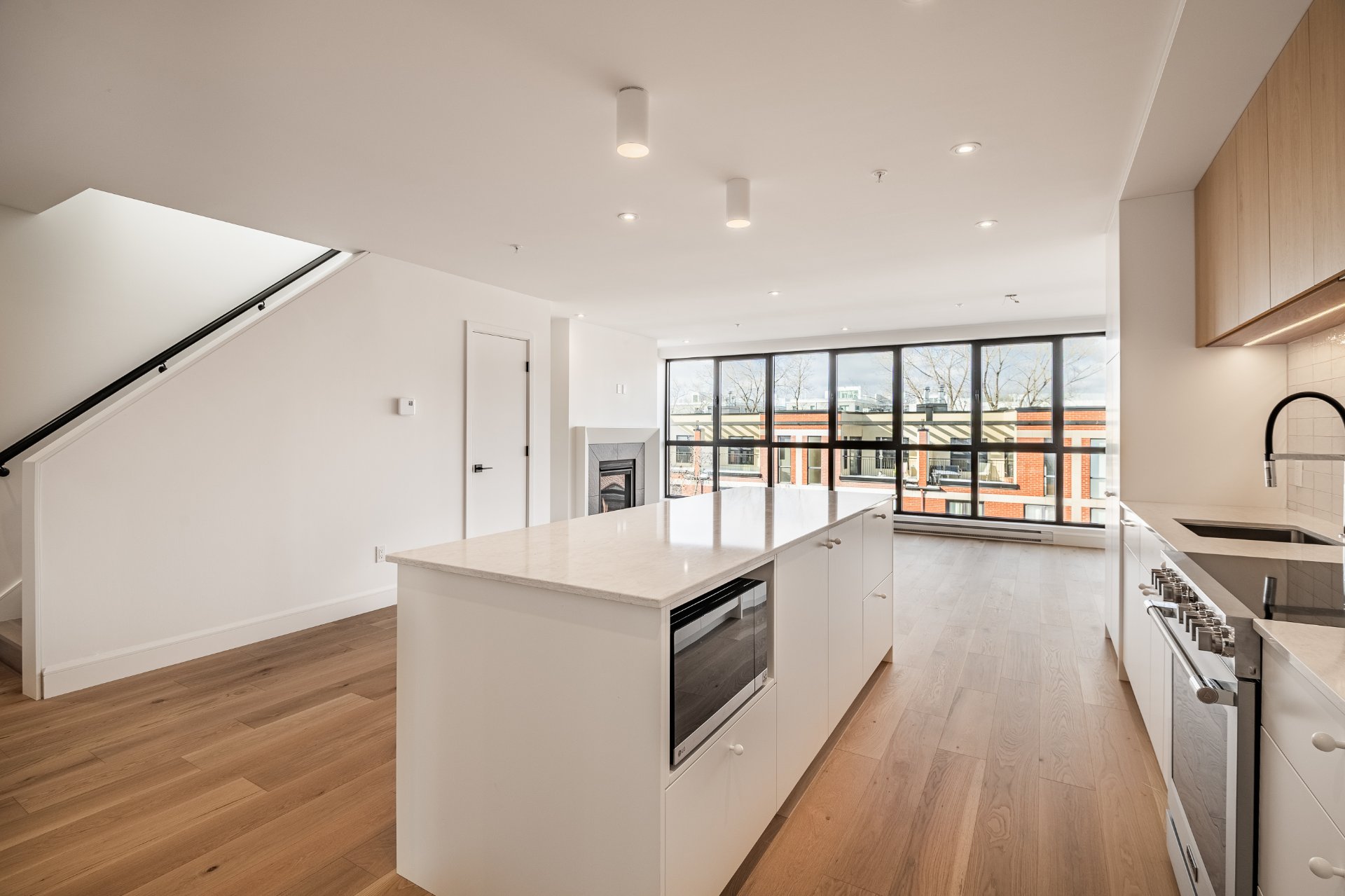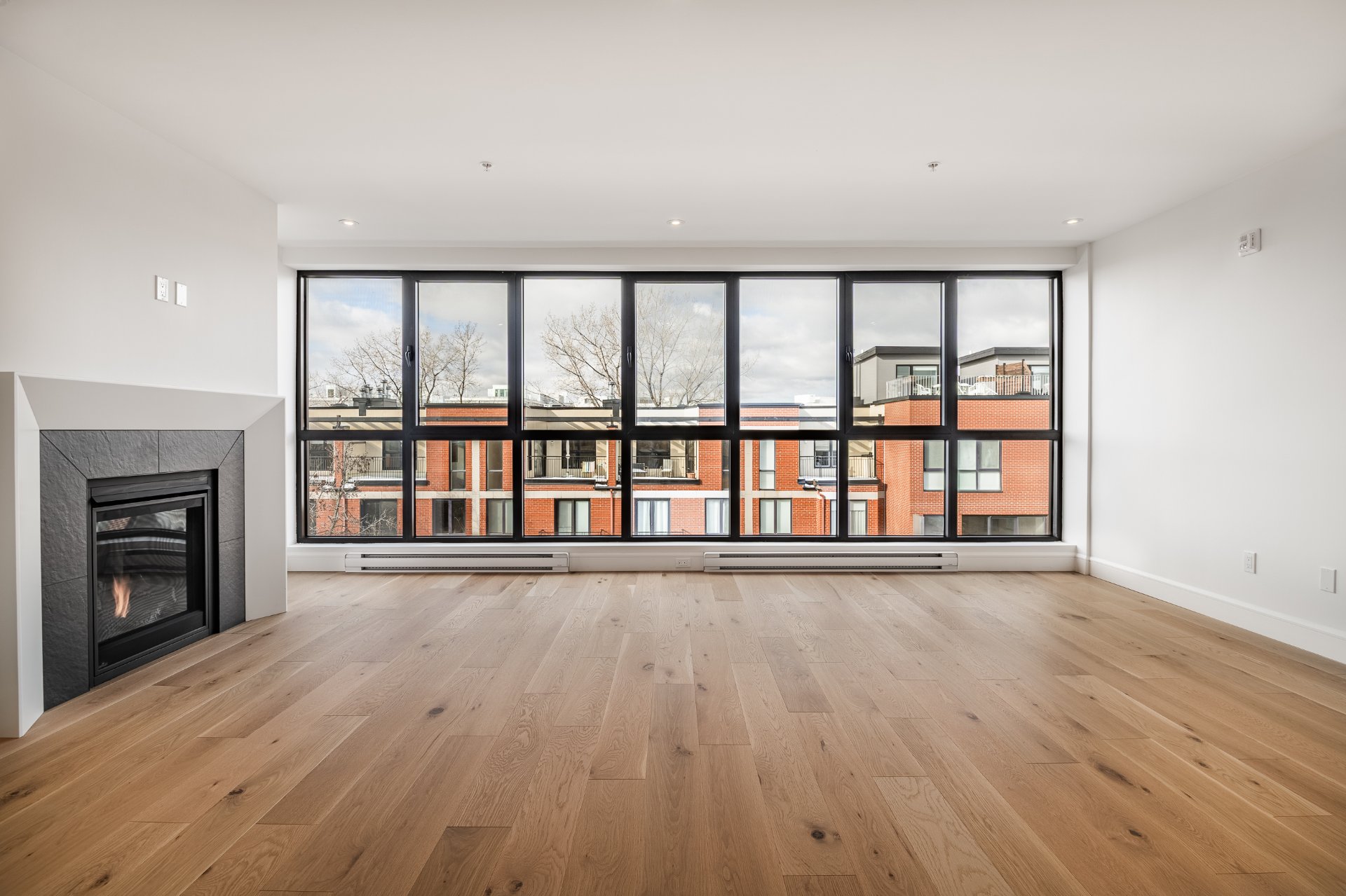 From the moment you enter, the open-concept living area impresses with its generous volume and full window wall, flooding the living room, dining area and primary bedroom with natural light. The living room is warm and inviting, featuring a gas fireplace. The modern kitchen, equipped with a central island, provides a practical space for cooking and entertaining.