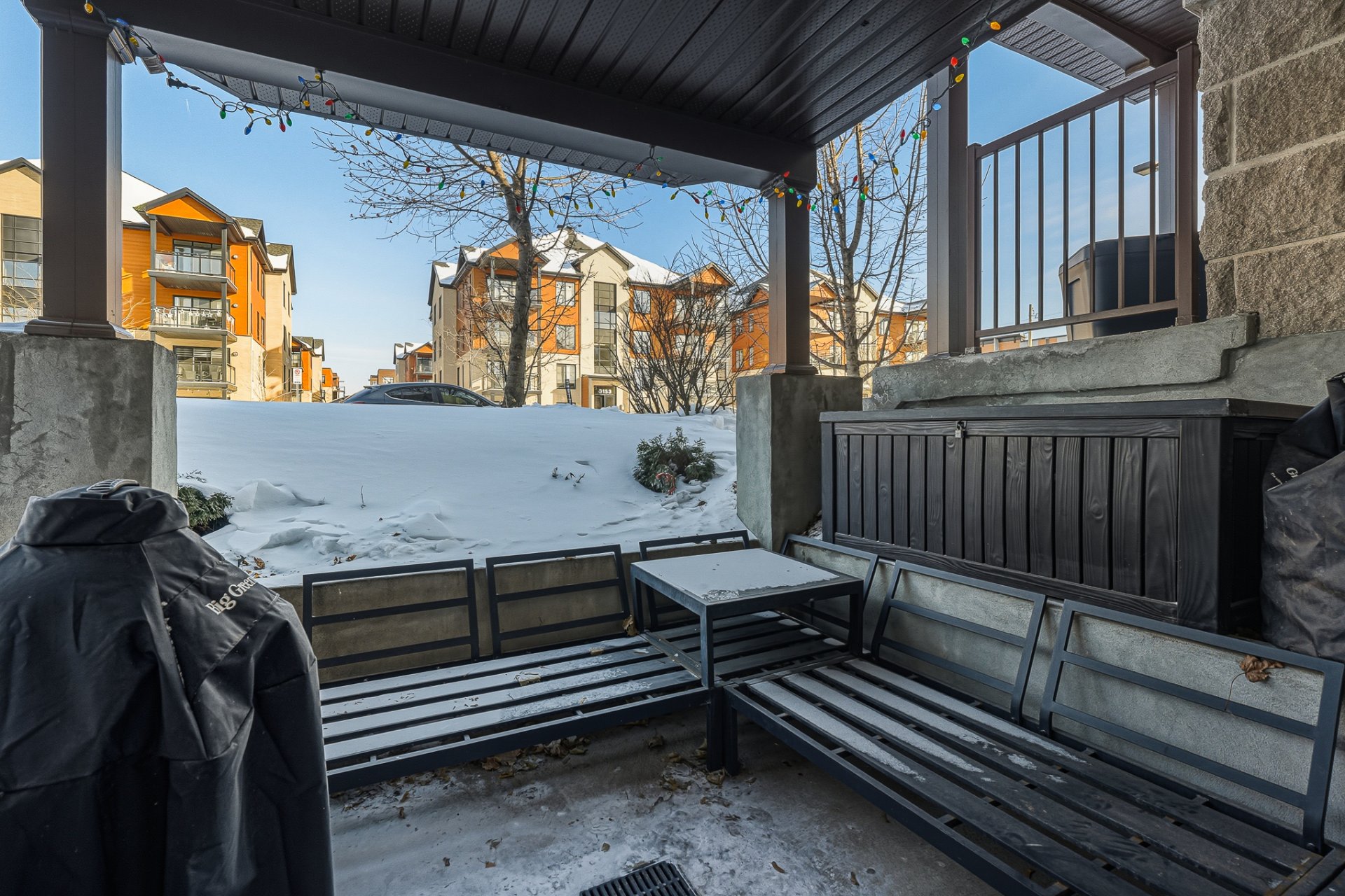 Charming garden level condo offering 1,086 sq.ft. of bright, open-concept living space combining the living room, dining area, and kitchen. Patio door providing access to the front terrace. Features two bedrooms, including a primary bedroom with walk-in closet, a bathroom with separate bathtub and shower, and a laundry room with storage. Wall-mounted air conditioner and one outdoor parking space included. Conveniently located near the commuter train, major roadways, parks, schools, and daycares.