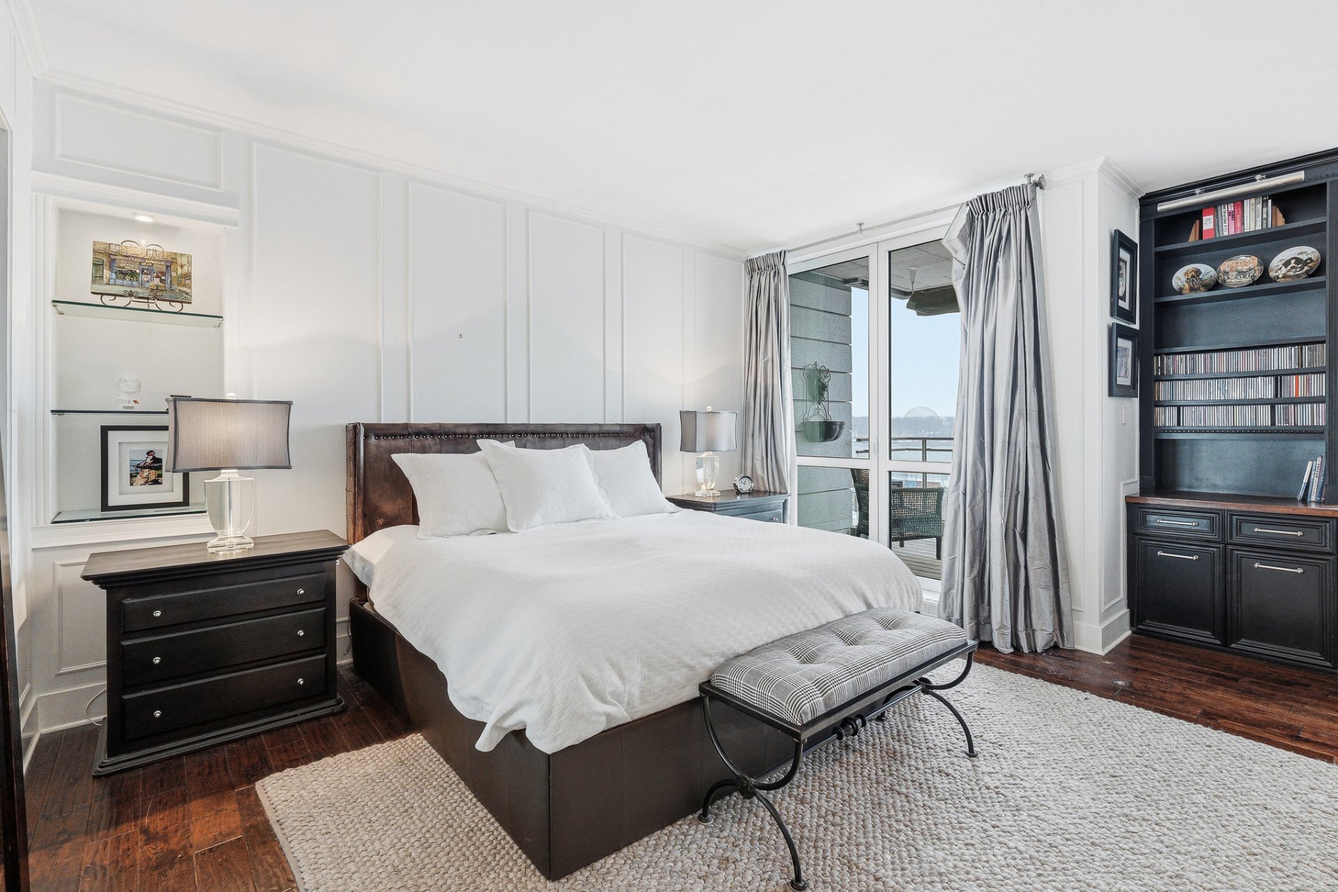 The spacious primary bedroom offers a peaceful retreat with stunning water views and access to a second private balcony. It includes a well-appointed ensuite bathroom with quality finishes. A second bathroom, complete with a separate glass-enclosed shower, adds comfort and practicality.
