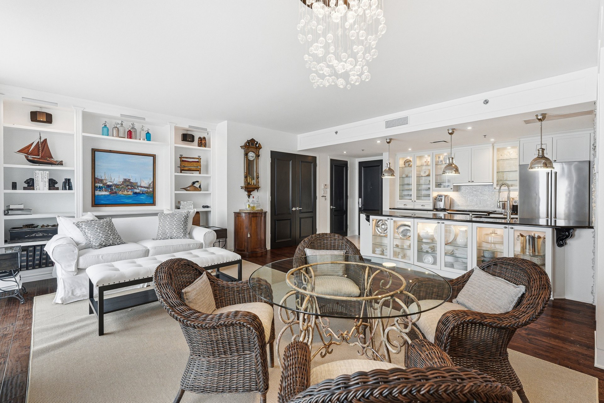 The contemporary kitchen showcases a refined black-and-white palette and is equipped with a central island, ideal for entertaining. It flows seamlessly into the dining and living areas, creating an elegant and inviting atmosphere. From this space, access the first private balcony, perfect for enjoying panoramic river views and spectacular sunsets.