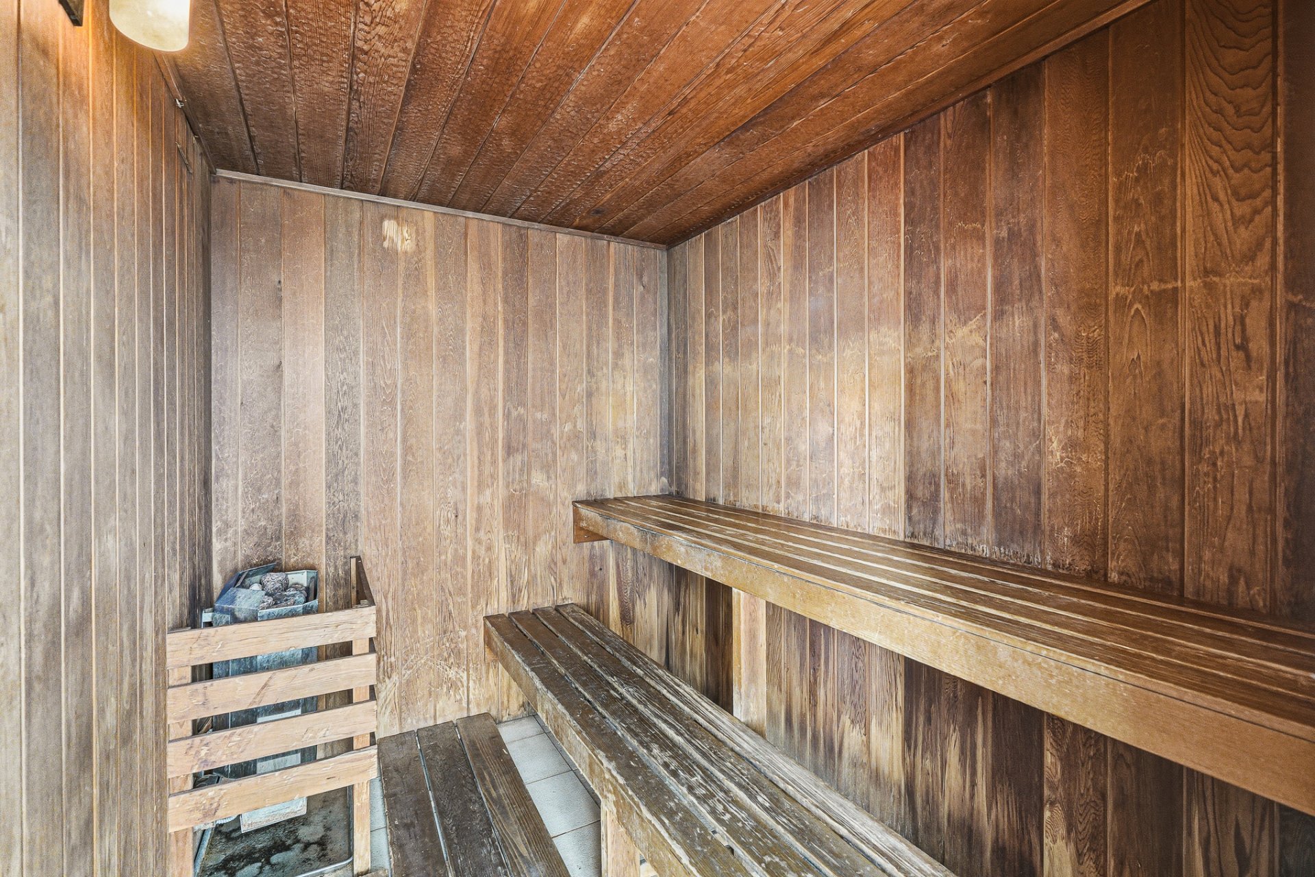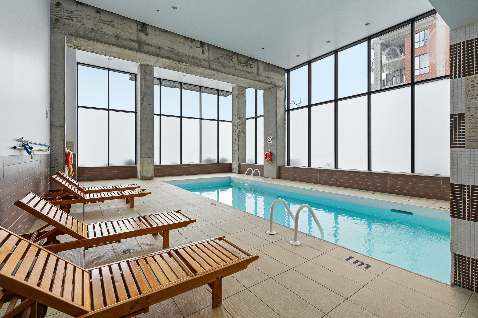 Residents enjoy a selection of upscale amenities, including an indoor pool surrounded by large windows, a sauna, a fully equipped fitness centre, elevators, and well-maintained common areas.