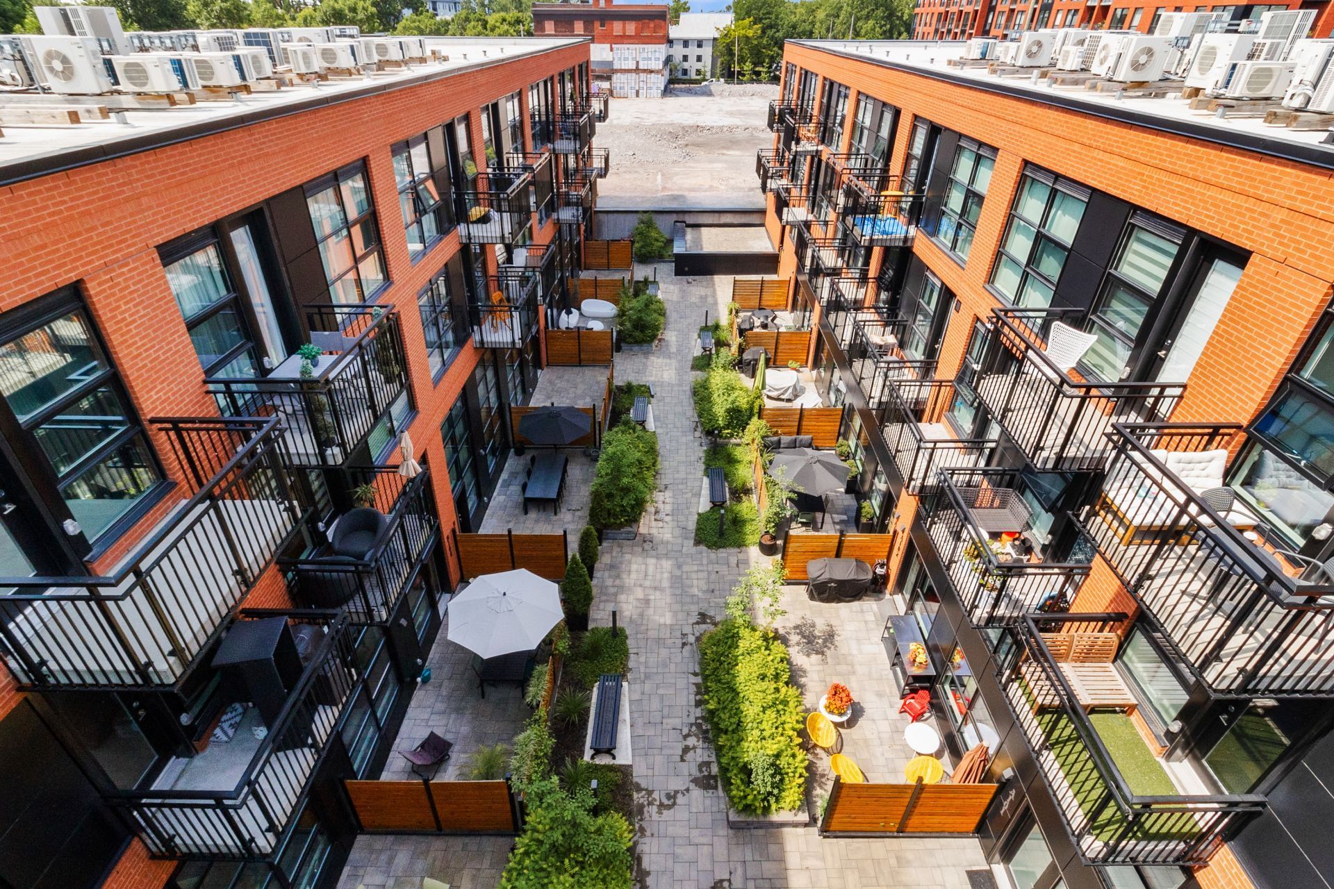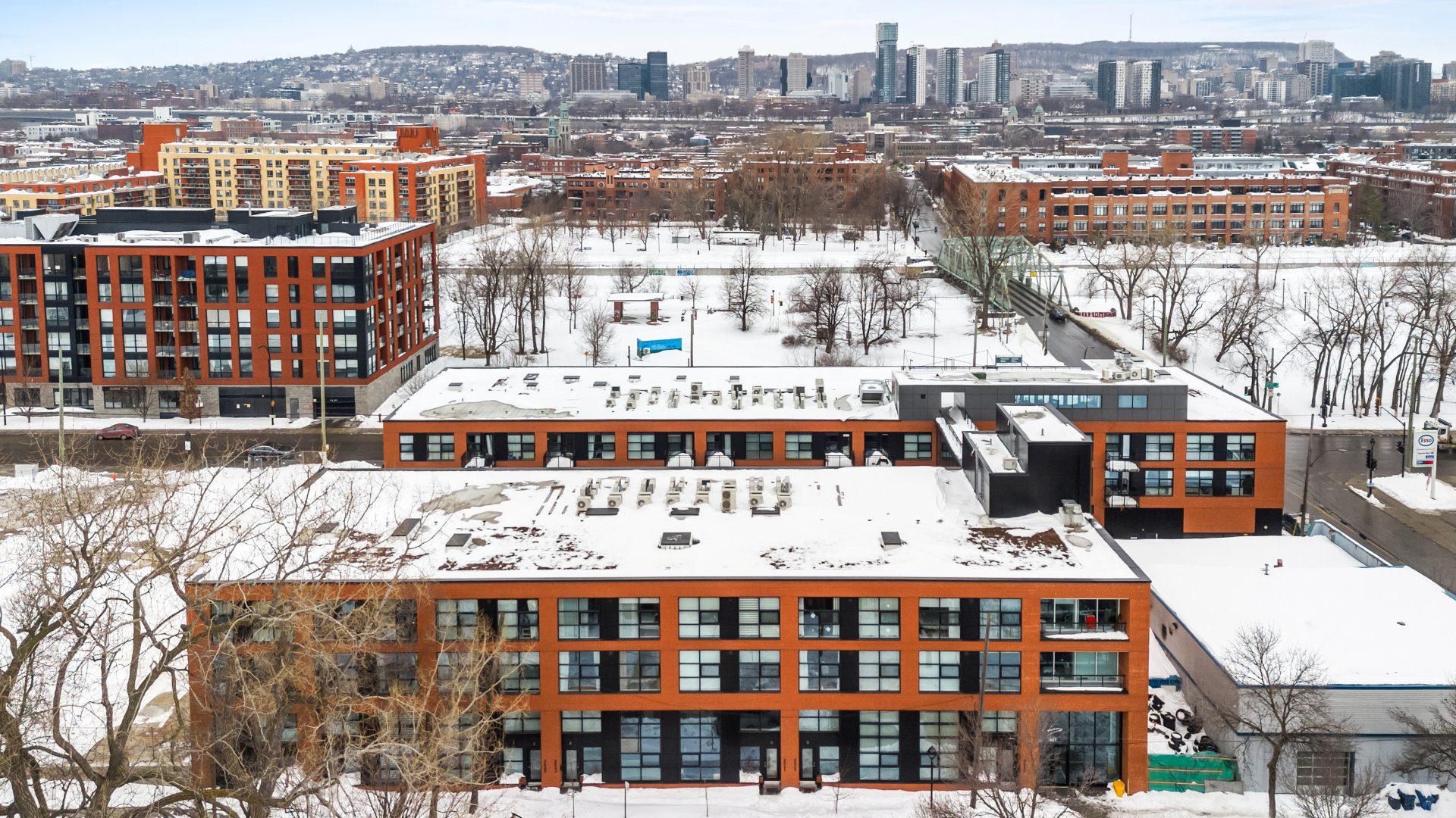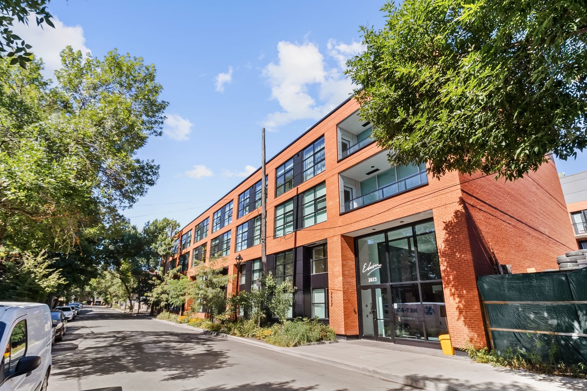 EDWIN | Building constructed in 2021 with elevator and shared amenities: lounge, fitness room, rooftop terrace with BBQ, and panoramic views of the Lachine Canal, Mount Royal, and downtown.