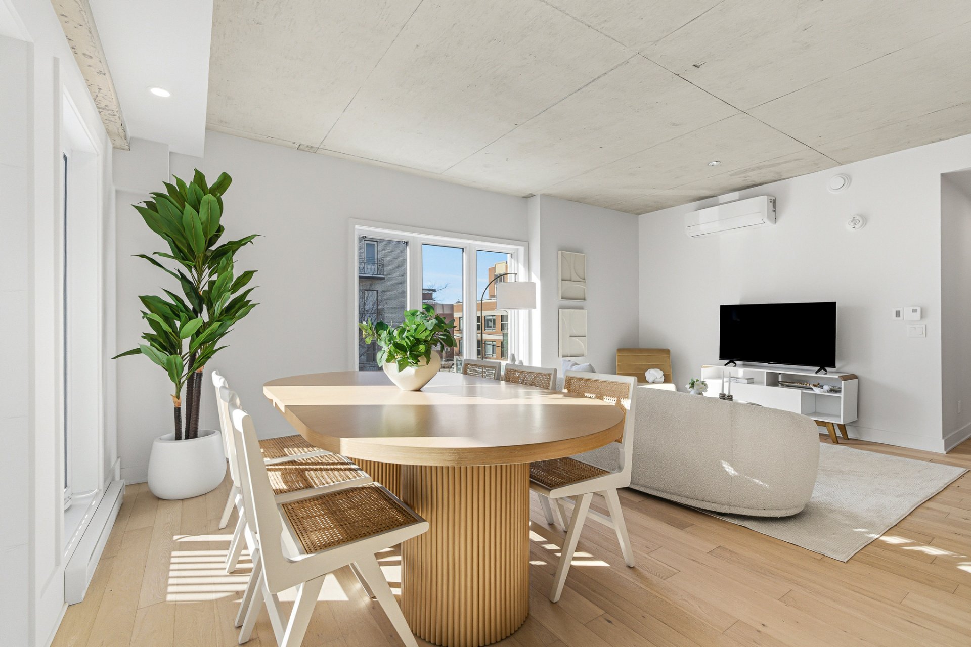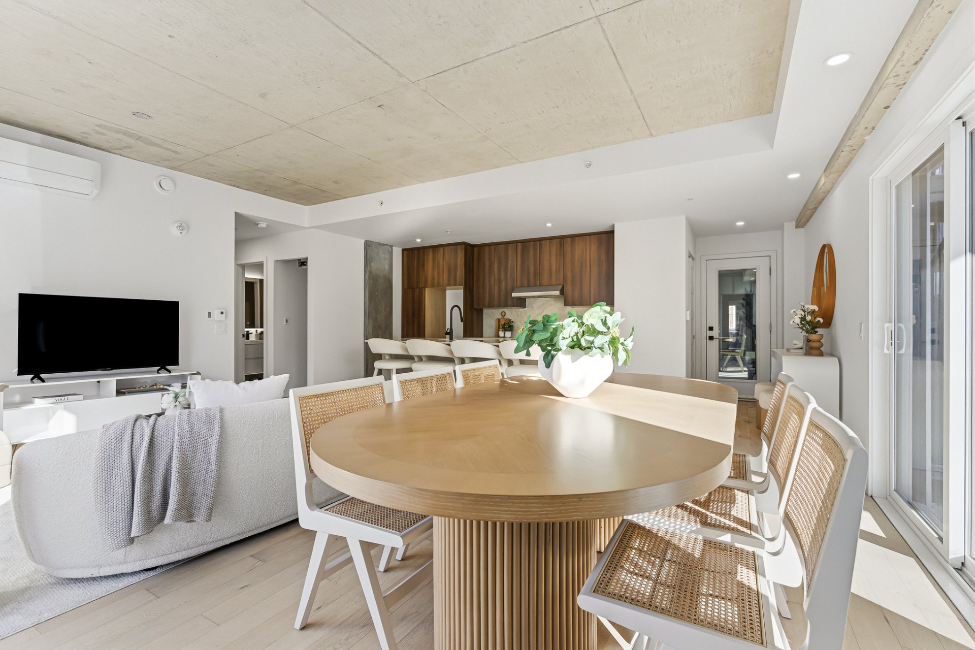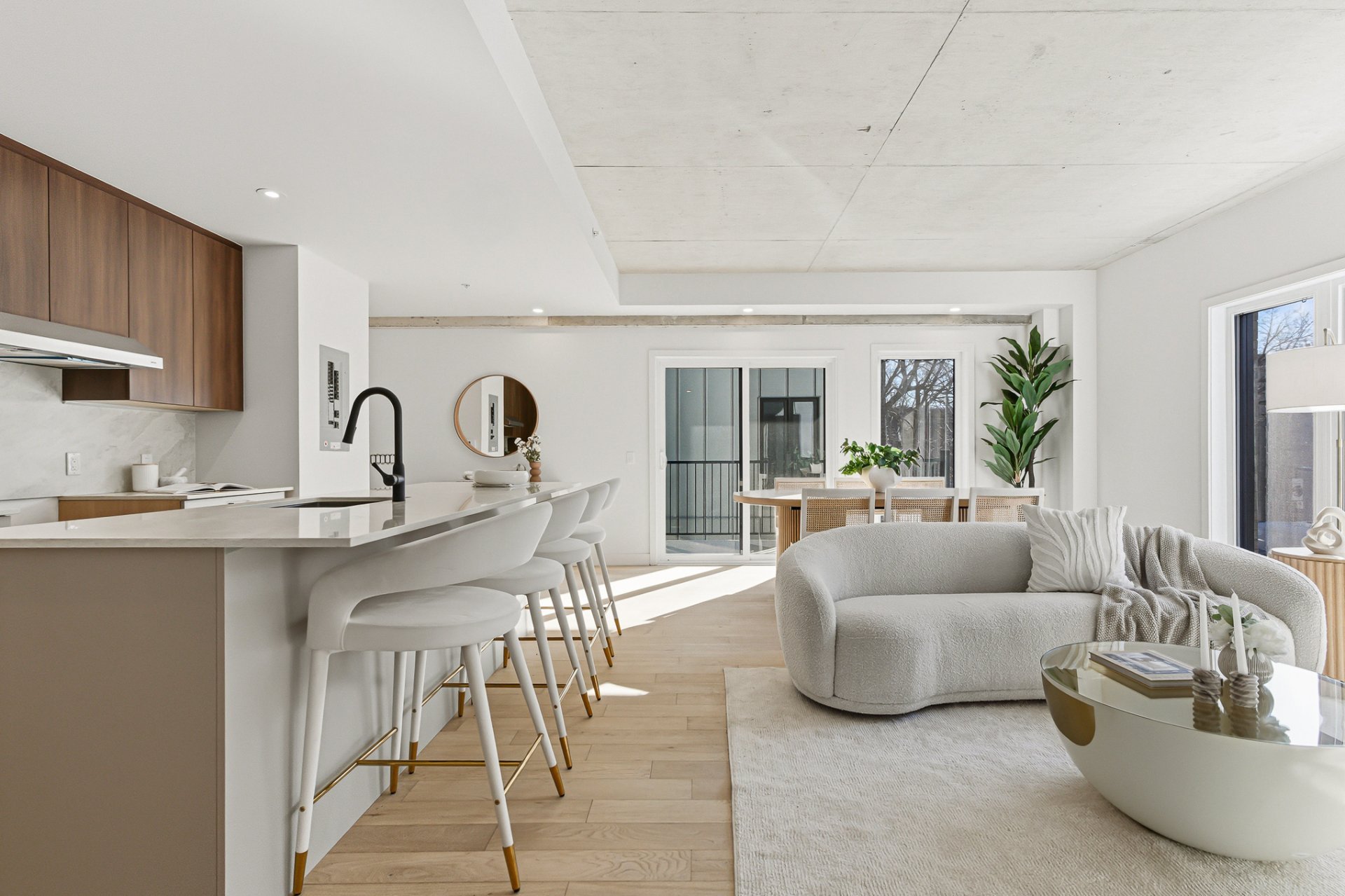 - Open-concept layout combining the living room with balcony access, the dining area, and the kitchen.