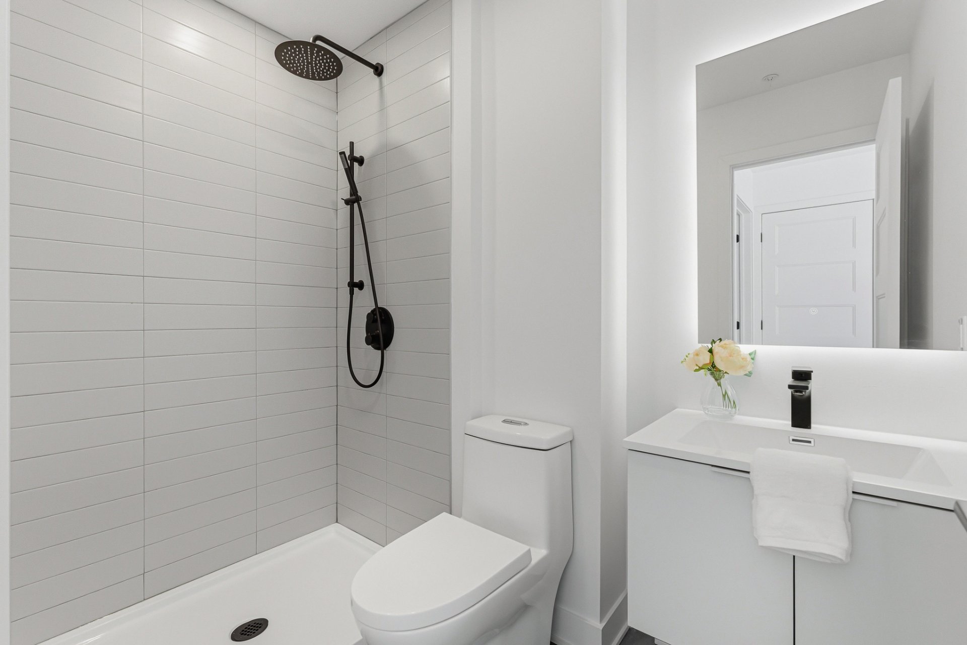 - Black hardware in the kitchen and bathrooms.
