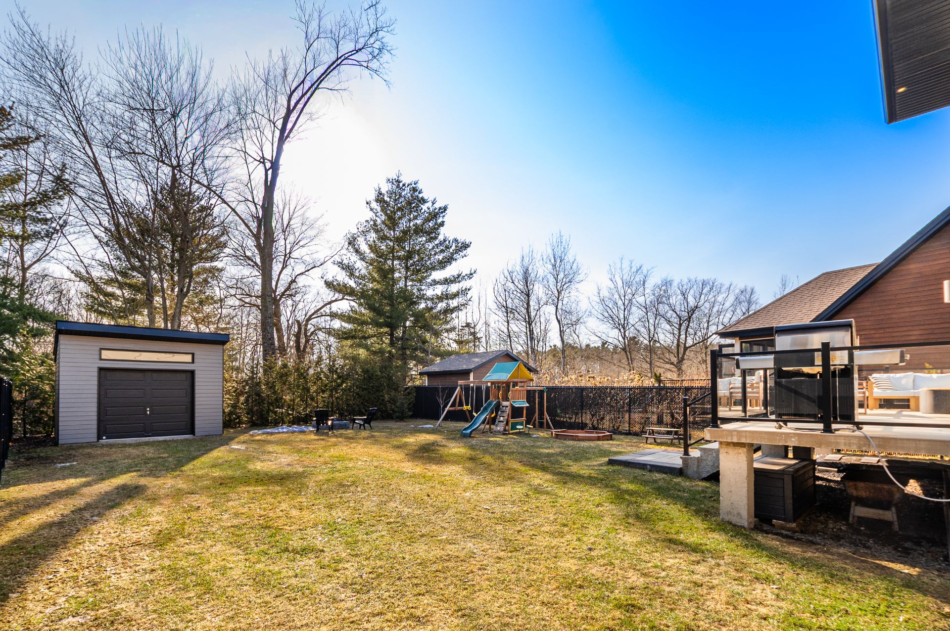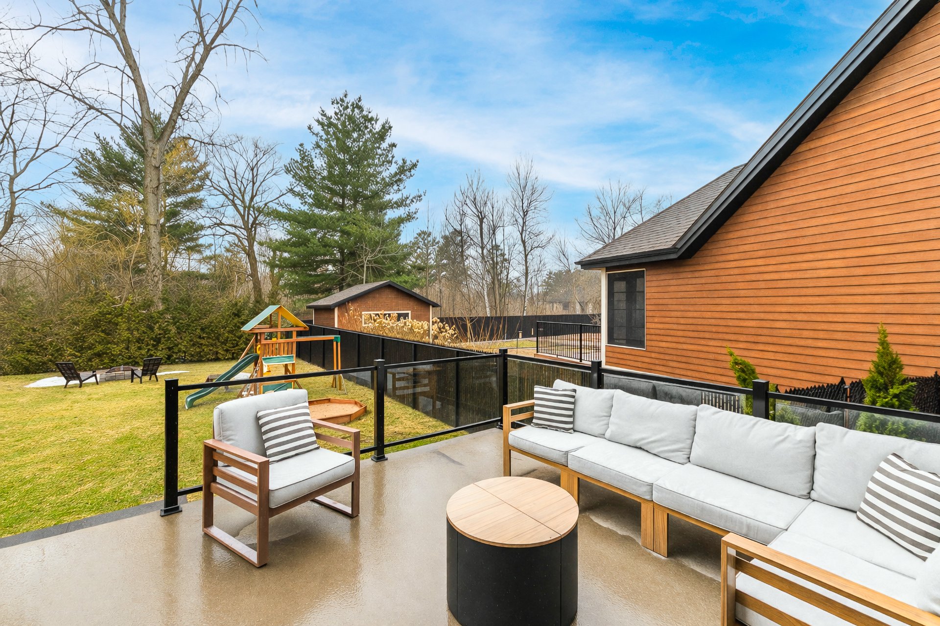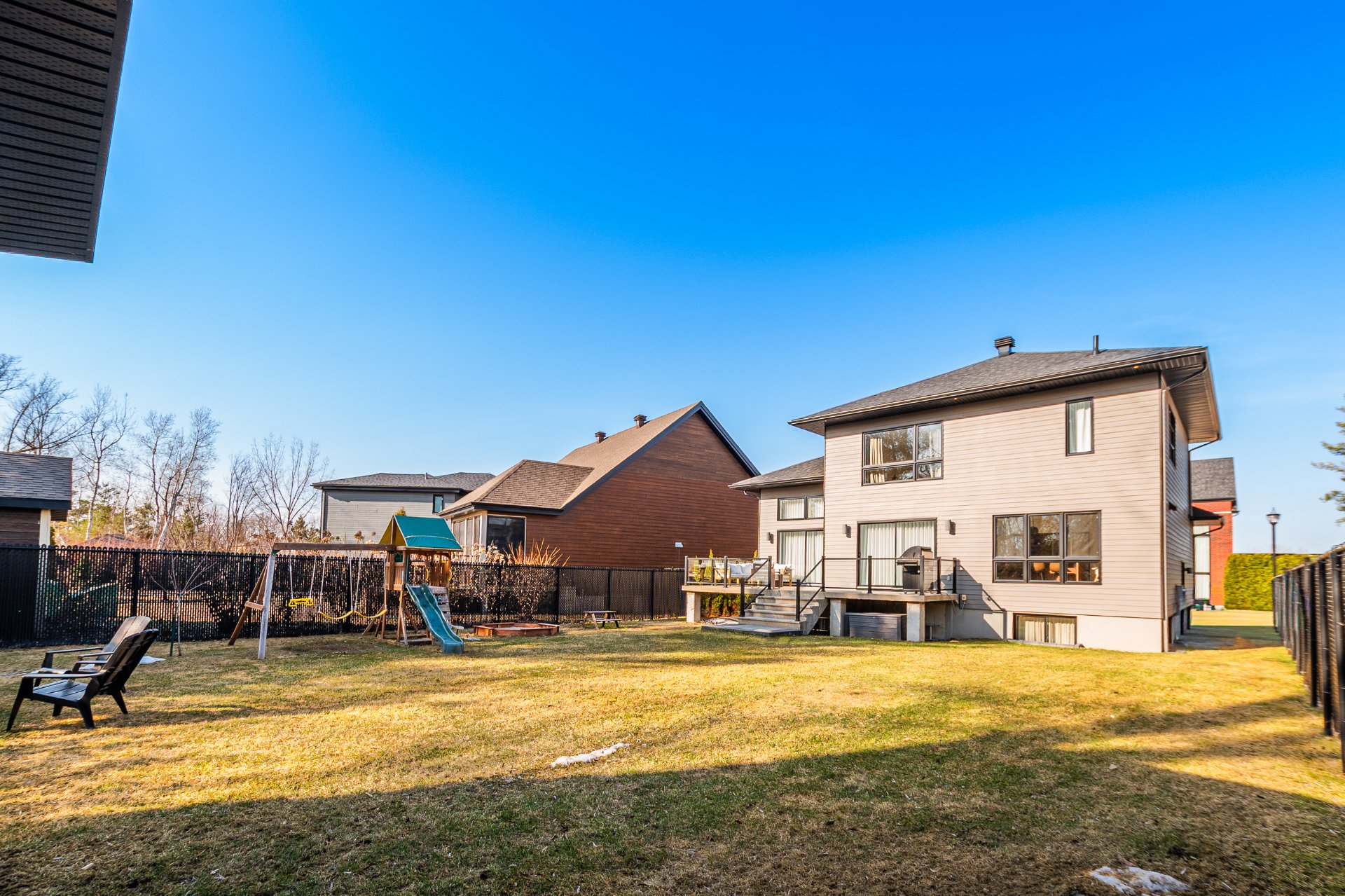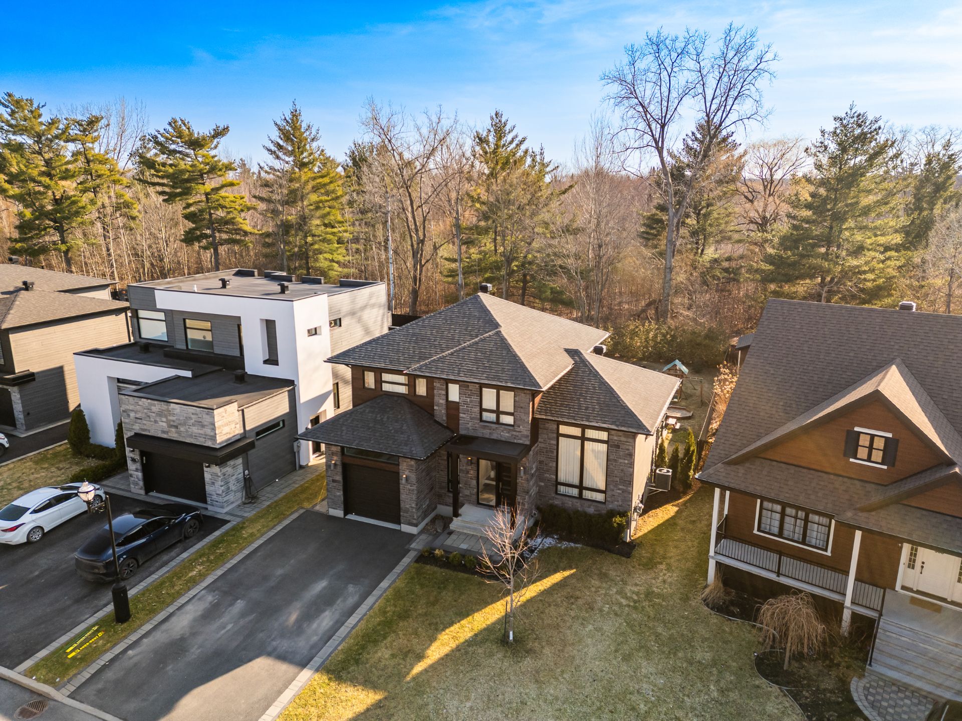 Elegant cottage-style property backing onto a wooded area with no rear neighbours, located in the sought-after wooded enclave of Île Sainte-Thérèse. Bright open living area featuring a 12-ft ceiling in the living room, gas fireplace with stone mantle and 2 patio doors leading to the backyard. Inviting kitchen with stone backsplash, 8-ft central island and quartz countertops. Upper floor: 3 bdrms, including a spacious primary bedroom with walk-in, plus a separate laundry room. Finished basement with family room, 4th bedroom and bath with heated floors. Fenced southwest-facing backyard. Garage (18.11 x 12.3 ft) and central natural gas system.
