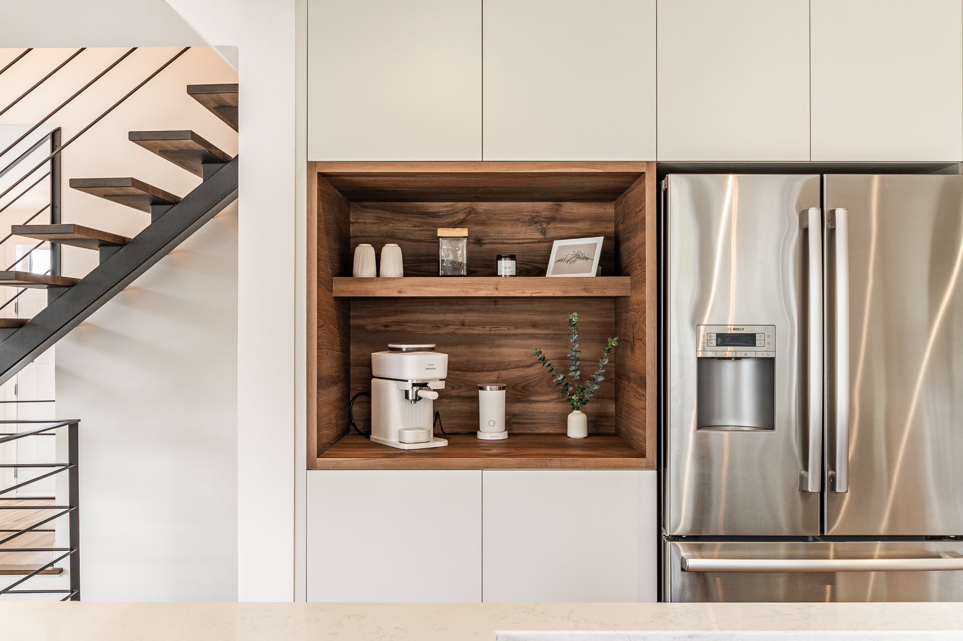 The open staircase, featuring a sleek steel structure, adds a contemporary architectural touch and enhances the sense of space throughout the home.