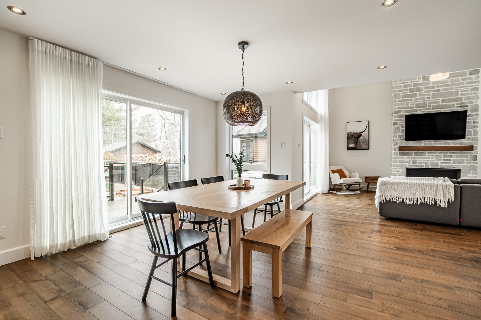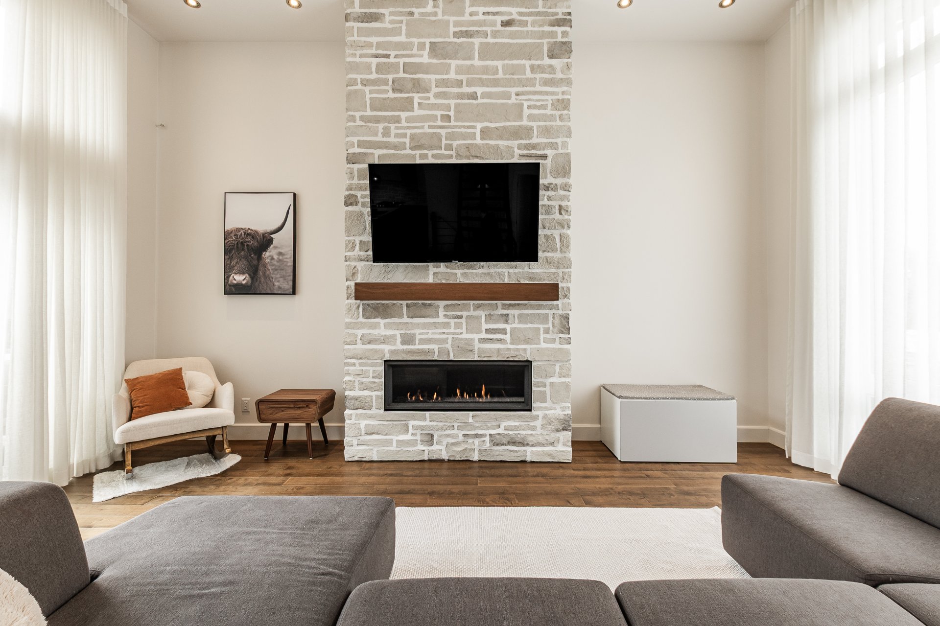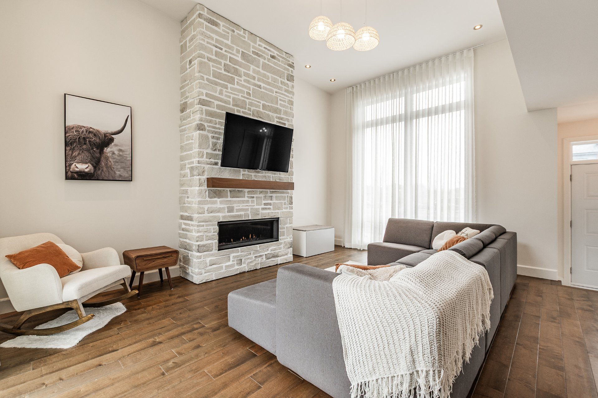 From the moment you enter, the generous volumes and natural light stand out. The living room is highlighted by a 12-foot ceiling and a natural gas fireplace with a stone mantle, creating a warm and inviting atmosphere. Two patio doors extend the living space outdoors while allowing abundant natural light to fill the main area.