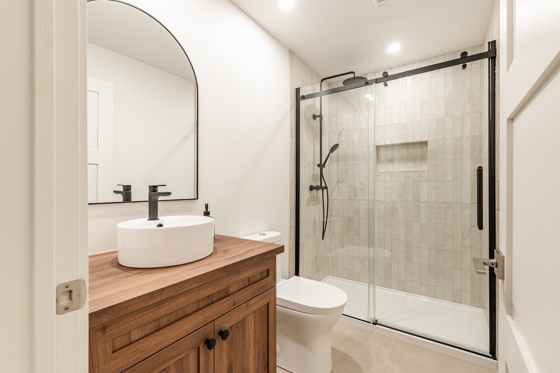 The basement offers a large family room, a fourth bedroom, and a bathroom with a glass shower and heated floors. Two additional storage spaces, including a mechanical room, complete the lower level.