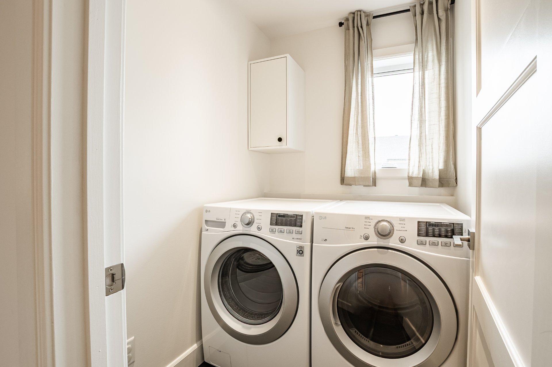 Upstairs, the property offers three bedrooms, including a spacious primary bedroom overlooking the wooded backyard and featuring a walk-in closet. Maple flooring runs throughout both above-ground levels. A separate laundry room completes this floor.