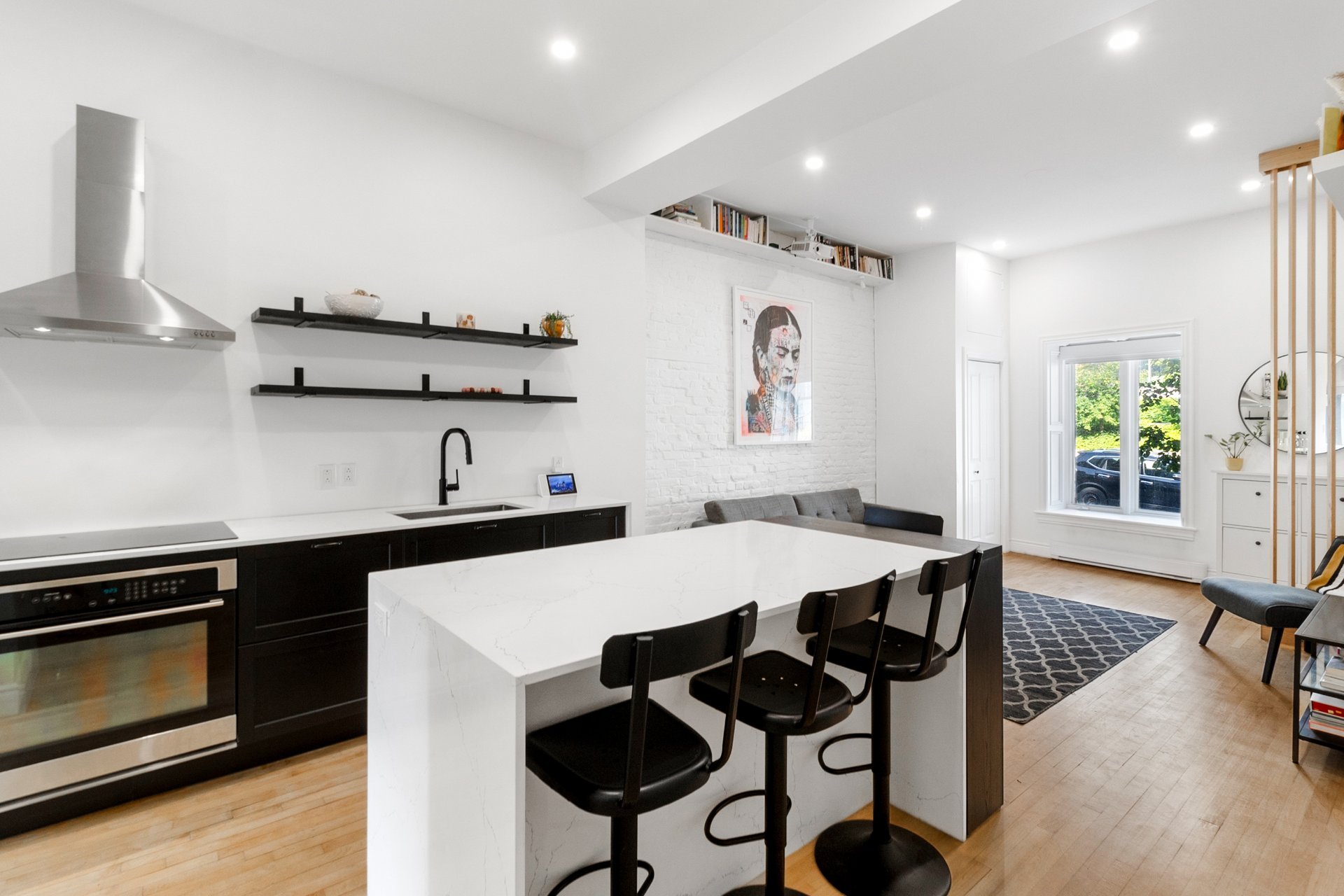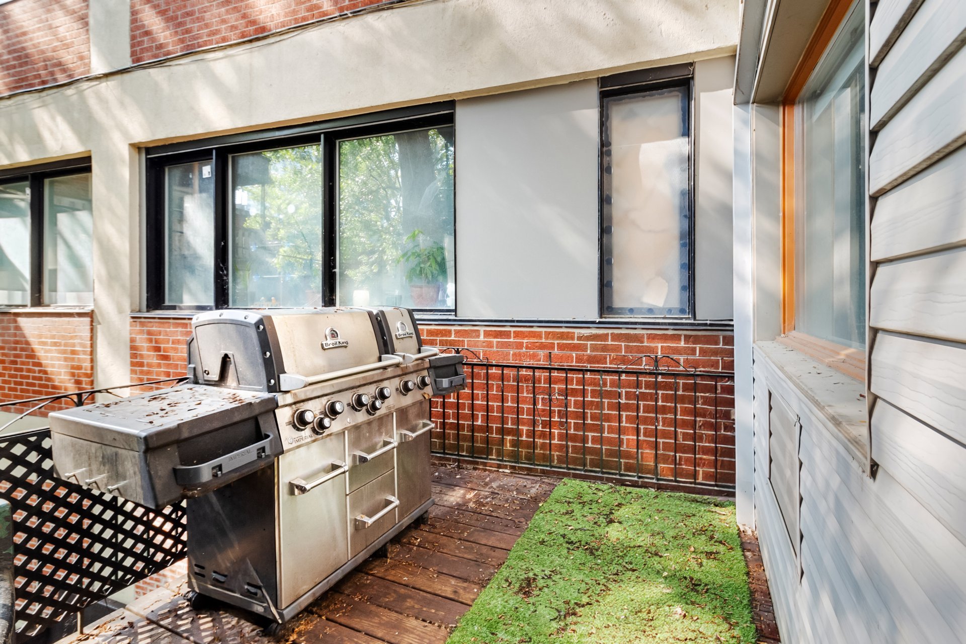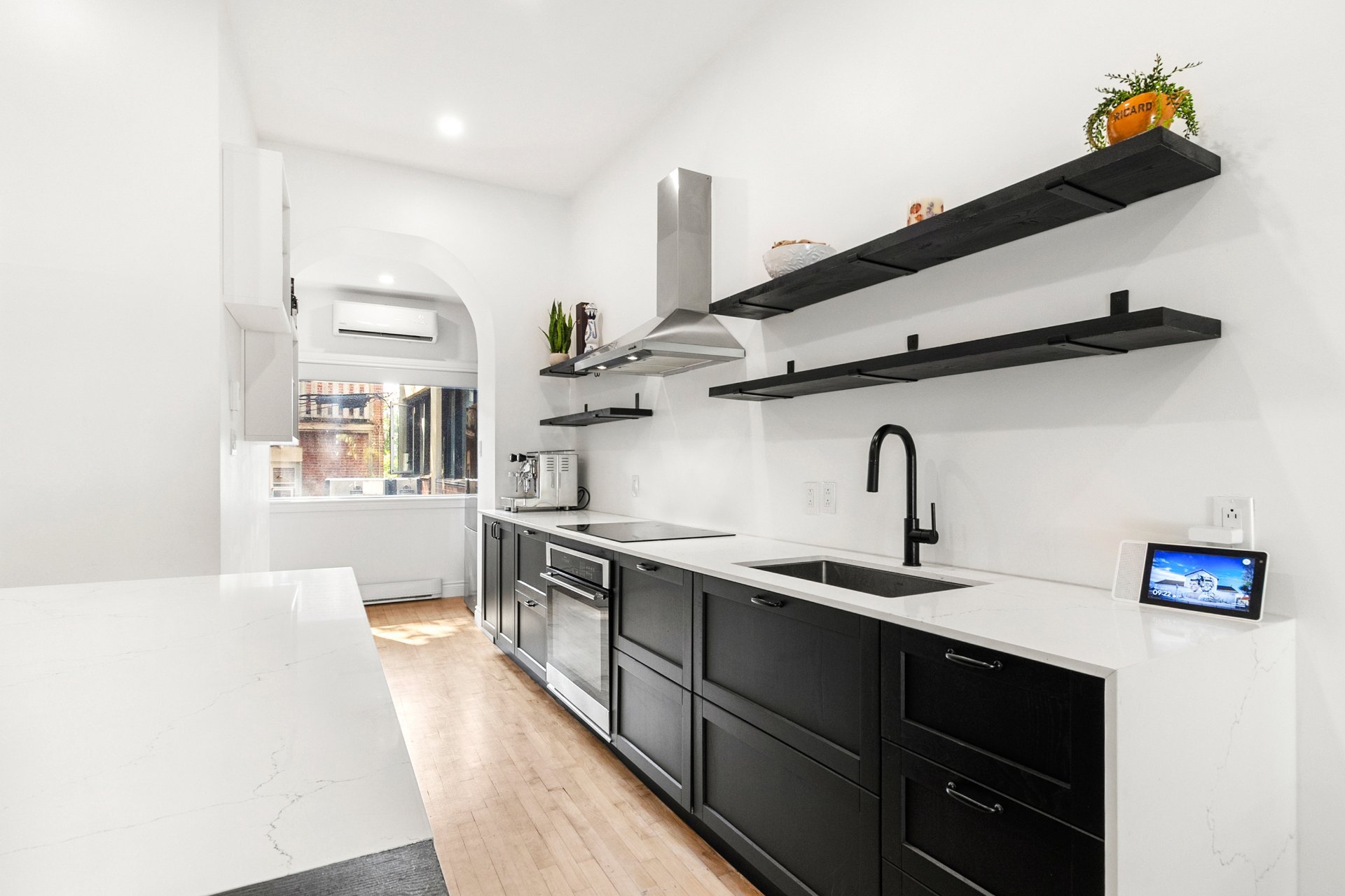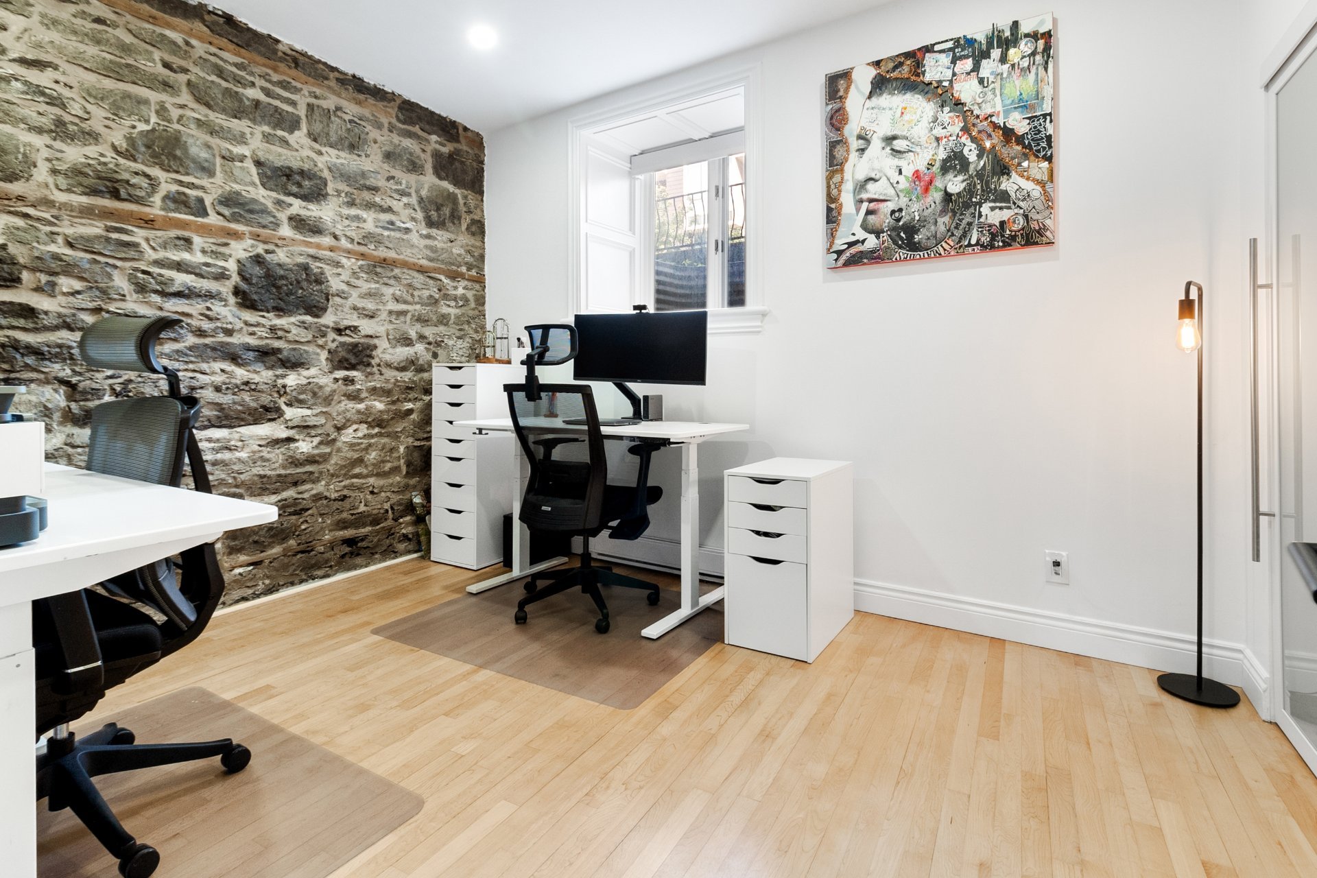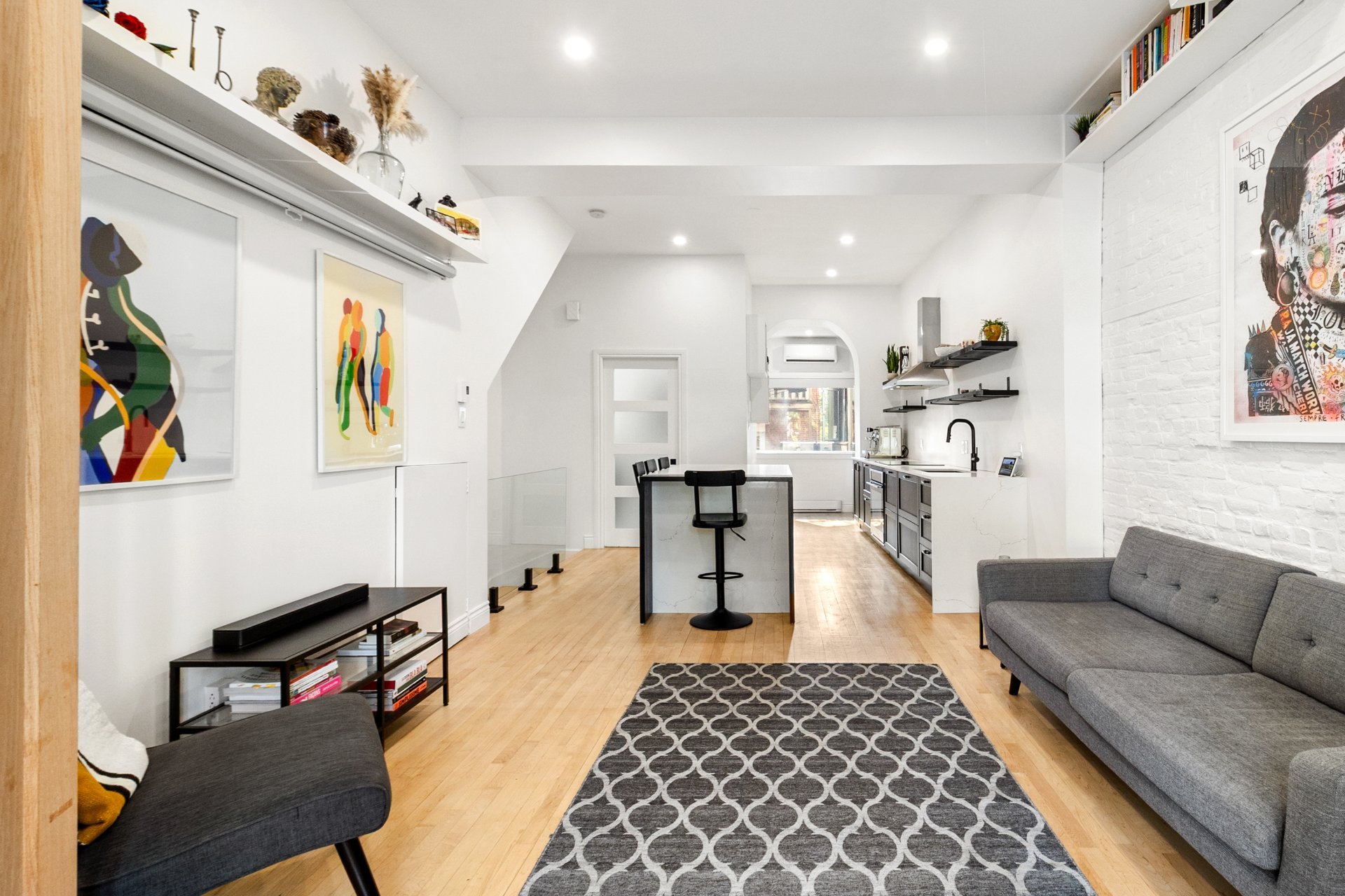 Located in the heart of downtown, this renovated two-level condo combines a prime location with modern comfort. Just steps from Lucien-L'Allier metro, the Bell Centre, Concordia, McGill, the Museum of Fine Arts, as well as shops and restaurants. The main floor features a bright open living area with hardwood floors, exposed white brick, a kitchen with quartz island, and a powder room. The garden level offers two bedrooms, including the primary with access to the interior courtyard, exposed stone wall, and a bathroom with heated floors.