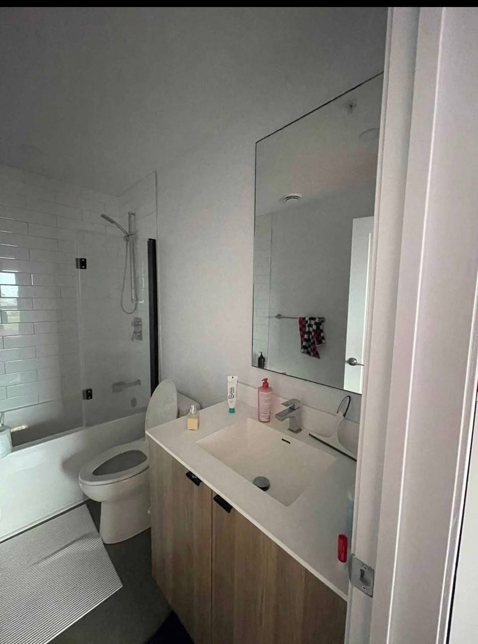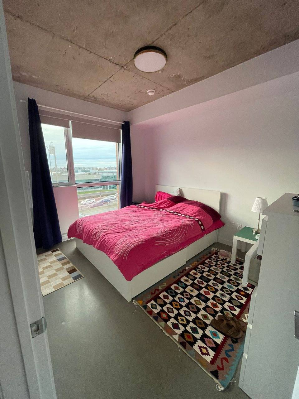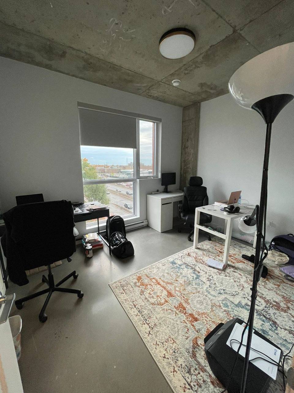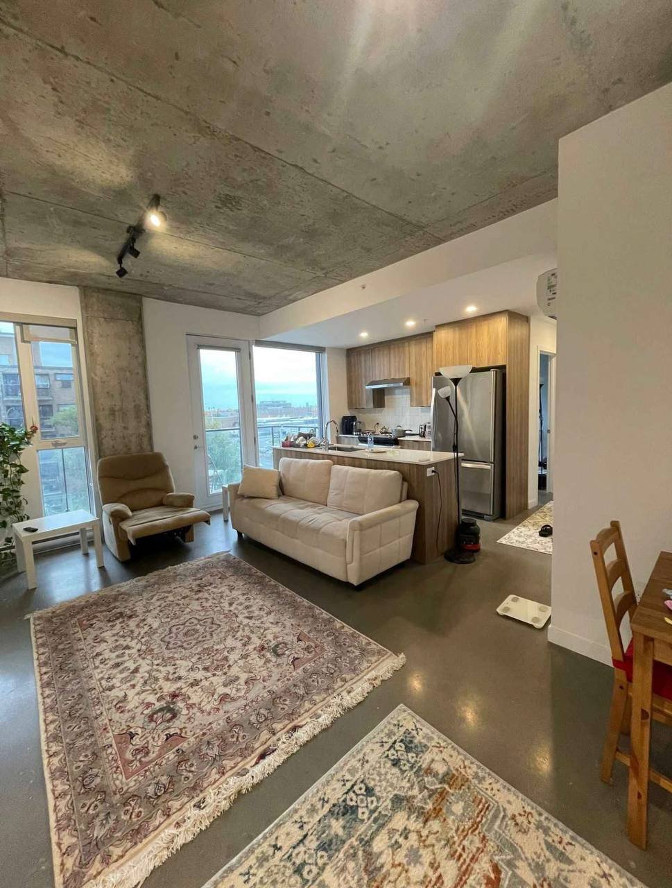 Lease transfer until Oct 2026! Bright 5th-floor corner unit offering exceptional natural light, a spacious living room, large bedroom and private balcony. Features two separate bathrooms and 5 appliances including dishwasher, washer and dryer. Only 3 minutes from bus stops (100, 460, 128) and near the future Mount Royal and Côte-de-Liesse REM stations--just 10 minutes to downtown. Garage locker included. Indoor parking $150, outdoor $100. Small pets allowed.