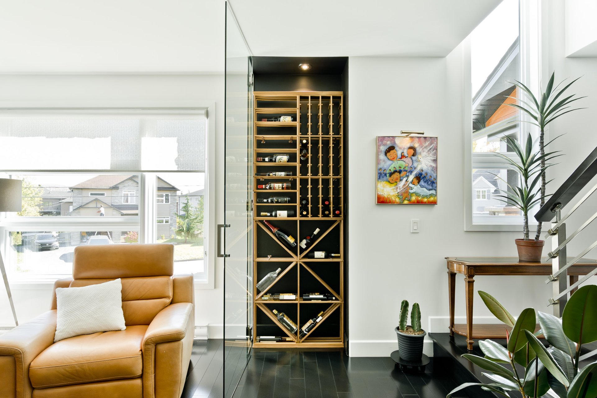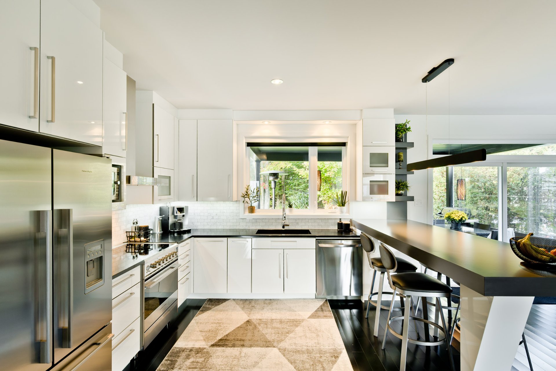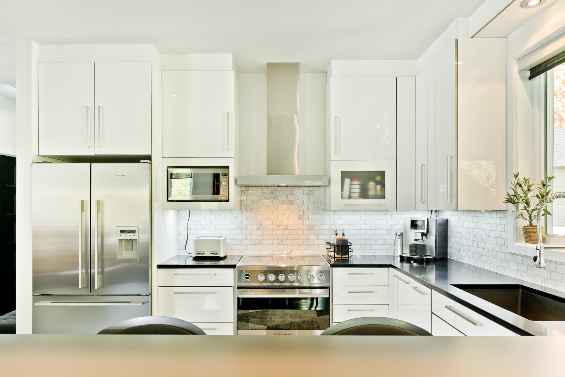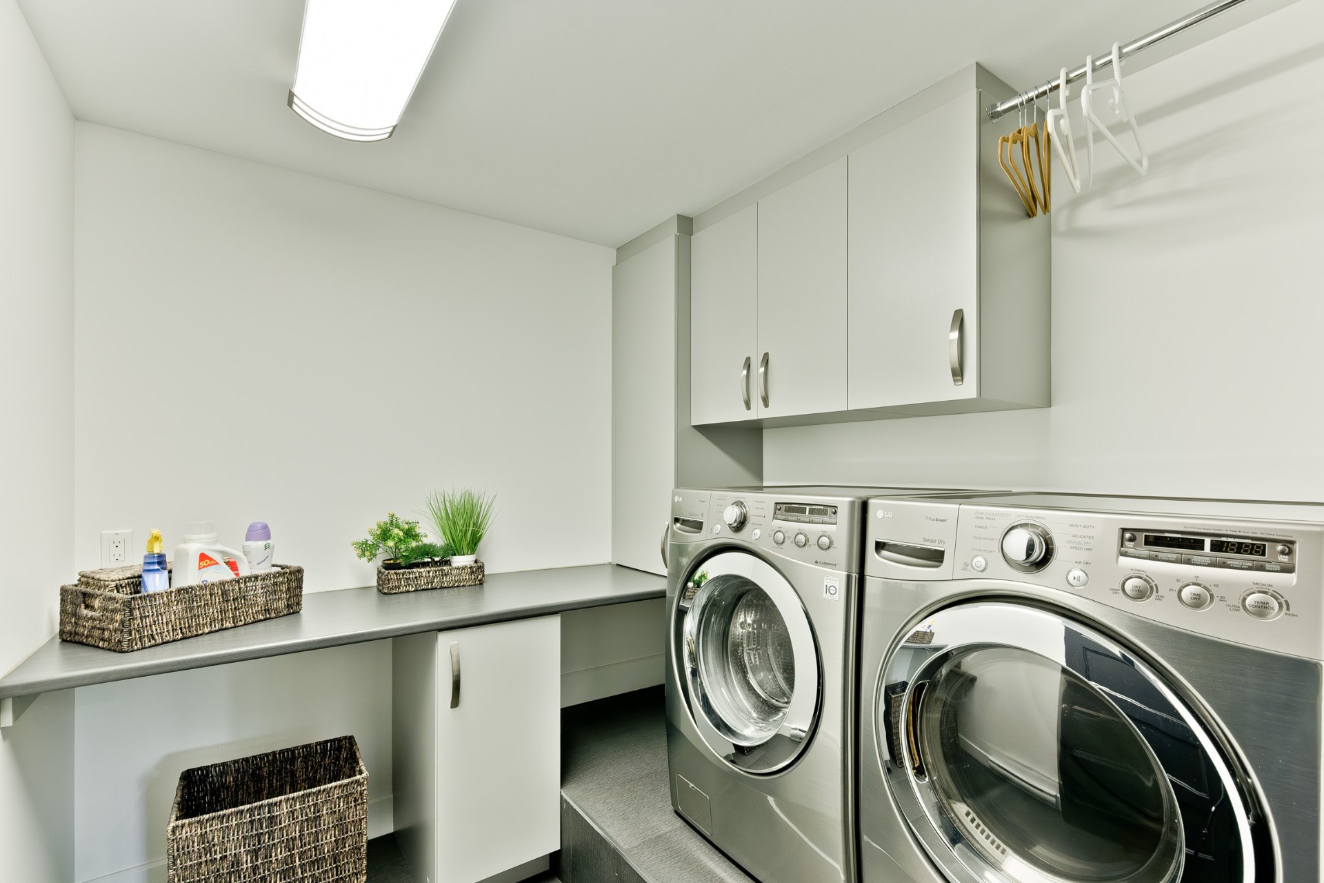 - Fisher Paykel refrigerator, Panasonic microwave, LG dishwasher, Fisher Paykel built-in oven with induction hob, blinds and curtain rods with pale blue curtains in the second bedroom, fixed light fixtures, brown corner desk with brown trim in the basement, white trim in the basement office, basement refrigerator, 1 hose for central vacuum system, 4 gray bar stools in the kitchen.