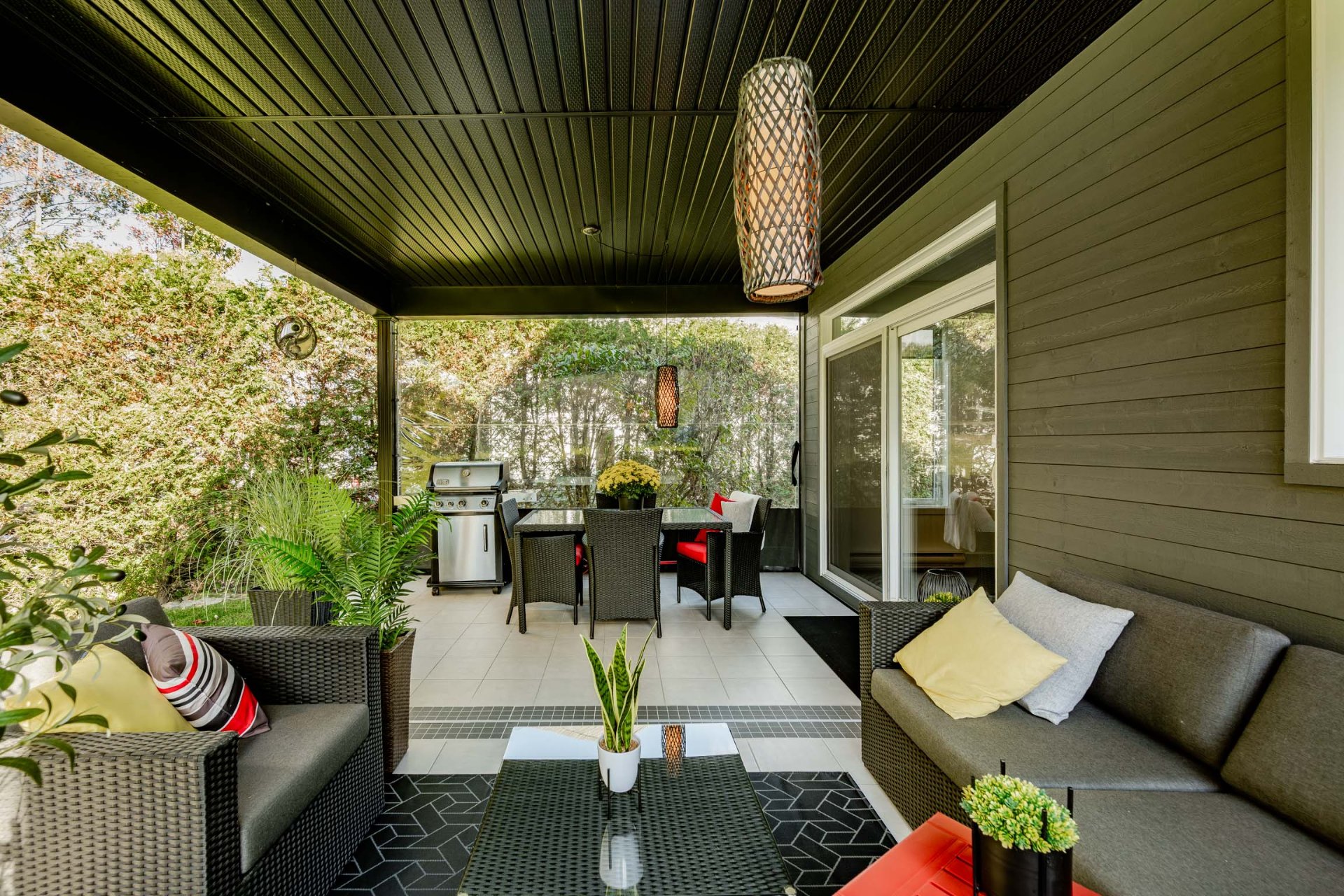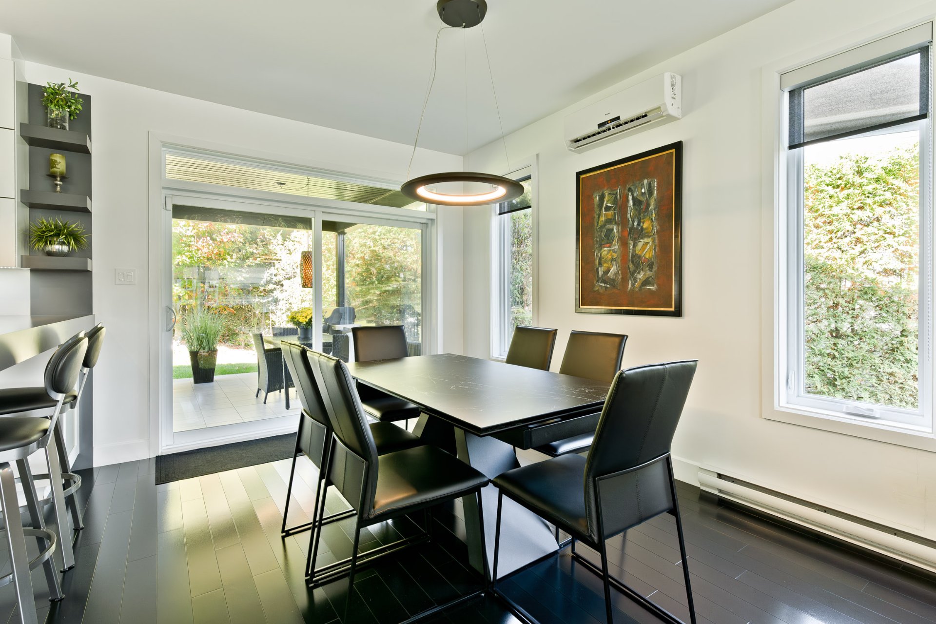 From the moment you enter, the charm takes hold. The open-concept main floor is filled with natural light and warmth. The modern, functional kitchen impresses with its large island and spacious adjoining pantry, perfect for cooking, organizing, and sharing. High ceilings and generous windows enhance the sense of openness. The dining area opens onto a beautiful covered ceramic balcony, ideal for enjoying peaceful meals sheltered from wind and weather. The sunlit living room, featuring an ethanol fireplace and built-in wine display, combines refinement with absolute comfort. Two wall-mounted heat pumps ensure a pleasant atmosphere year-round.