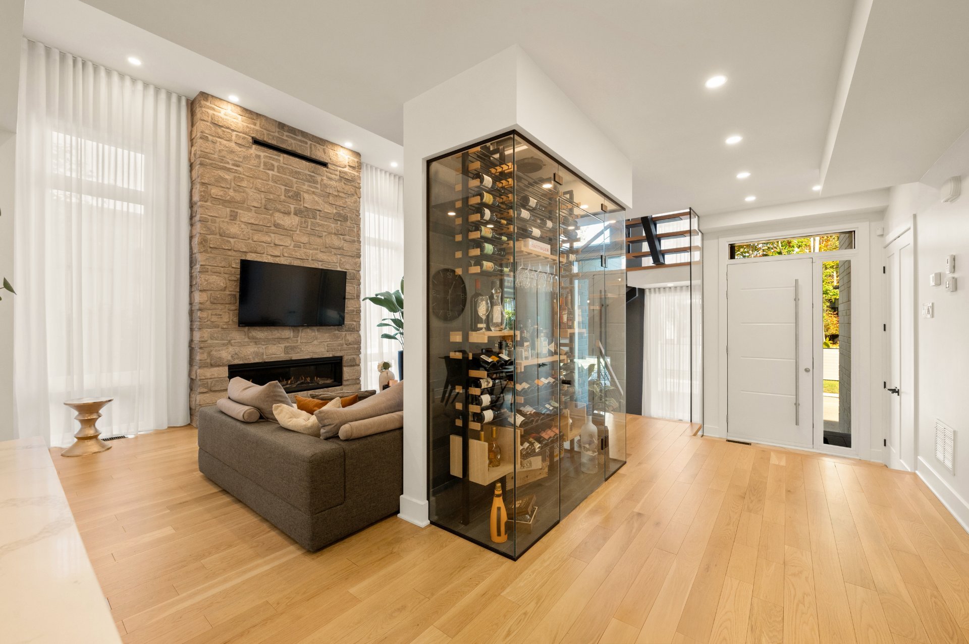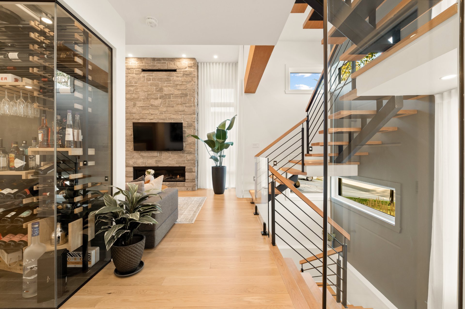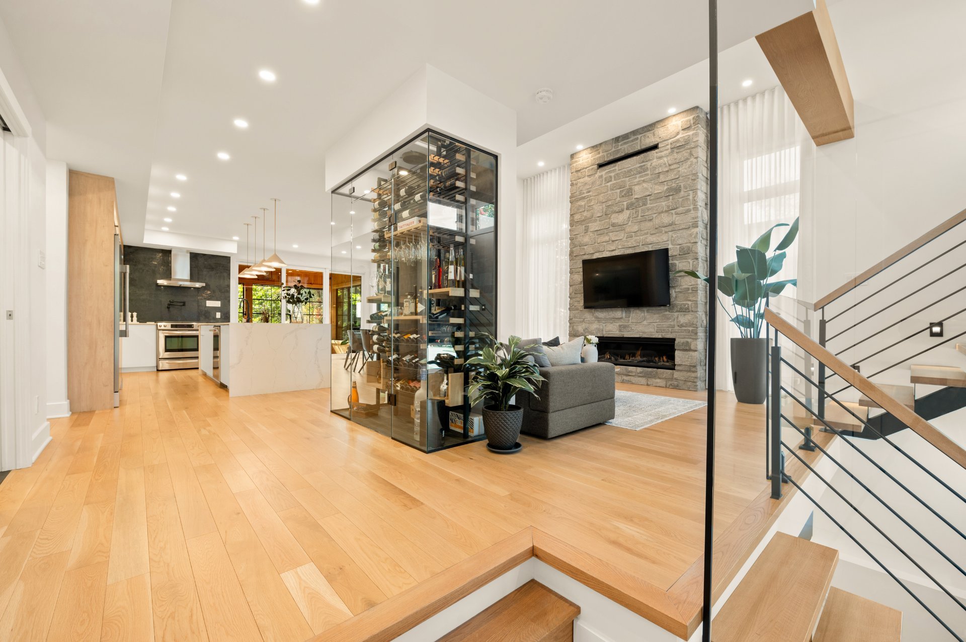 Treat yourself to a distinctive residence where every detail has been thoughtfully designed to combine comfort and elegance. From the moment you step inside, the living space impresses with its warm and inviting atmosphere: a living room featuring a gas fireplace set against a stunning stone wall, a spacious and functional kitchen with a walk-in pantry, and not to mention the spectacular glass enclosed wine cellar that becomes the home's true centerpiece. Radiant heated floors throughout all levels ensure exceptional comfort year-round.