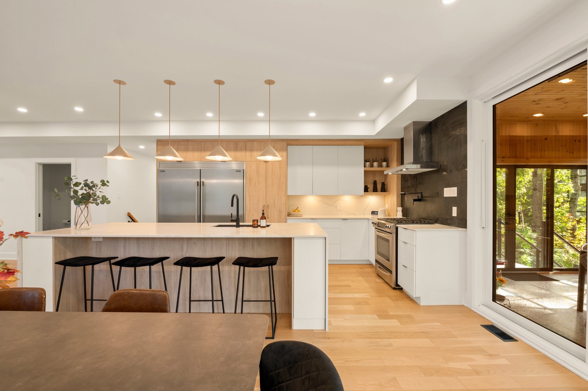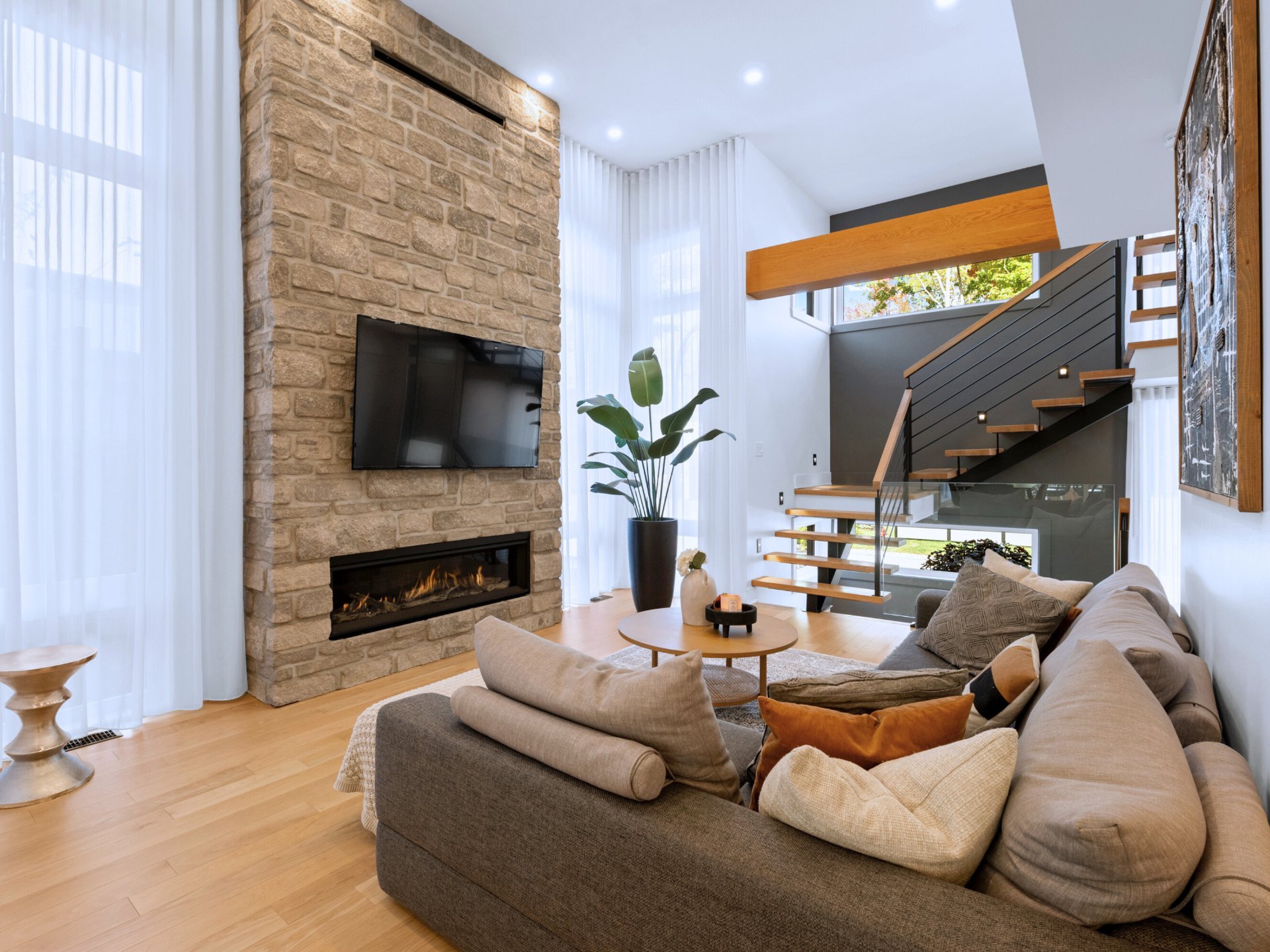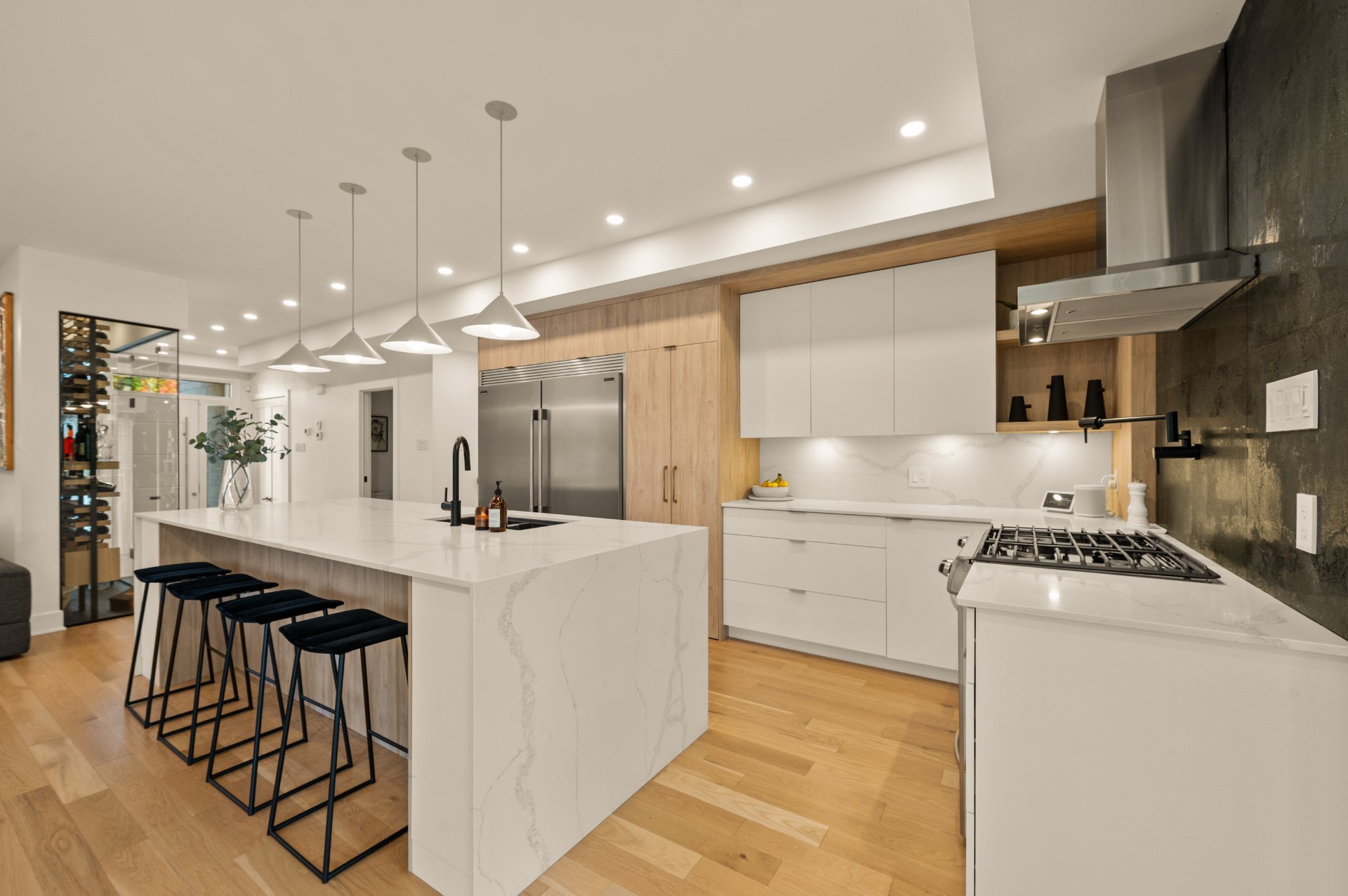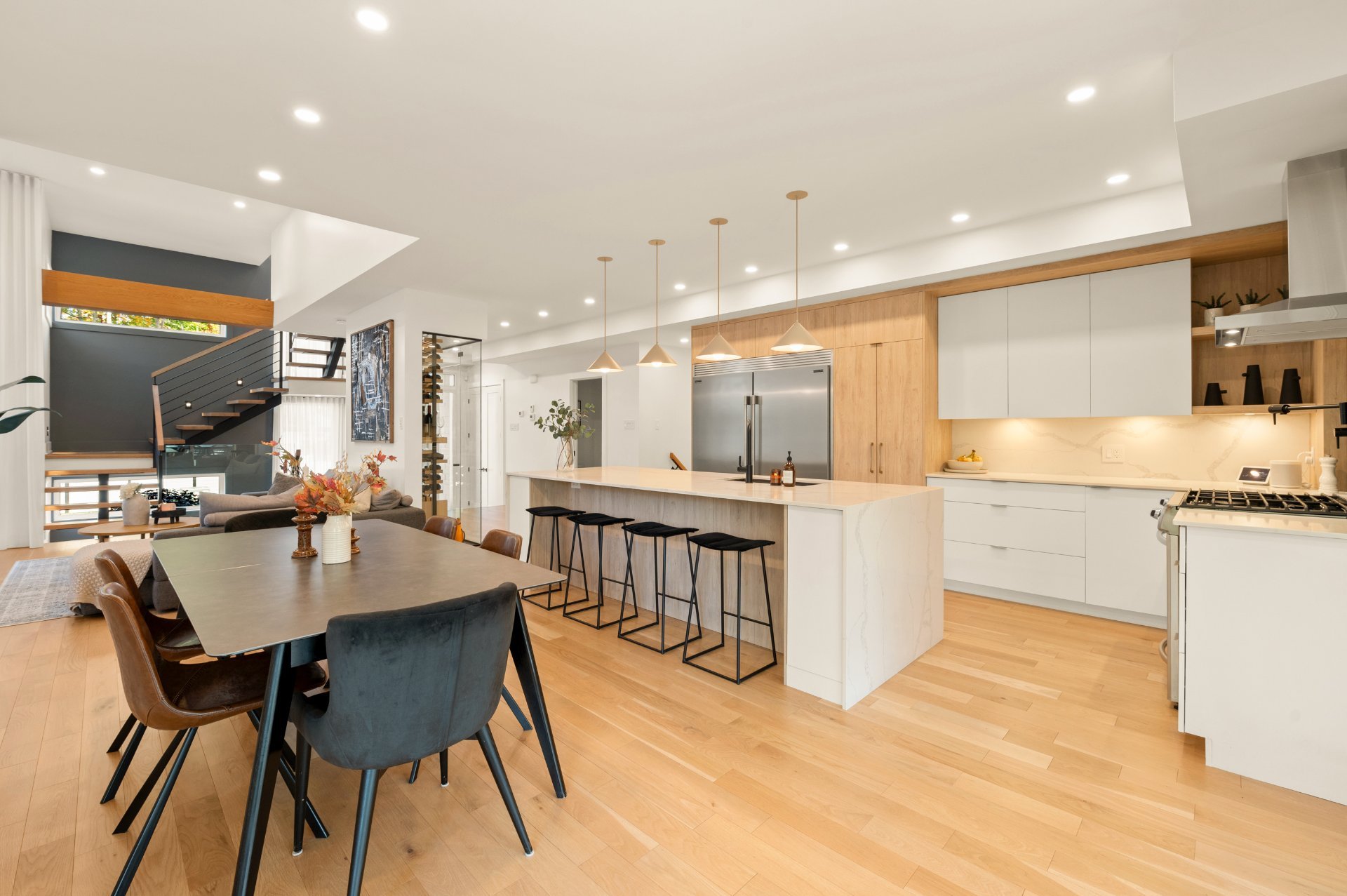 Treat yourself to a distinctive residence where every detail has been thoughtfully designed to combine comfort and elegance. From the moment you step inside, the living space impresses with its warm and inviting atmosphere: a living room featuring a gas fireplace set against a stunning stone wall, a spacious and functional kitchen with a walk-in pantry, and not to mention the spectacular glass enclosed wine cellar that becomes the home's true centerpiece. Radiant heated floors throughout all levels ensure exceptional comfort year-round.