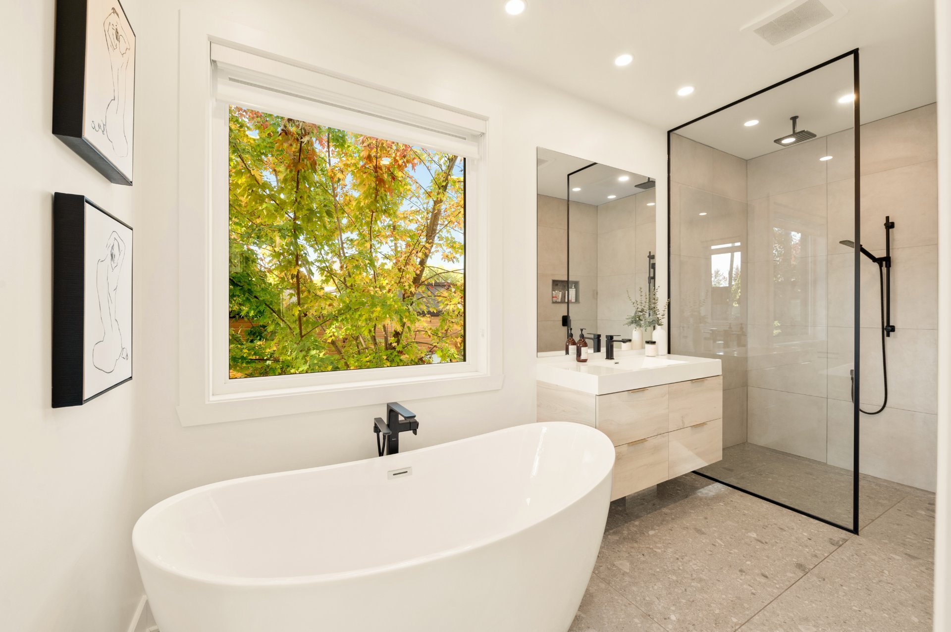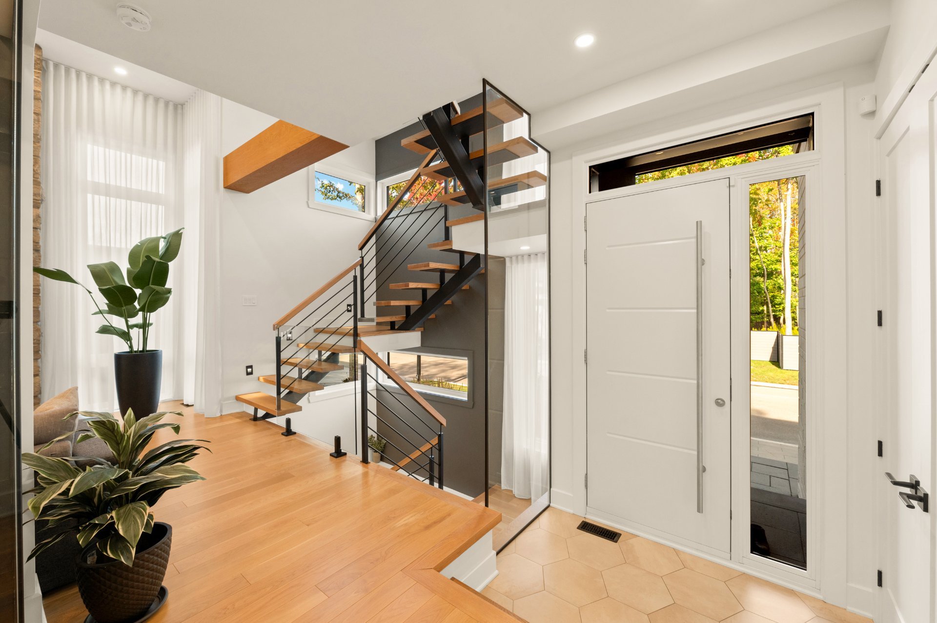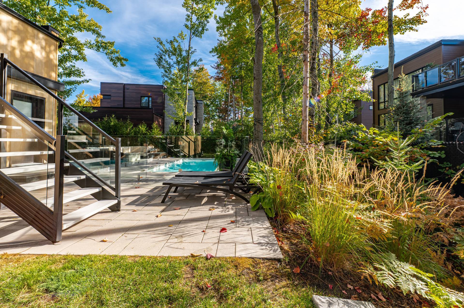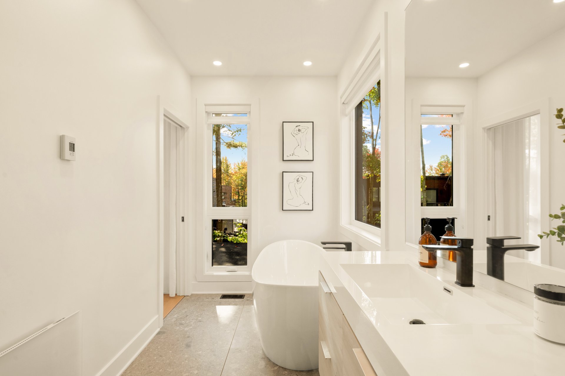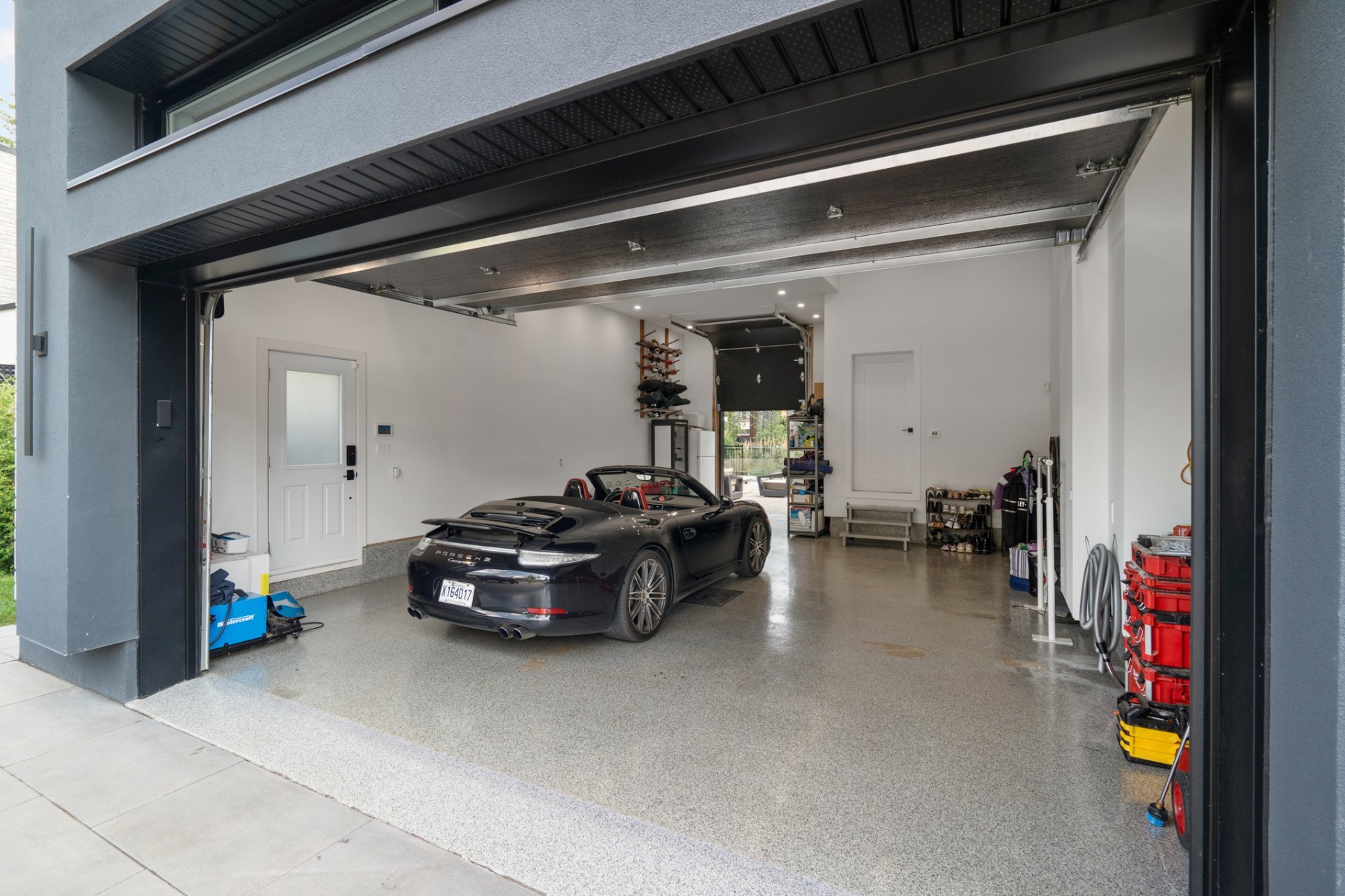 The triple garage, also equipped with heated floors, stands out with its rear door providing direct access to the backyard, its immaculate epoxy flooring, and its impressive ceiling height allowing for a mezzanine or car lift.
