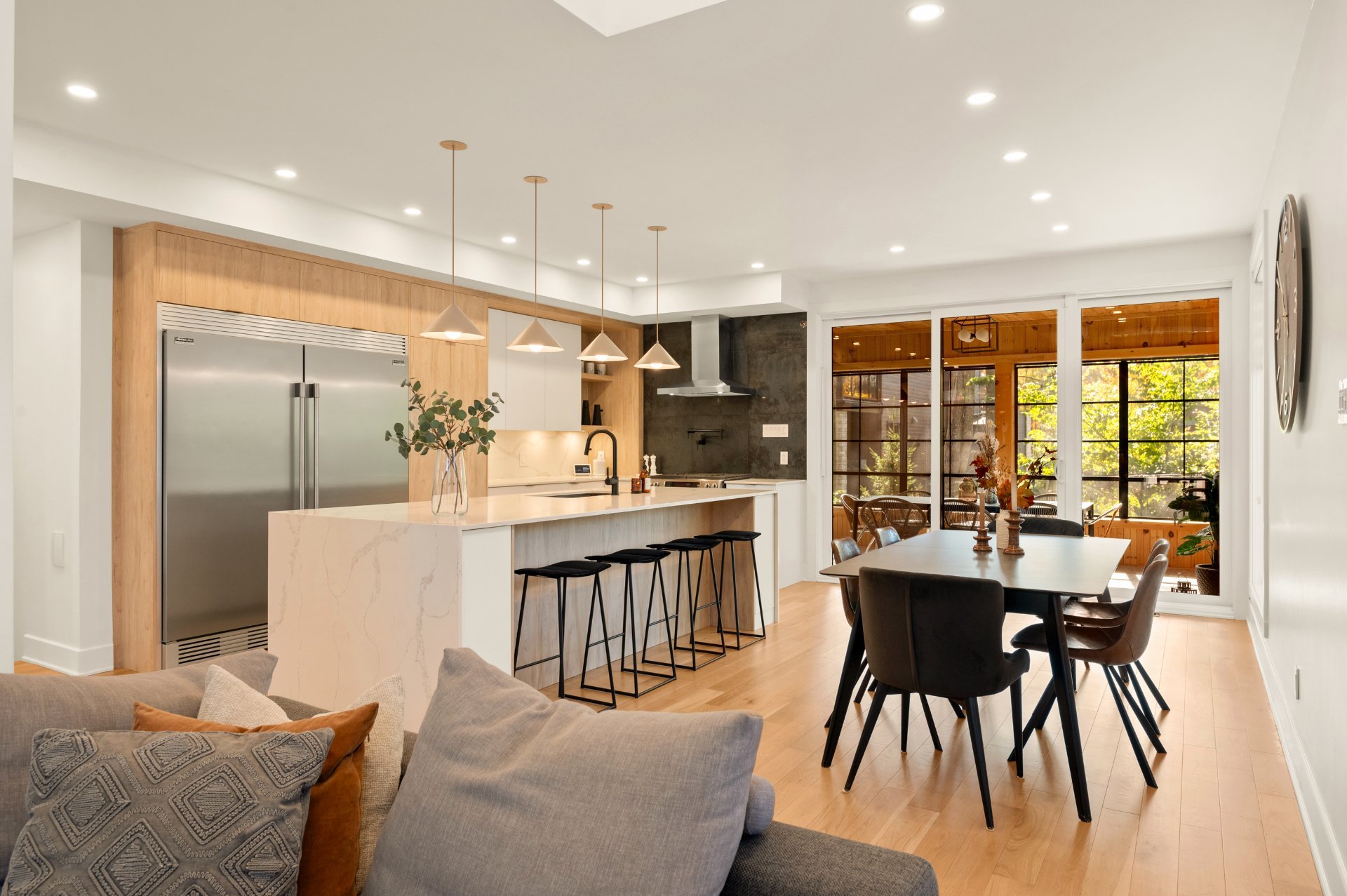 This carefully built prestige property offers bright, airy living spaces, a spectacular glass-enclosed wine cellar, and radiant heated floors on every level for absolute comfort a rare feature. It includes 4 bedrooms, 3 full bathrooms, and 1 powder room. A triple garage, a landscaped wooded lot, complete with an in-ground pool and a three-season veranda, round out the property. *Recently renovated basement to remove the intergenerational suite and restore the property to a traditional single-family configuration, a highly sought-after layout.