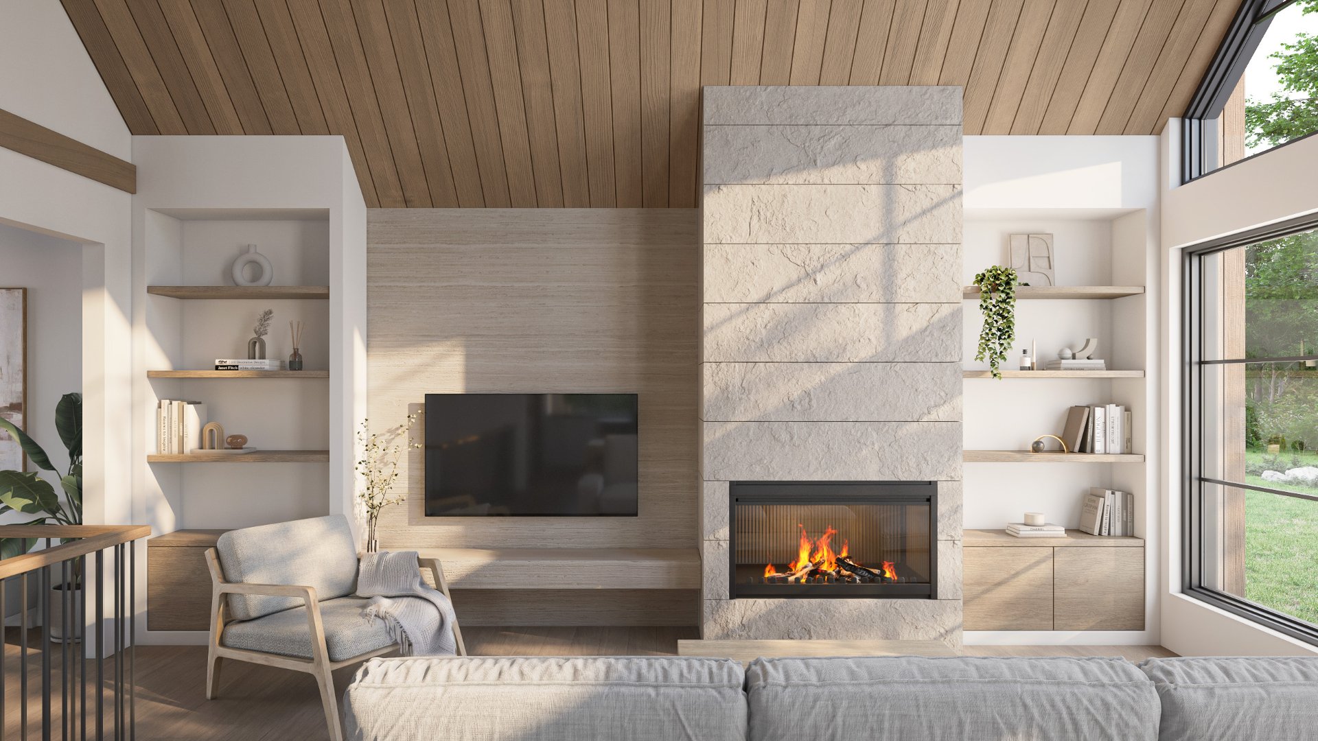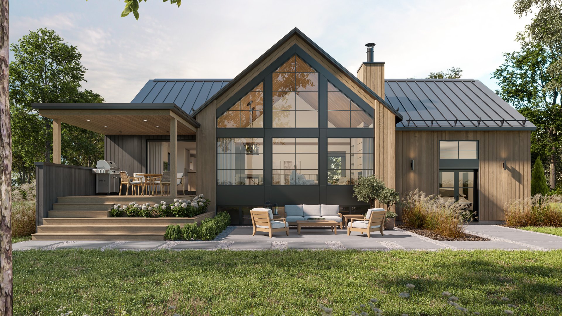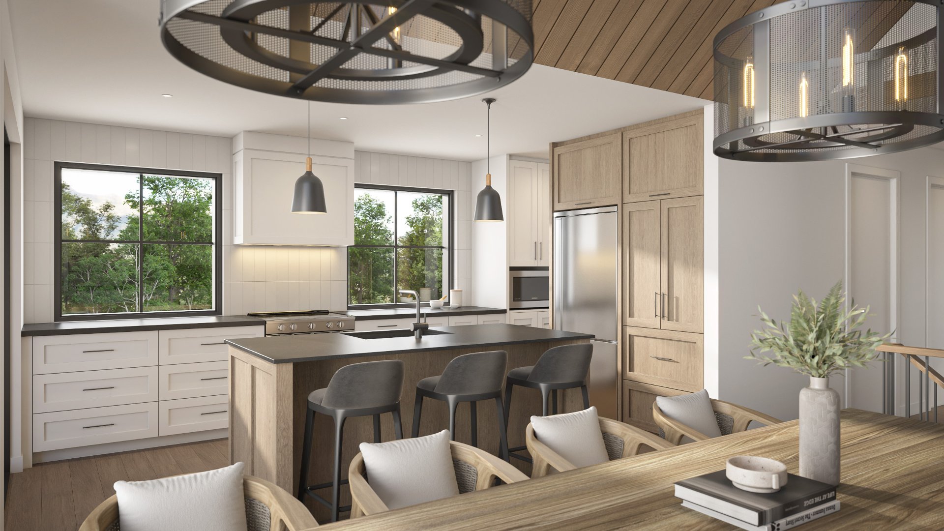 A home that blends the simplicity and warmth of transitional architecture. Clean, modern volumes meet noble materials such as warm wood and black steel, creating a refined façade that contrasts with a wide glass rear designed to maximize views of nature. The interior is compact yet highly functional, featuring a single-level layout with a master suite that includes an ensuite bathroom and walk-in closet. The kitchen, living, and dining areas flow together under a cathedral ceiling filled with natural light, opening onto a spacious covered terrace perfect for outdoor dining and relaxation. Conception by Talo.