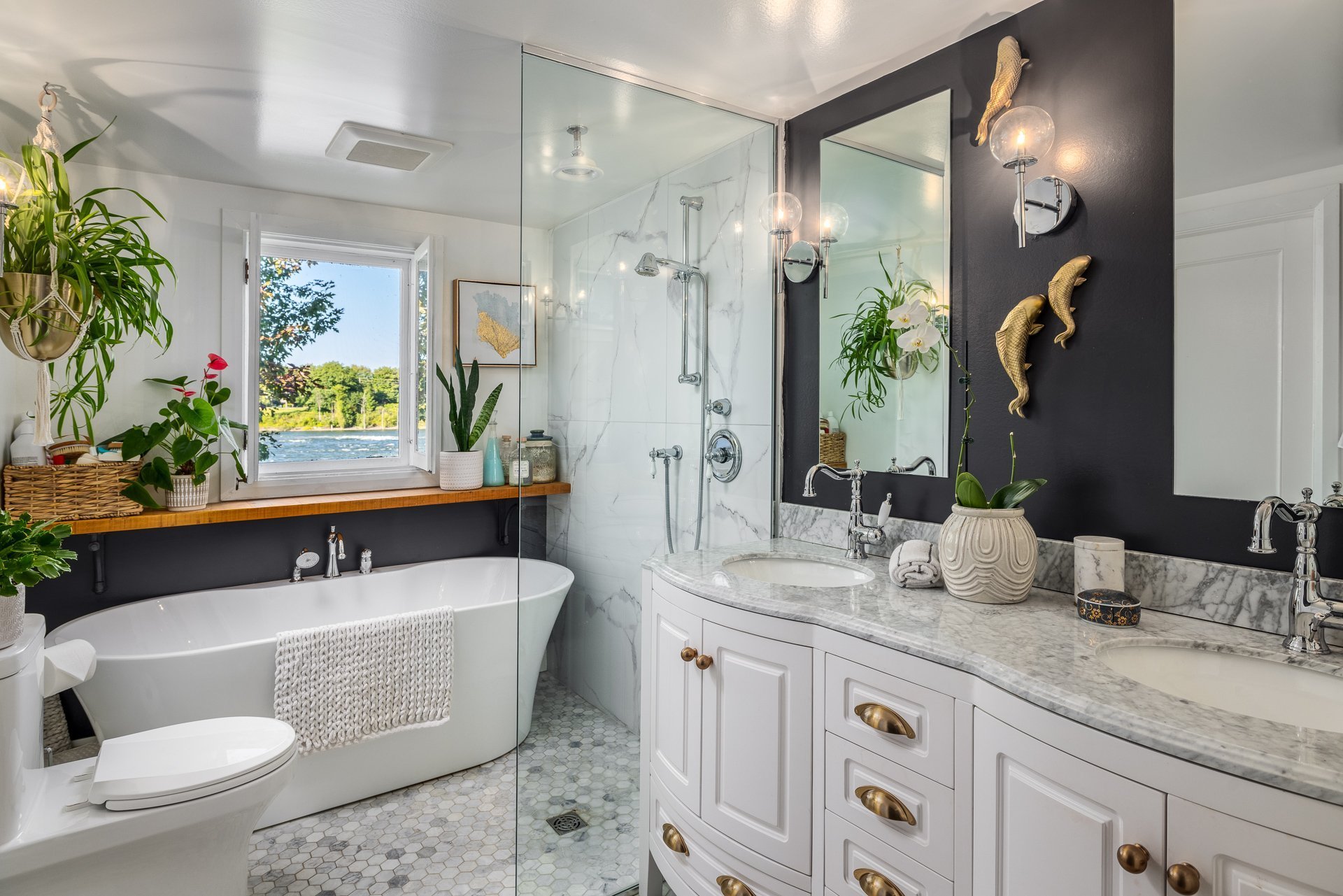 The master suite is a luxurious sanctuary with its sumptuous bathroom, featuring an elegant bathtub, a spacious dressing area, and marble floors with optional underfloor heating for unparalleled comfort.