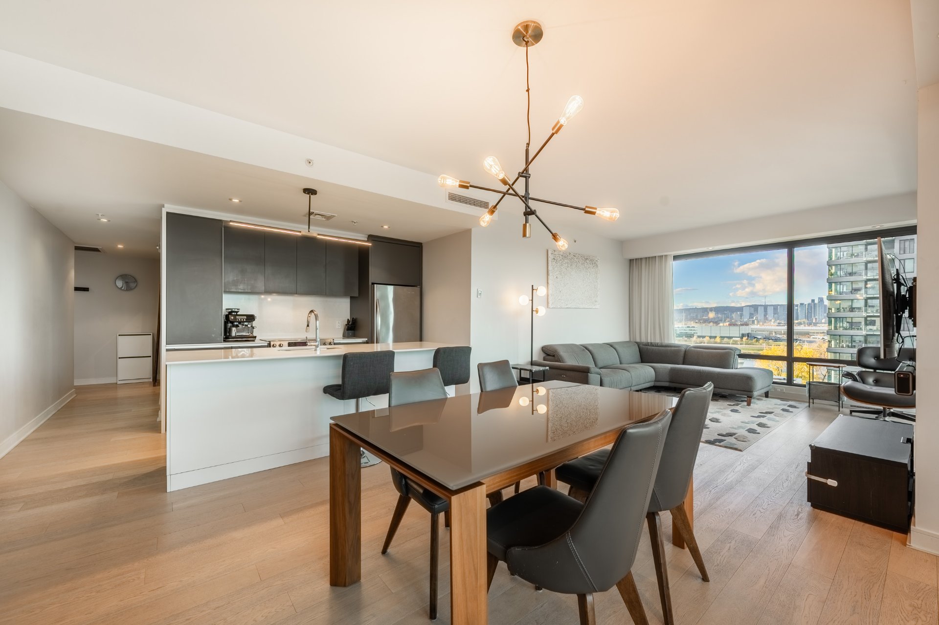 Stunning corner unit flooded with natural light in the prestigious Évolo I tower, offering spectacular views of the river and city skyline. This 1,130 sq.ft. condo stands out with its floor-to-ceiling windows, open-concept layout, and refined finishes. Two bedrooms, including a primary suite with walk-in closet and ensuite bathroom. LEED-certified building with 24-hour concierge, indoor pool, spa, gym, guest suite, and riverside gardens. Heating, air conditioning, and hot water included. Two indoor parking spaces and large storage locker.