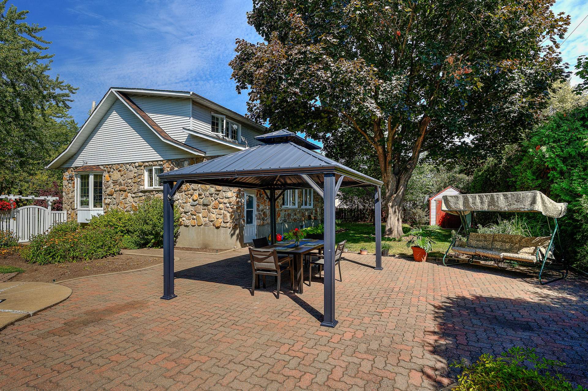Exterior: Heated inground pool, landscaped garden with gazebo, and two sheds. Located at the end of a quiet U-shaped street, this property offers privacy, tranquility, and unique proximity to the river.