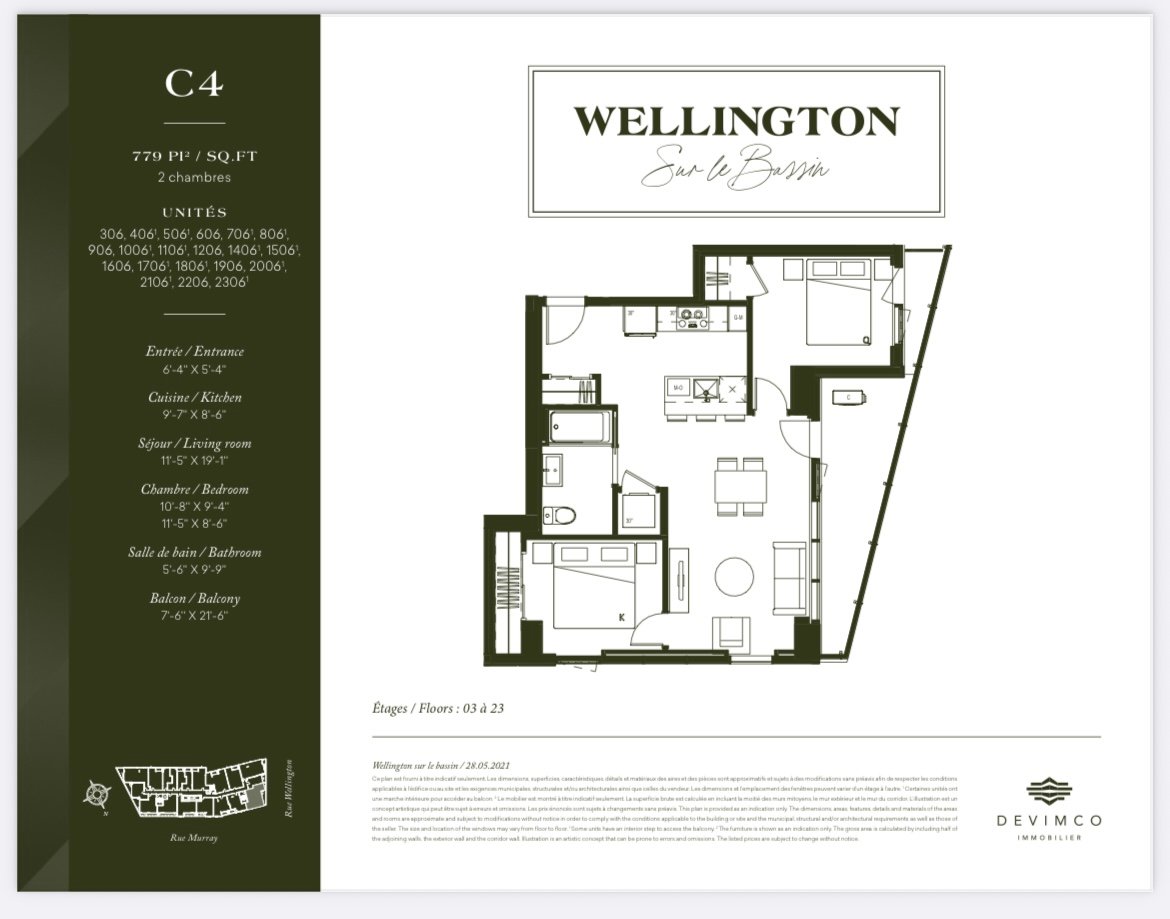 This angular, prism-like tower features 380 units offering up to 1,304 sq. ft. of space. Set in an environment inspired by understated elegance and subtle luxury, Wellington sur le Bassin offers studios and 1- to 3-bedroom condos imbued with refined sophistication.