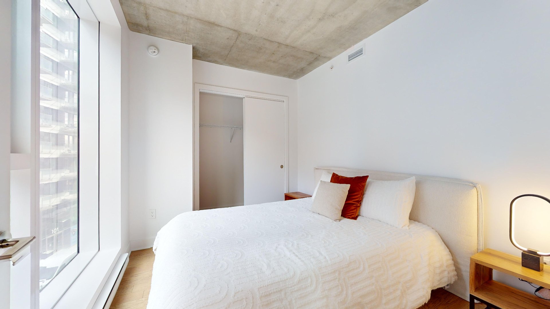 This angular, prism-like tower features 380 units offering up to 1,304 sq. ft. of space. Set in an environment inspired by understated elegance and subtle luxury, Wellington sur le Bassin offers studios and 1- to 3-bedroom condos imbued with refined sophistication. The project also includes exclusive common areas such as a fitness center, an outdoor pool, a relaxation beach with a landscaped terrace, and an urban lounge.