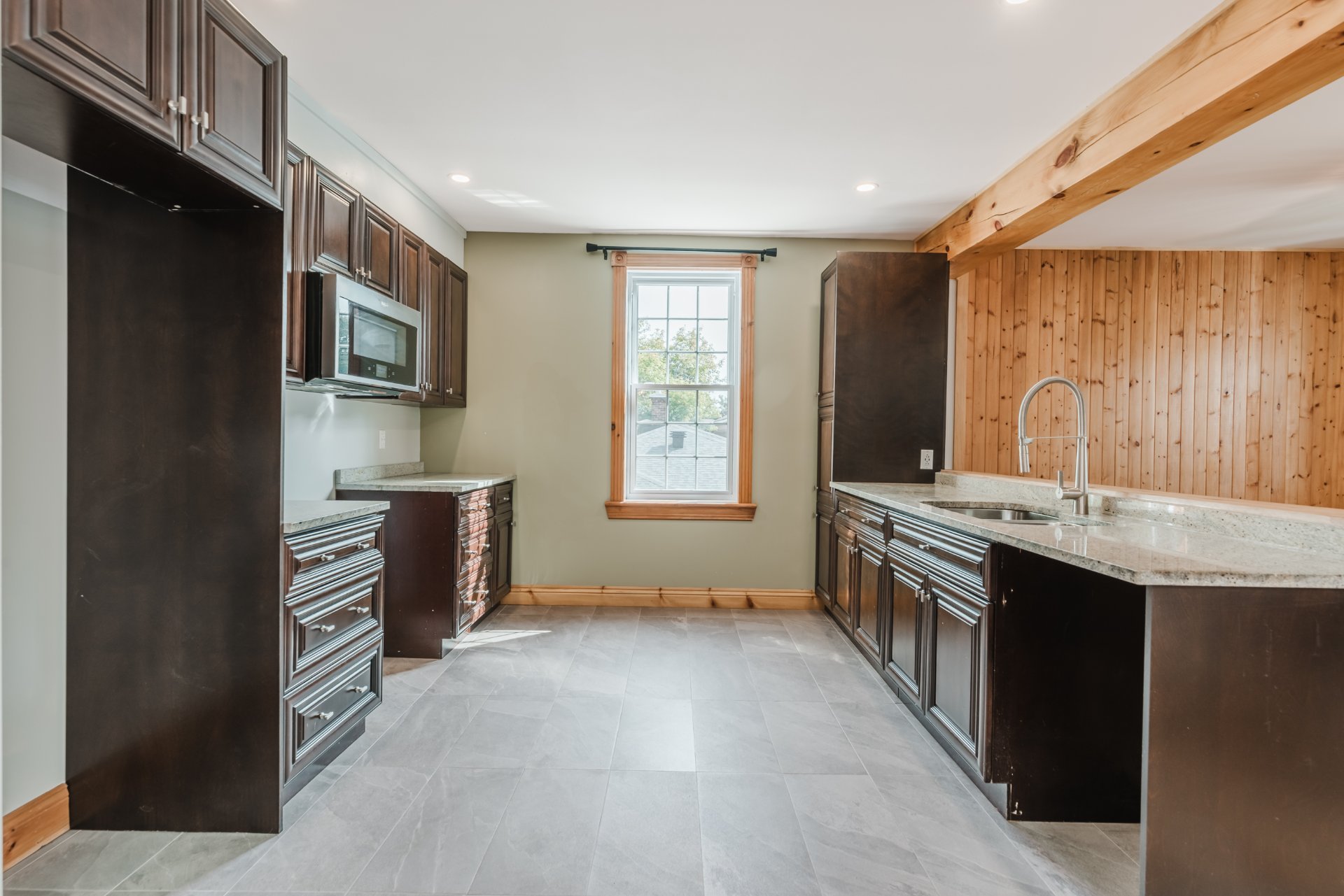 + Main floor: new kitchen with cork flooring and quartz countertops, hardwood floors, ceramic tile in the entrance, shower added to bathroom.