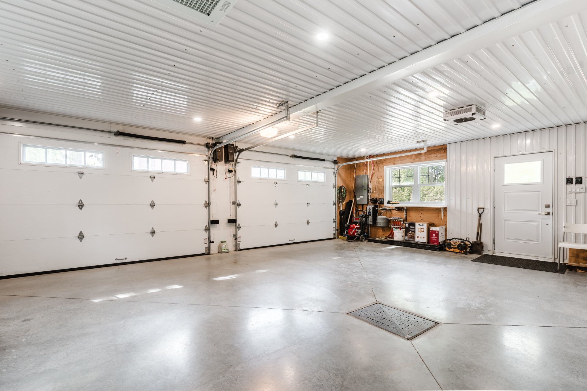 + High-end double garage: heated glycol flooring, drain, additional ceiling heating, sink with running water, interior finish in metal & wood, and a spacious open area upstairs.