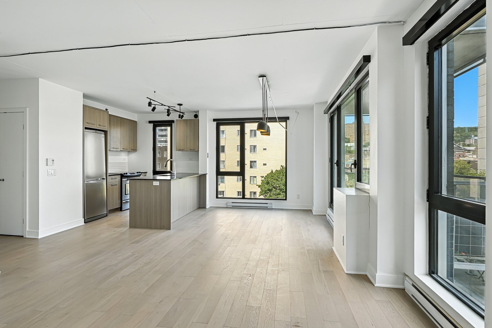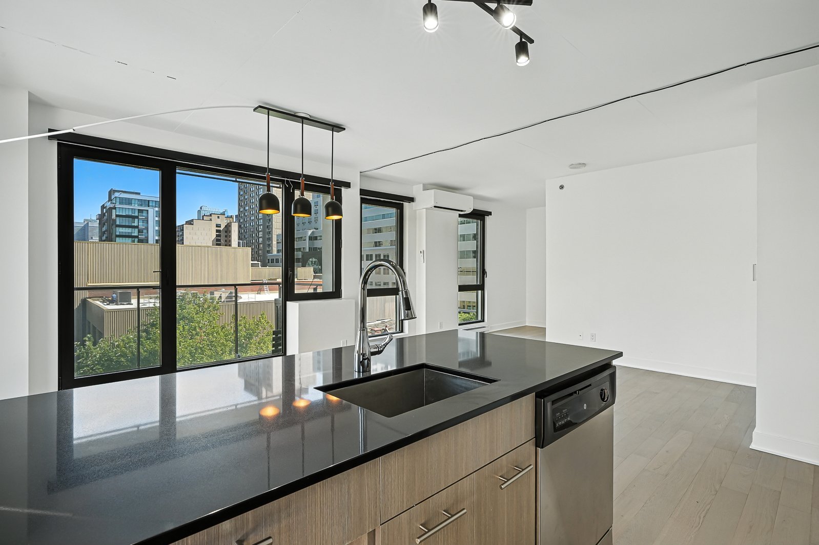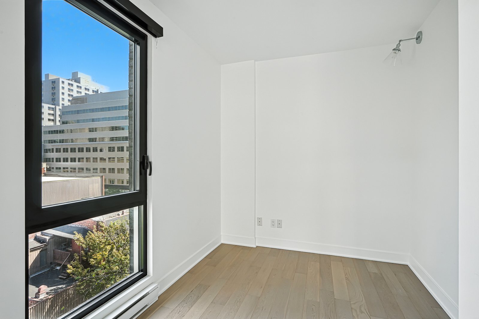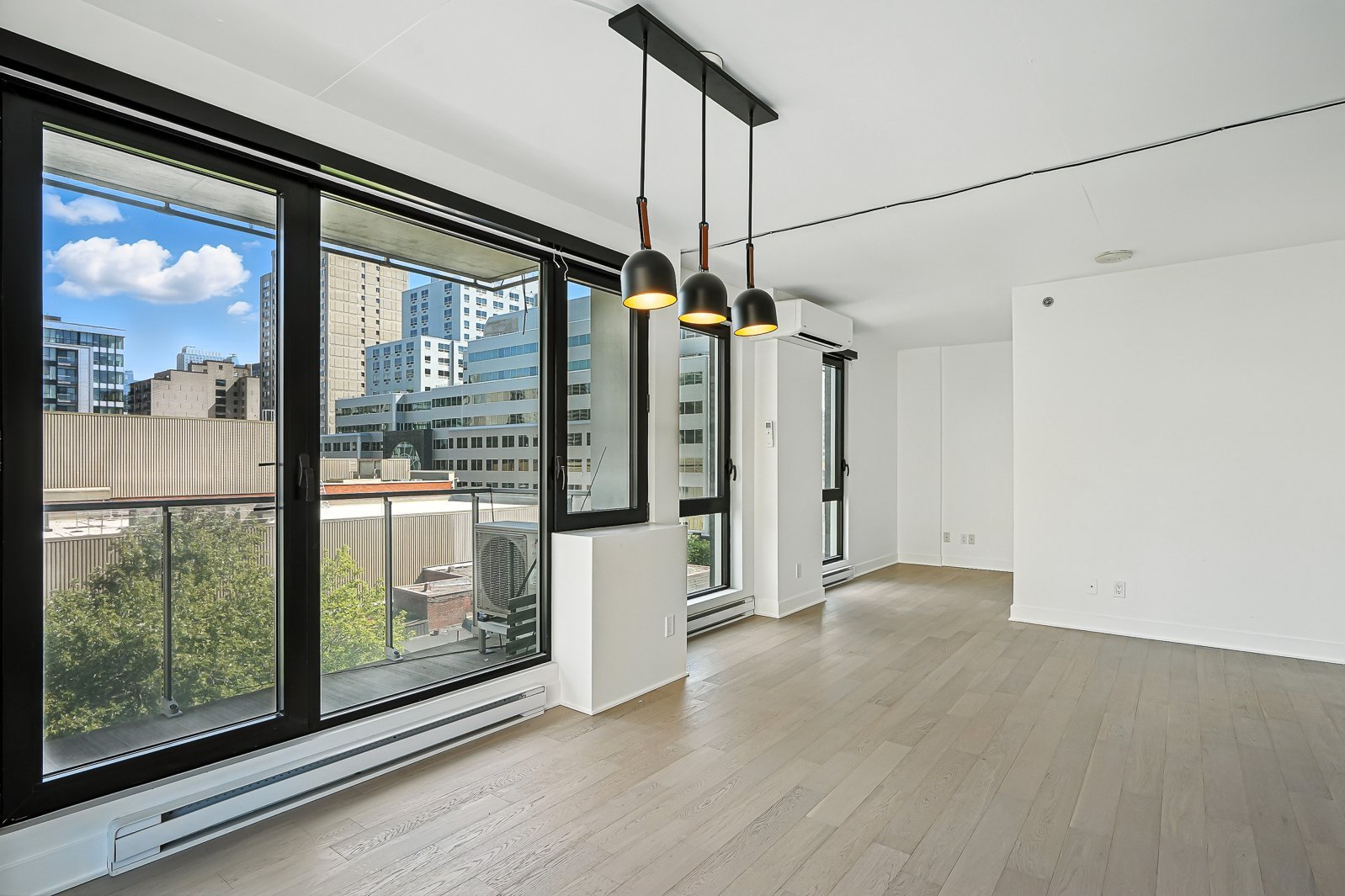Welcome to this stunning and spacious corner unit ideally located in the heart of downtown Montreal! This bright one-bedroom condo with a versatile den/office offers an open-concept living and dining area, a modern bathroom, and floor-to-ceiling windows that fill the space with natural light. Featuring new hardwood floors throughout, a mini-split air conditioner with heating, updated light fixtures, and a large private balcony, this unit combines comfort and style. Residents enjoy exceptional amenities including a rooftop terrace with pool and breathtaking city views, an indoor-outdoor pool connected to a spa, and a fully equipped gym. Perfectly situated near restaurants, shops, museums, public transportation and more, this residence offers the very best of urban living.
