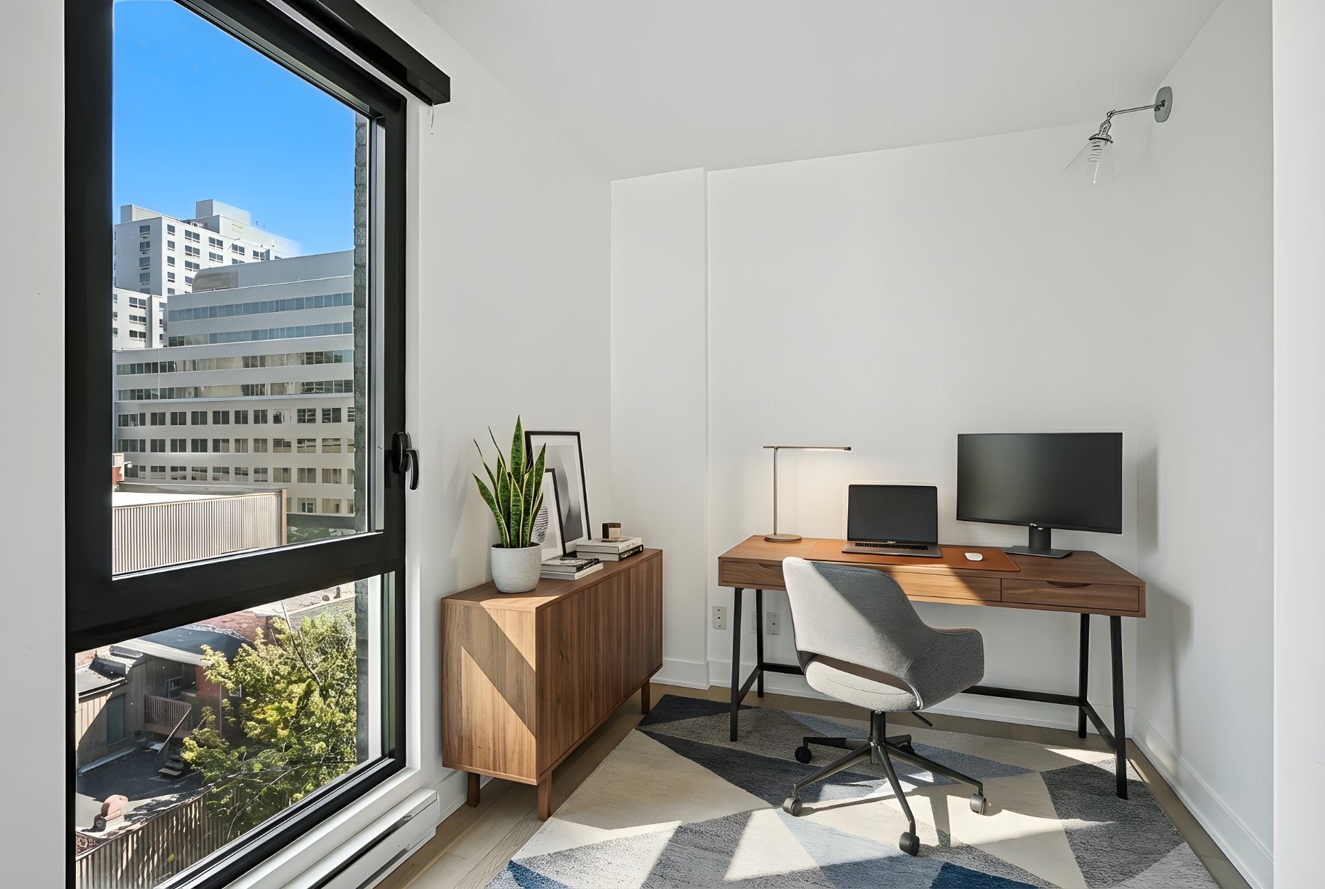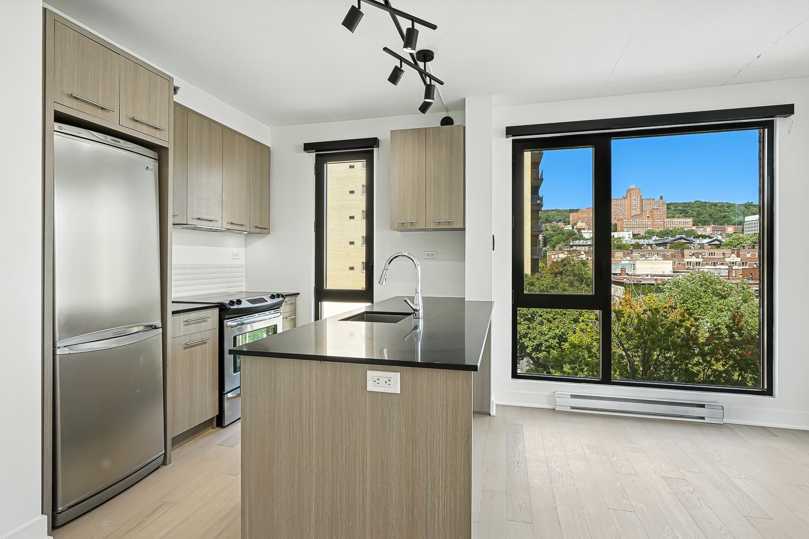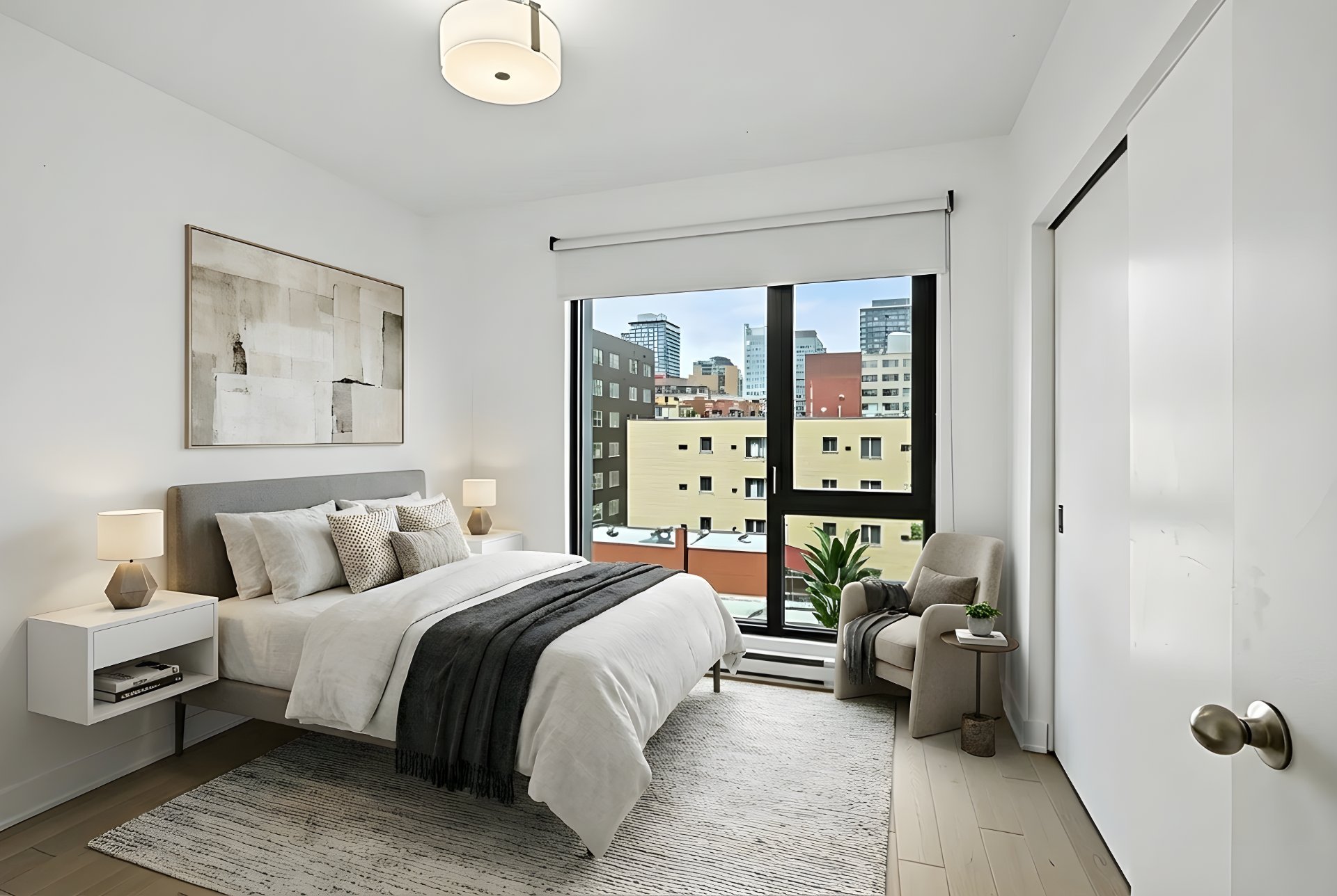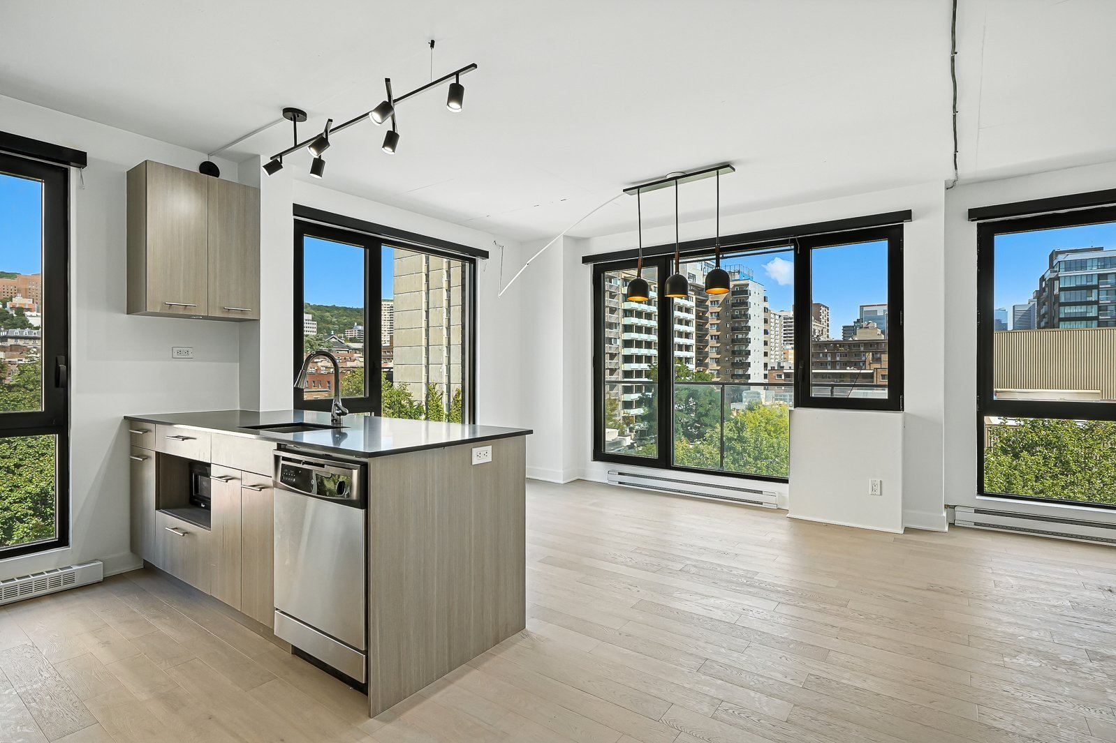 Welcome to this stunning and spacious corner unit ideally located in the heart of downtown Montreal! This bright one-bedroom condo with a versatile den/office offers an open-concept living and dining area, a modern bathroom, and floor-to-ceiling windows that fill the space with natural light. Featuring new hardwood floors throughout, a mini-split air conditioner with heating, updated light fixtures, and a large private balcony, this unit combines comfort and style. Residents enjoy exceptional amenities including a rooftop terrace with pool and breathtaking city views, an indoor-outdoor pool connected to a spa, and a fully equipped gym. Perfectly situated near restaurants, shops, museums, public transportation and more, this residence offers the very best of urban living.