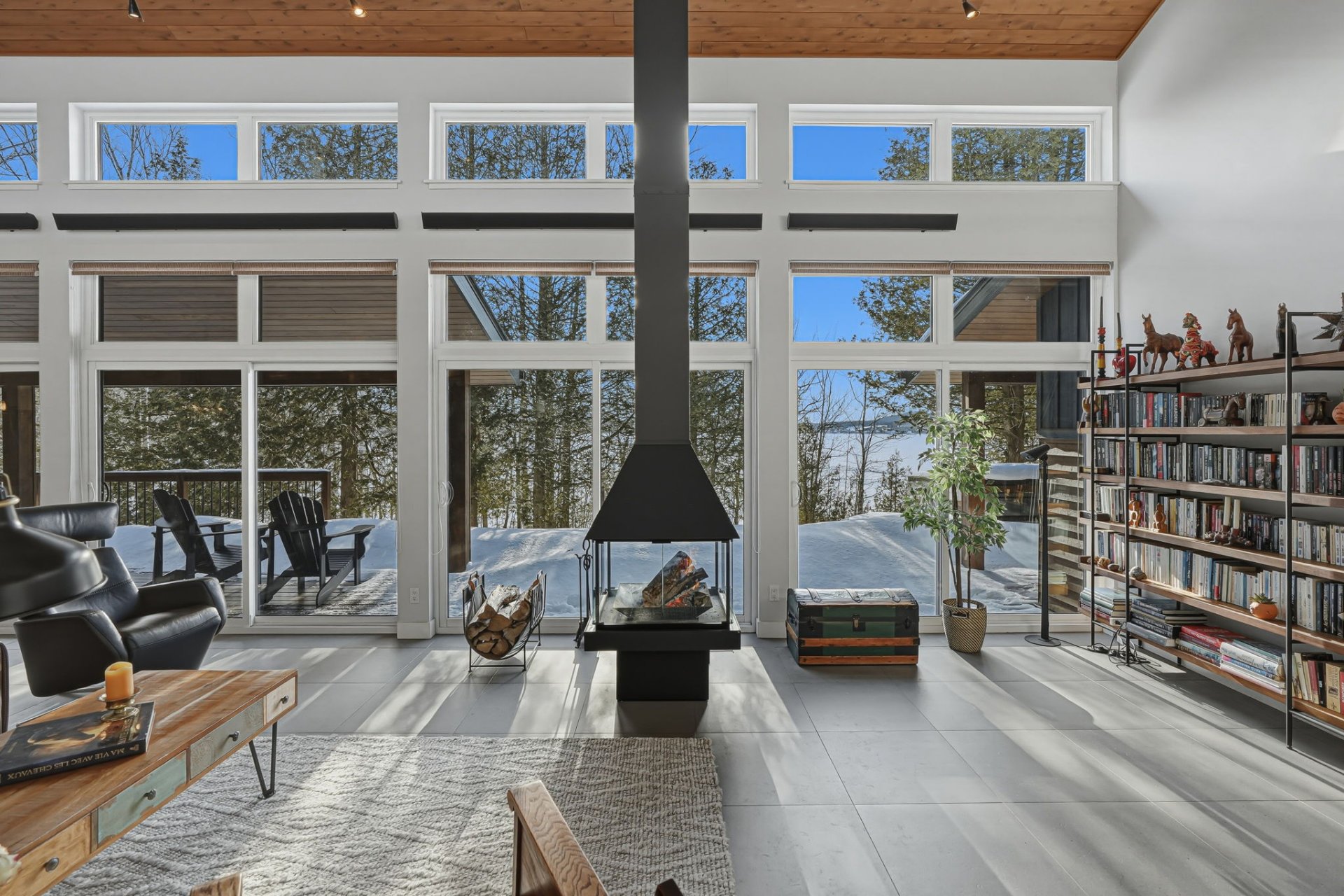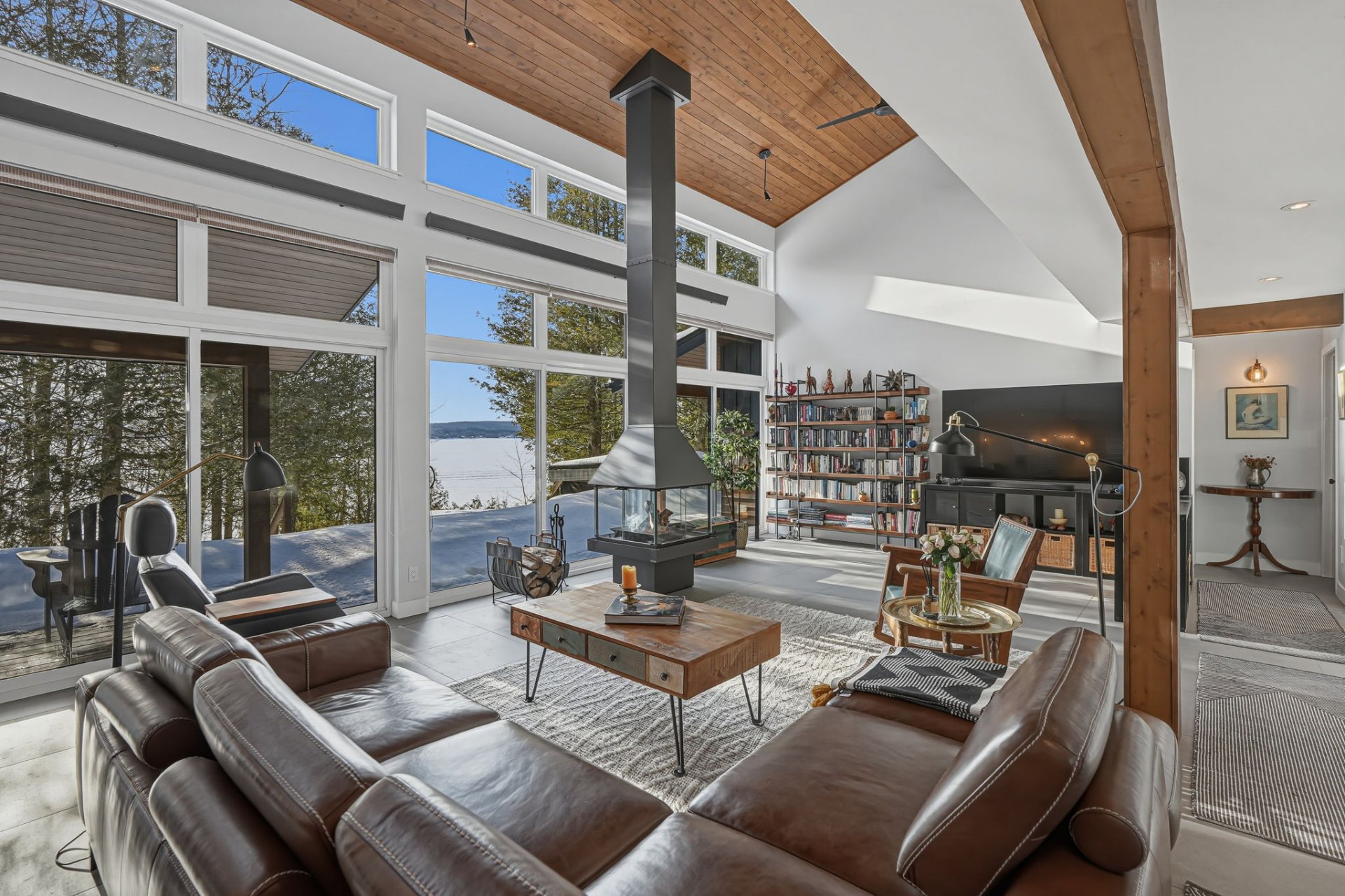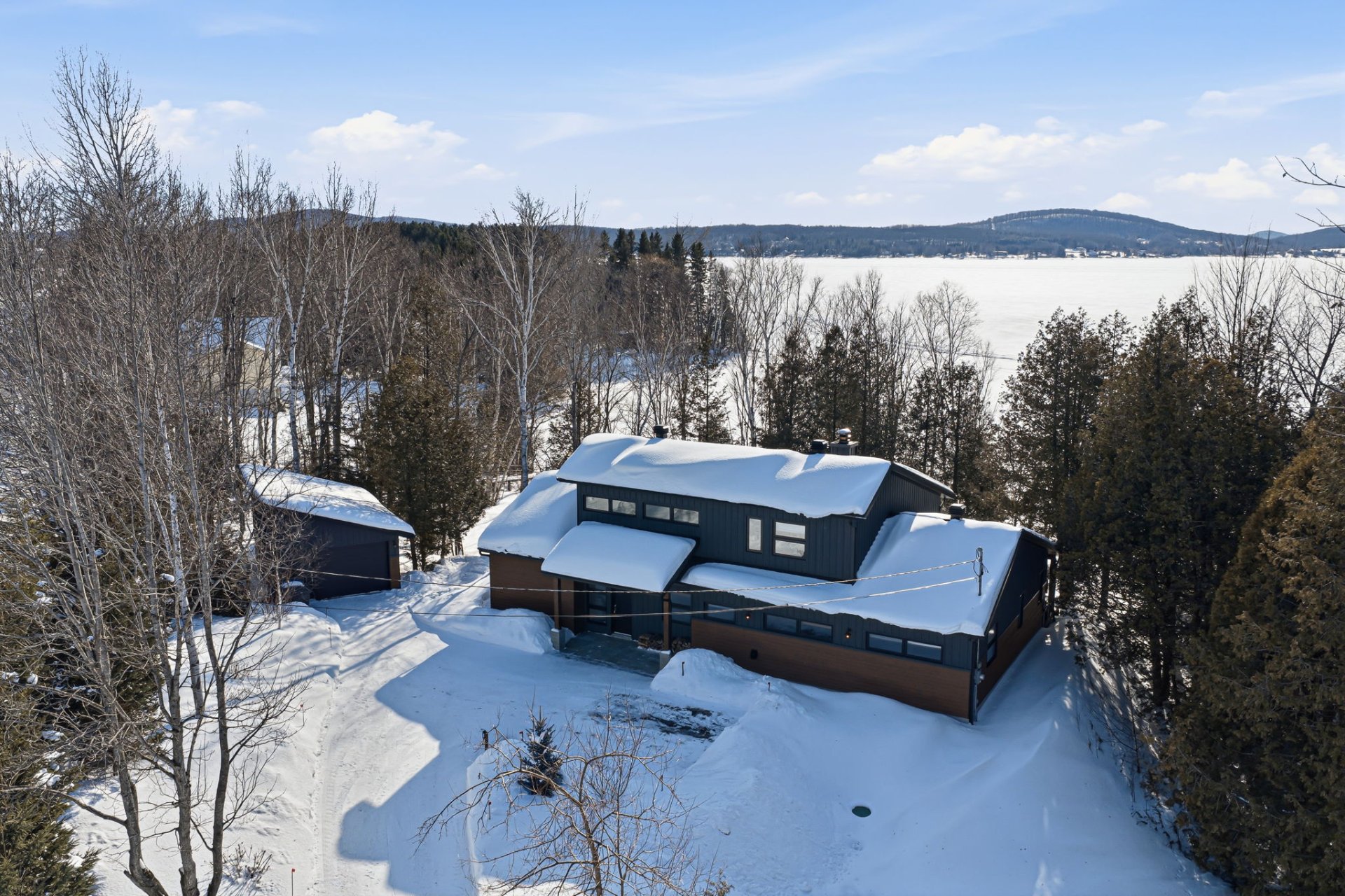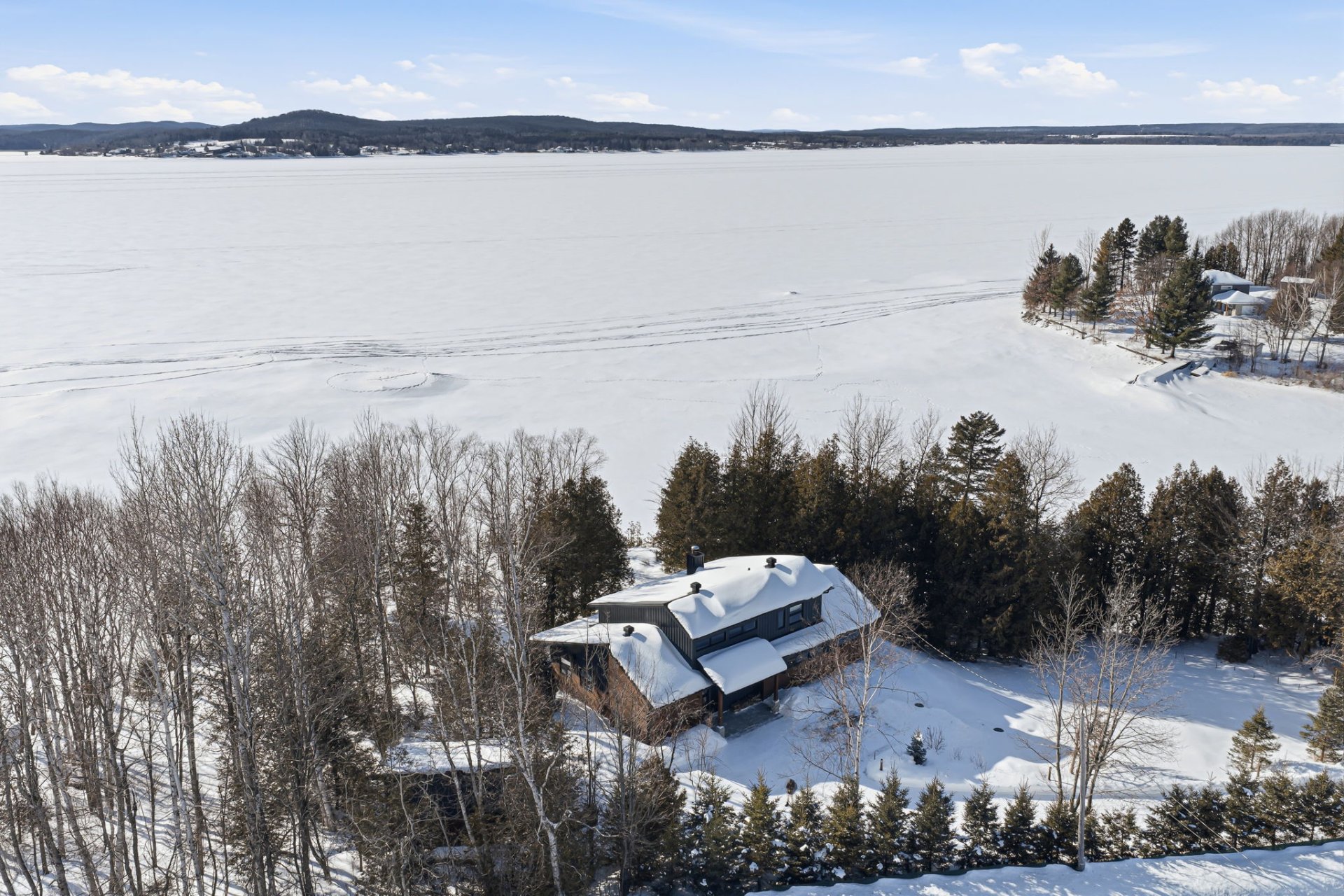 Architect-designed residence on the shores of Grand Lac Saint-François, offering ± 500 linear feet of waterfront on a rare 1.47-acre lot with sunset exposure. Its modern architecture emphasizes clean lines, natural light and a seamless integration with the surrounding landscape. Built on a concrete slab with heated floors, the home features three bedrooms, open living spaces and ceilings reaching up to 18 feet. Set within a bay and elevated at a privileged vantage point, the property enjoys exceptional lake views, a beach with dock as well as boat launch access, all located approximately 1 hour and 45 minutes from Québec City.