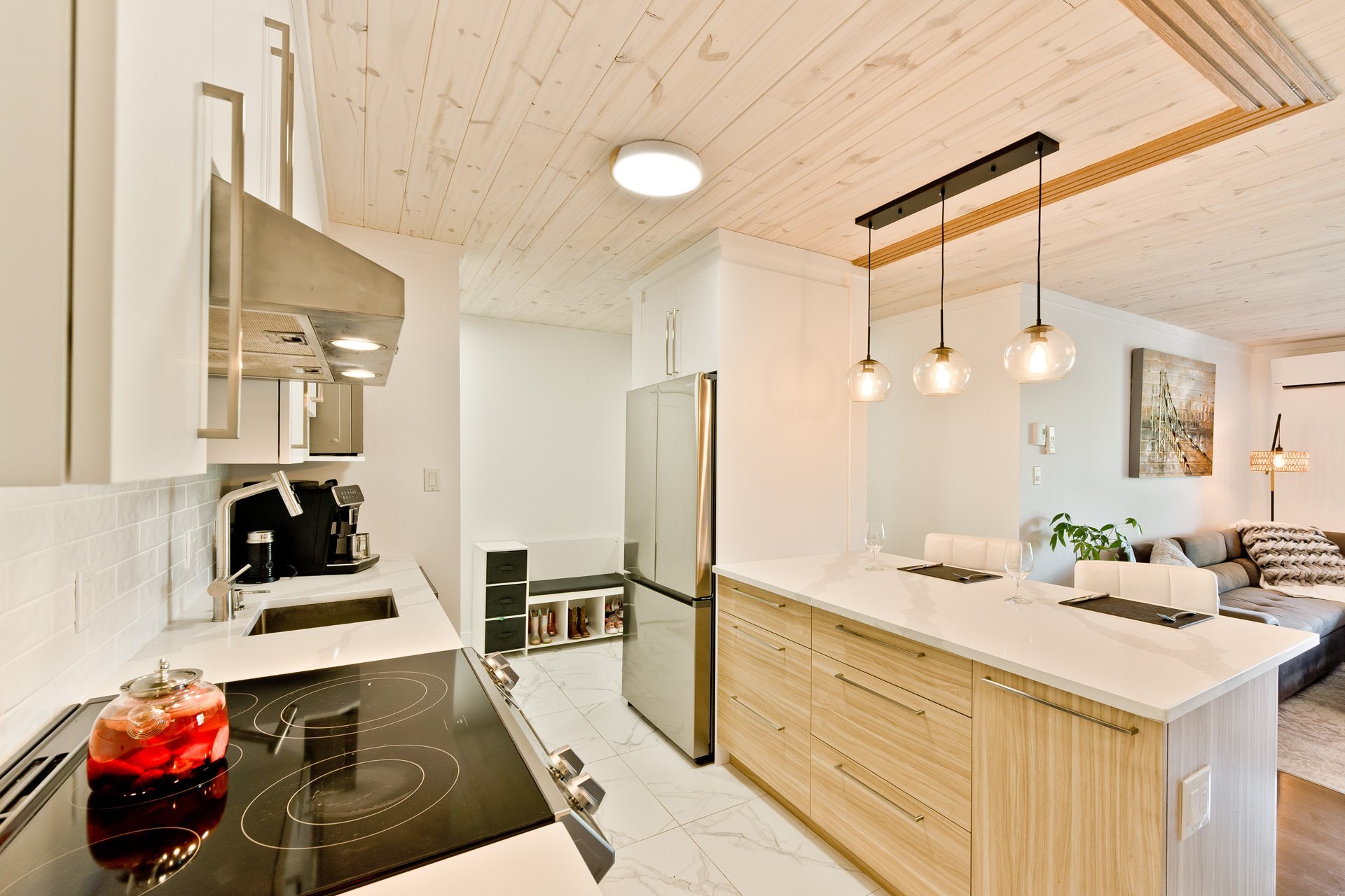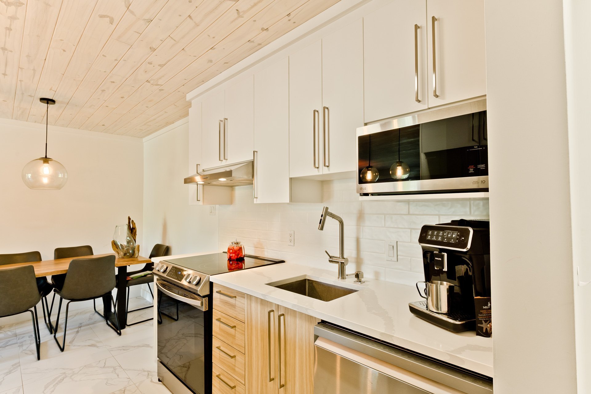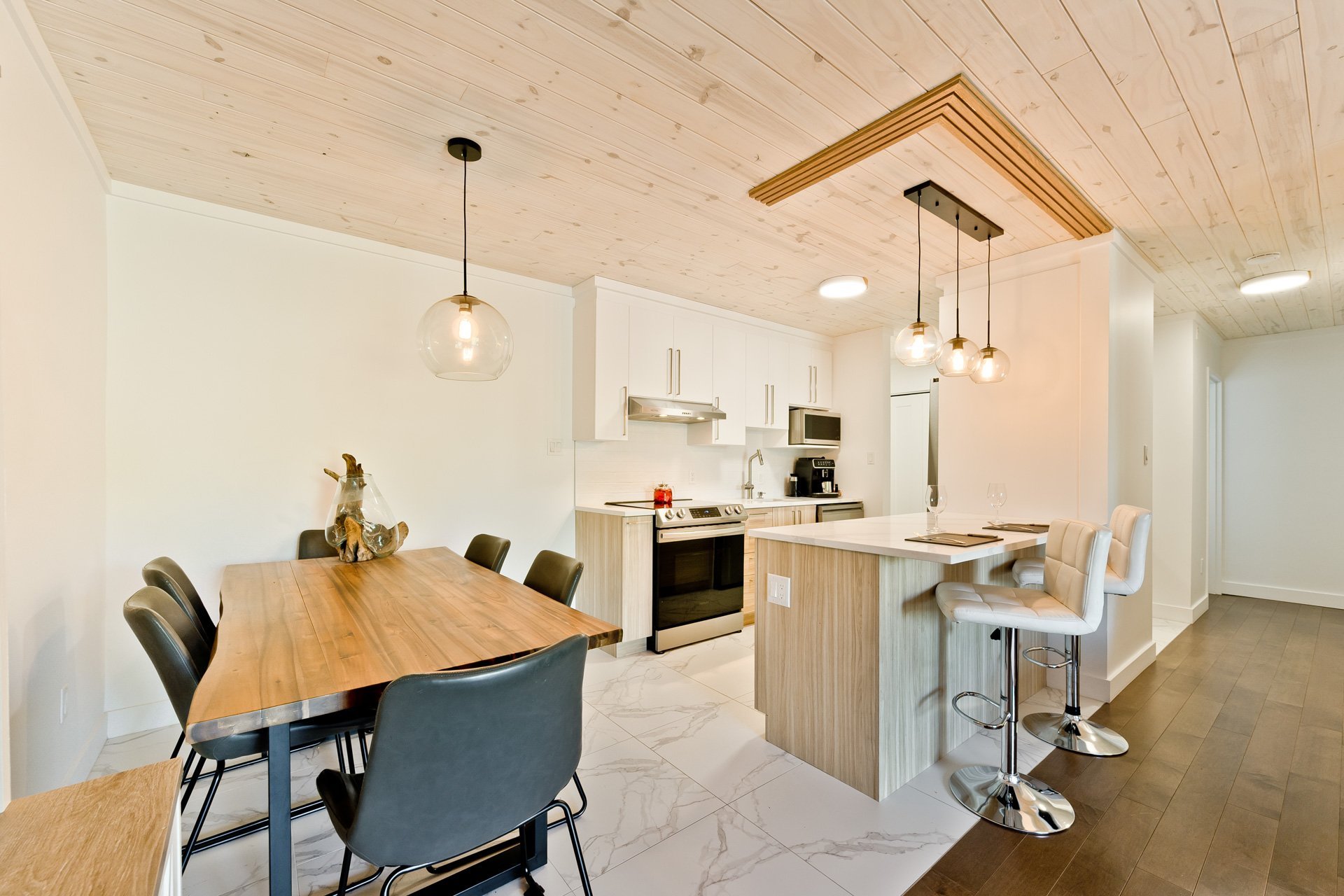 This condo, completely renovated in 2024, is a real gem. Cute and warm with its wood-panelled ceilings, it marries charm and modernity to perfection. The redesigned kitchen, with its quartz countertops and ceramic floors, opens onto a bright, welcoming living space. The bathroom has also been completely redone; everything is brand new.