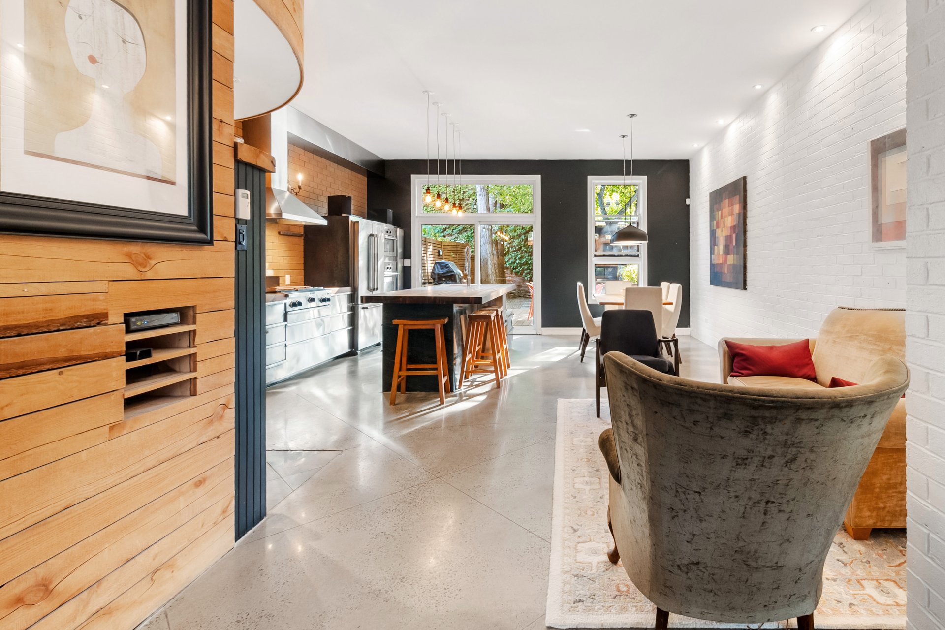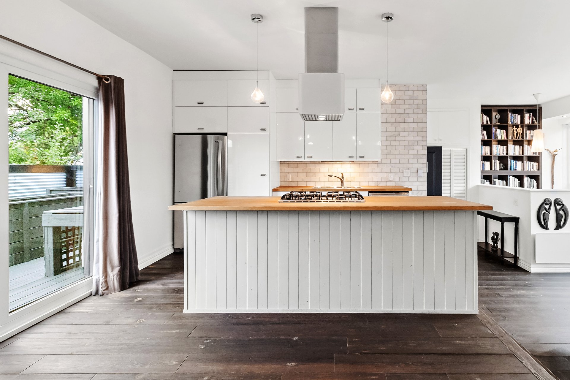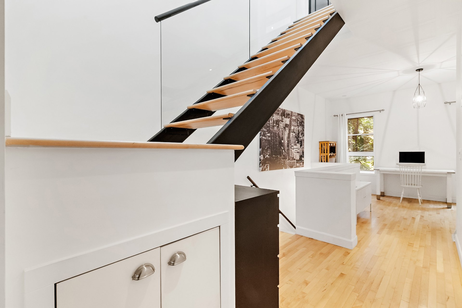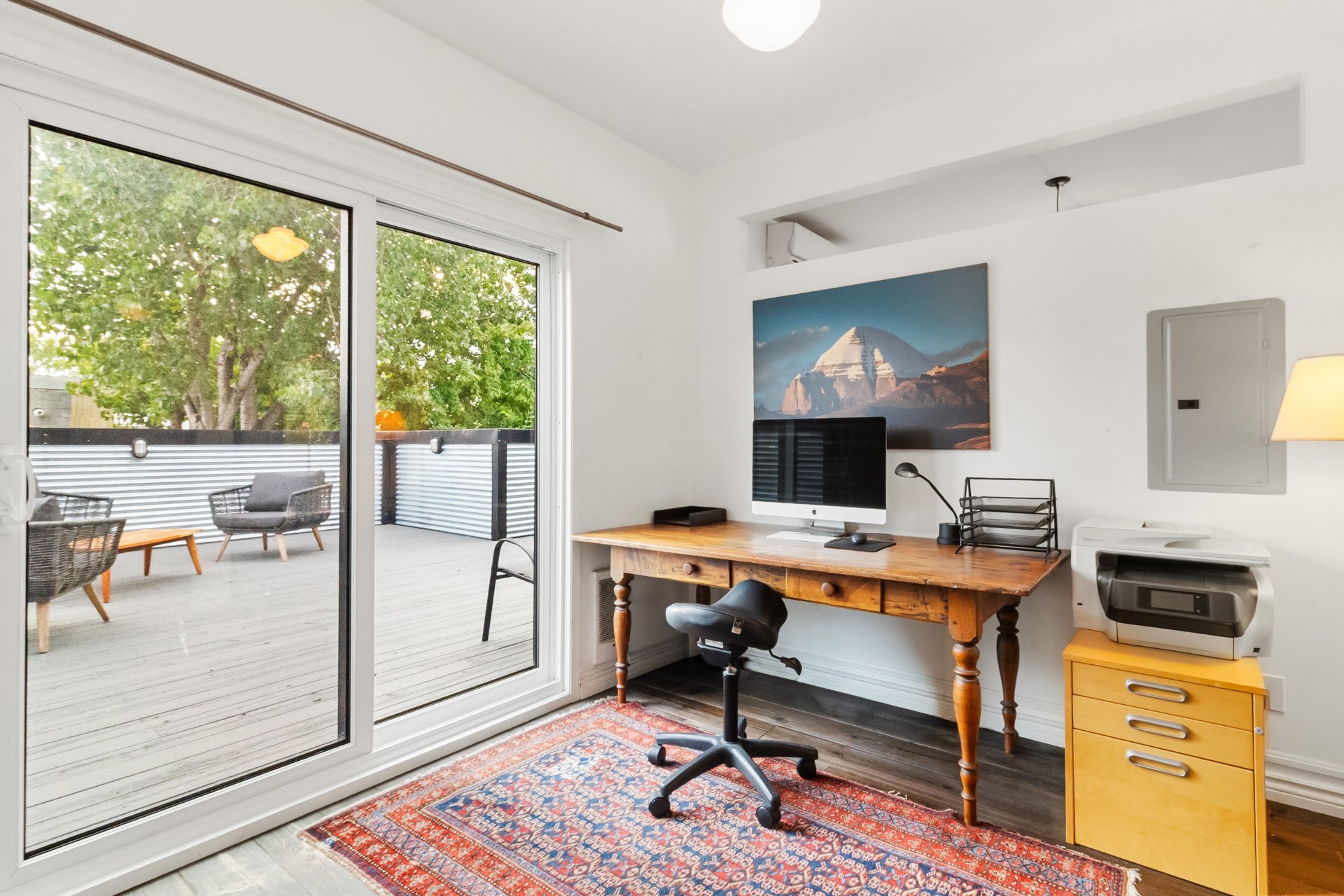 UNIQUE | Three-level townhouse with a large private courtyard and garden studio. Bright open-plan main floor with den, dining area, and a chef's kitchen with an island. Three bedrooms plus an office, two full bathrooms and one powder room. The top floor is a true great room with a secondary kitchen and direct access to an expansive private rooftop-style terrace. The private courtyard is fully landscaped with a wood deck and a charming outbuilding with mezzanine--ideal as a studio or playroom. Prime Saint-Henri location, steps to Atwater Market, the Lachine Canal, bike paths, parks, cafés/restaurants, and the metro.