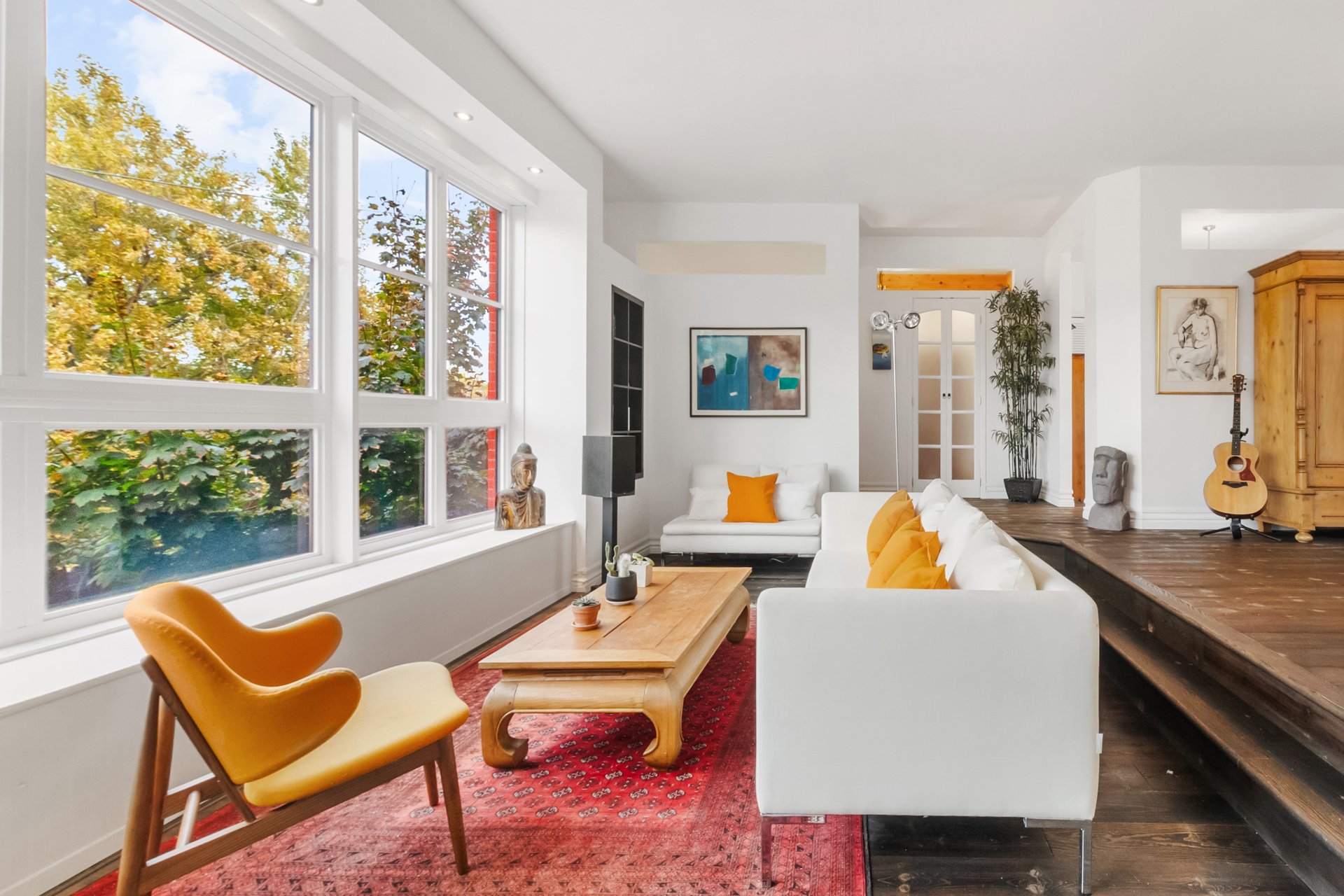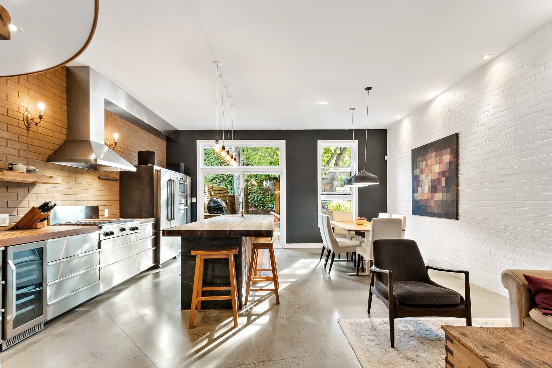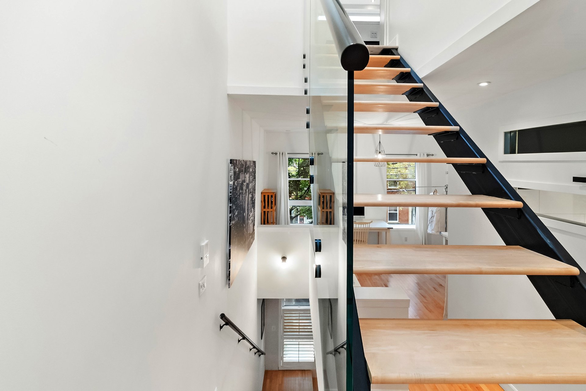 UNIQUE | Three-level townhouse with a large private courtyard and garden studio. Bright open-plan main floor with den, dining area, and a chef's kitchen with an island. Three bedrooms plus an office, two full bathrooms and one powder room. The top floor is a true great room with a secondary kitchen and direct access to an expansive private rooftop-style terrace. The private courtyard is fully landscaped with a wood deck and a charming outbuilding with mezzanine--ideal as a studio or playroom. Prime Saint-Henri location, steps to Atwater Market, the Lachine Canal, bike paths, parks, cafés/restaurants, and the metro.