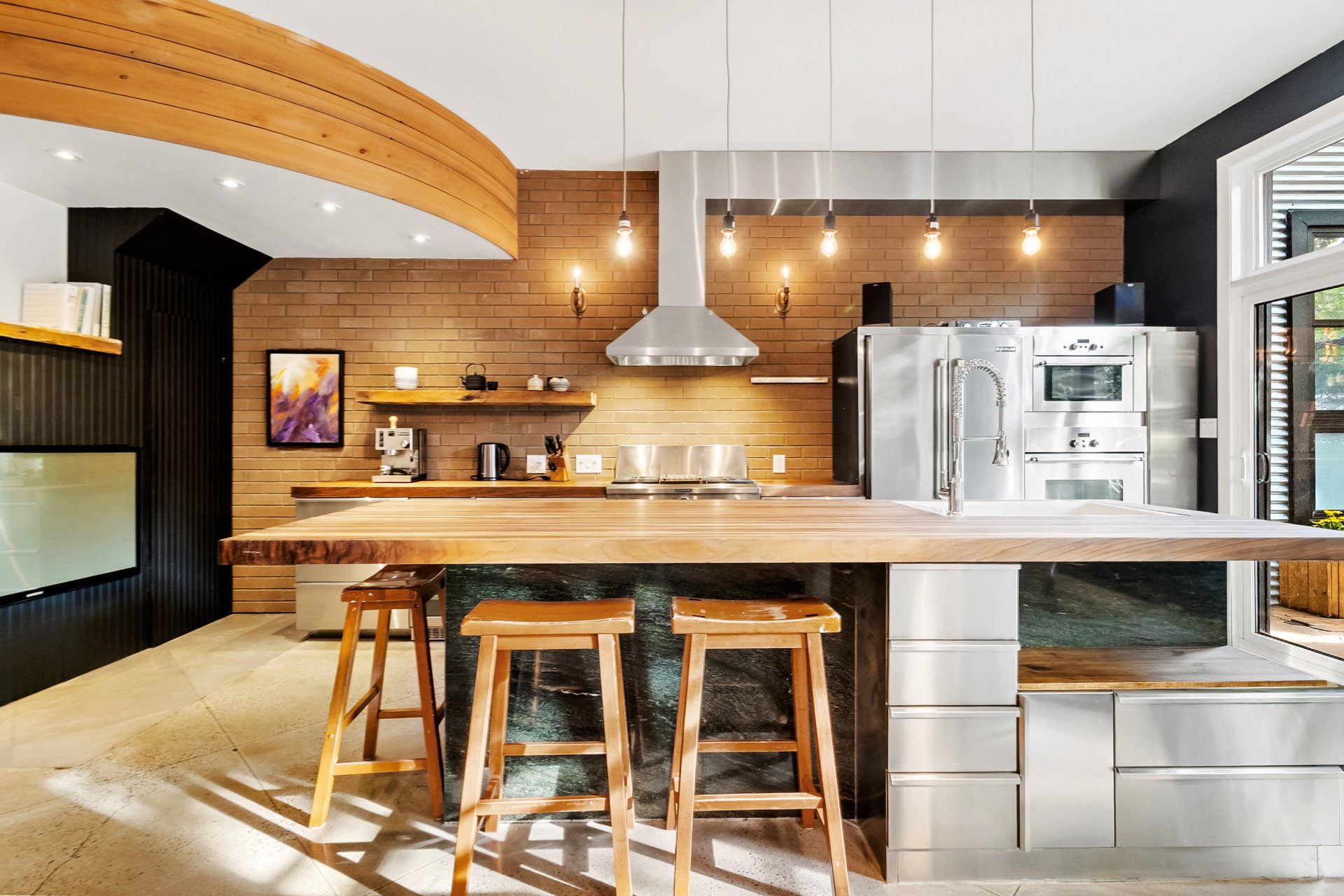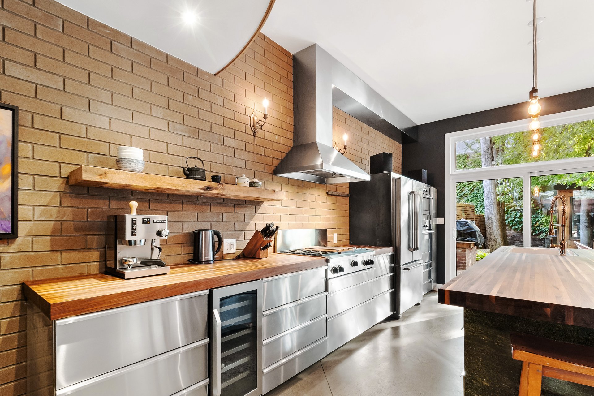 - Stainless-steel kitchen with island, gas range and built-in oven.