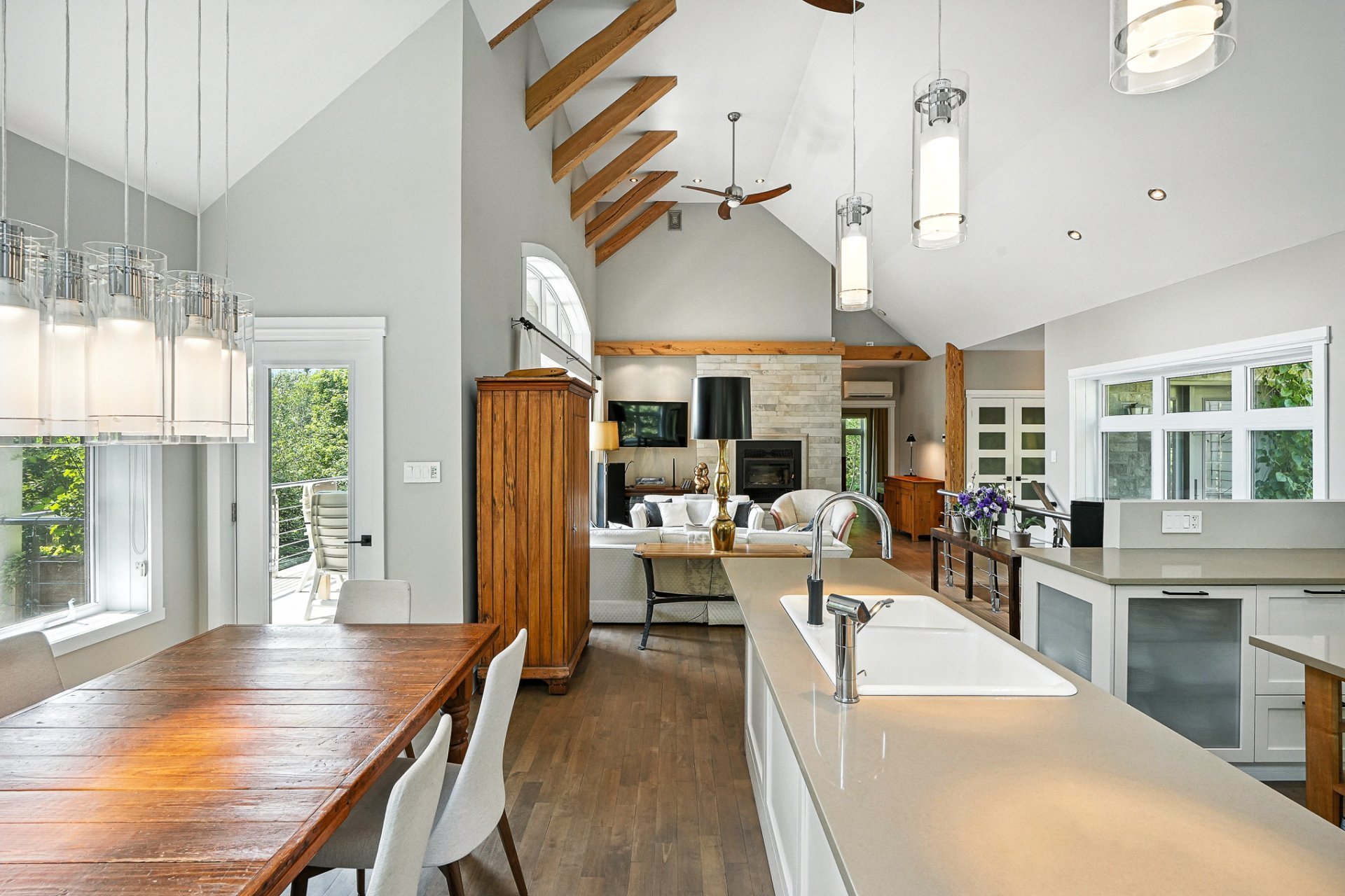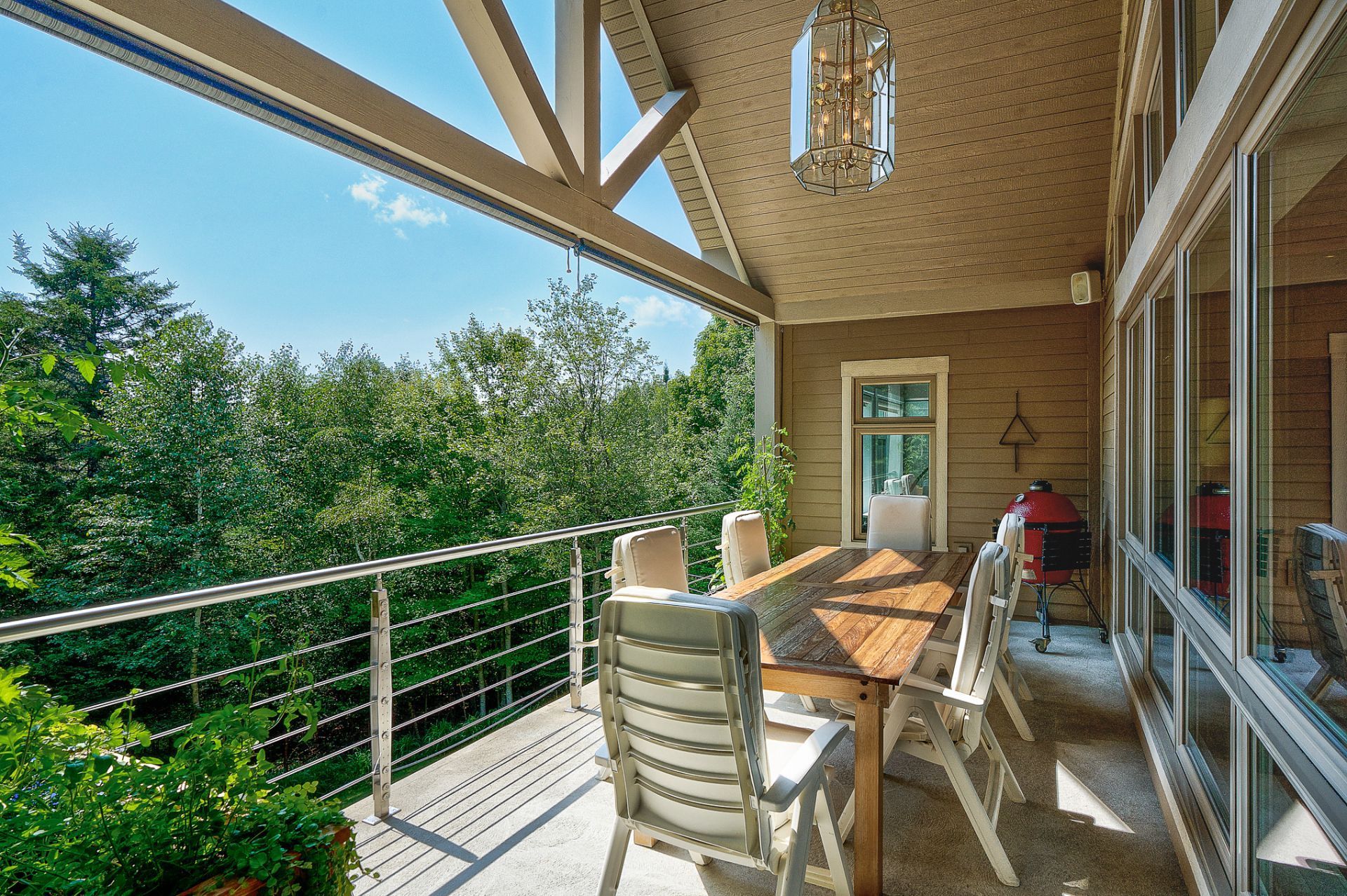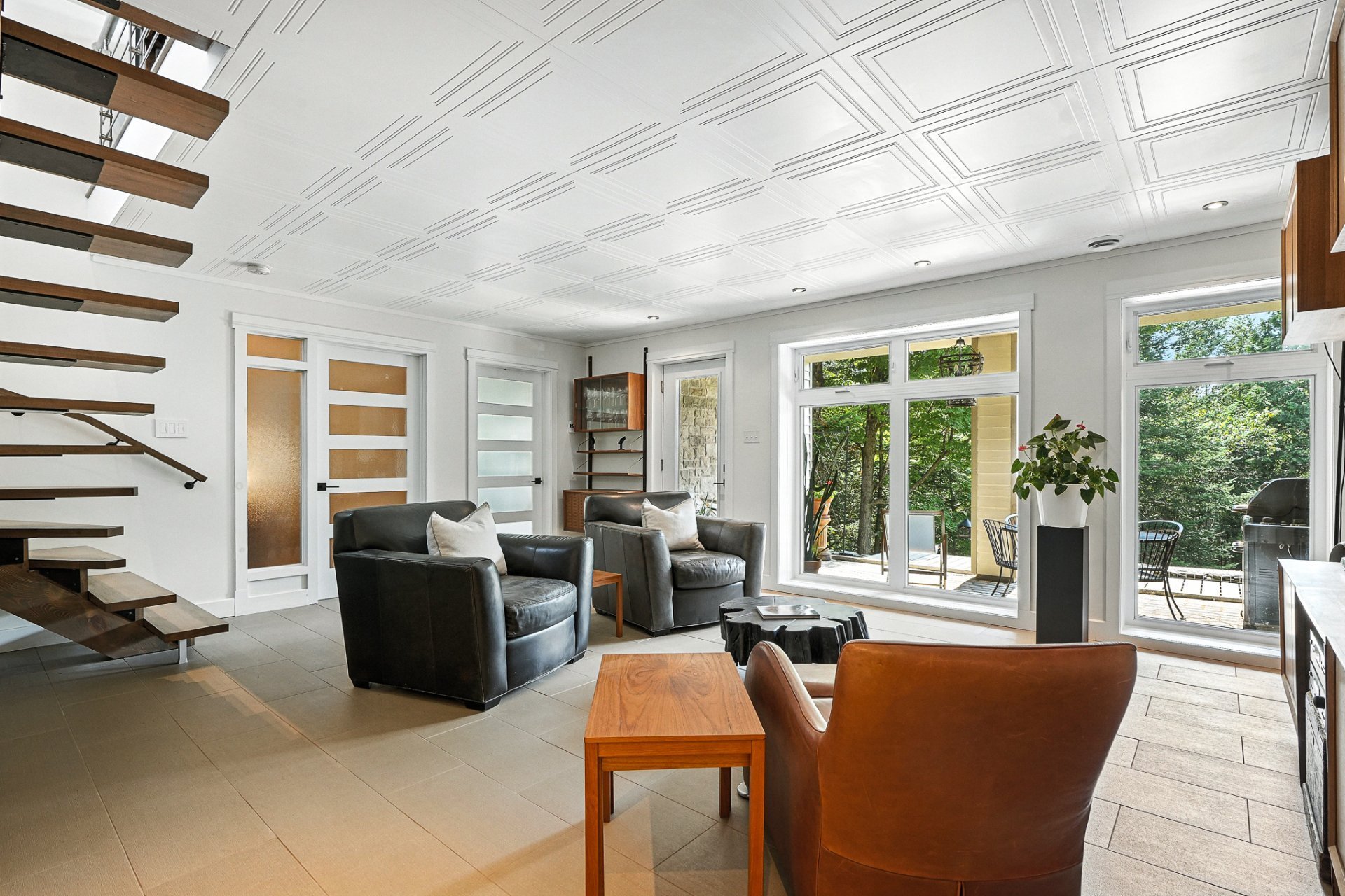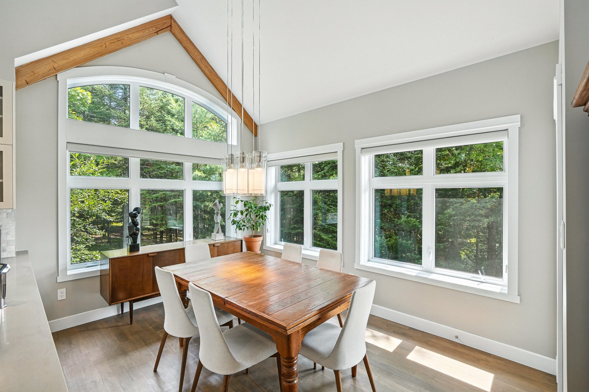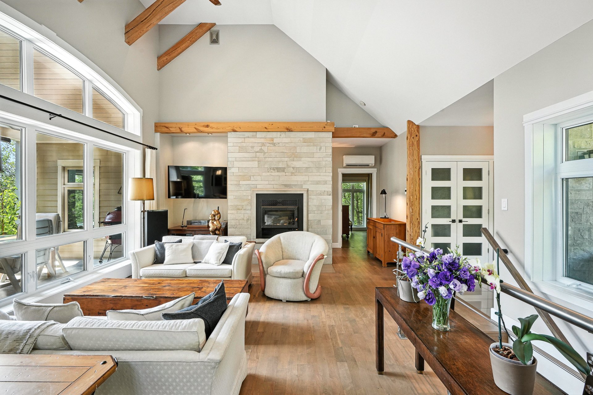 Architecture seamlessly integrated into its natural surroundings on 4.32 wooded acres with private trails. Light-filled volumes and clean contemporary lines, 16-foot cathedral ceilings, waxed maple floors with radiant heating on the main level and ceramic flooring on the garden level, living room with a wood-burning fireplace. Heated triple garage with a versatile room above, a spacious workshop offering the potential for an additional bedroom, and two covered terraces oriented toward sunset views. Fiber cement and stone cladding, steel roof, and superior insulation, located near Lake Memphrémagog, +- 7 km from Magog and 1.5 hours from MTL.