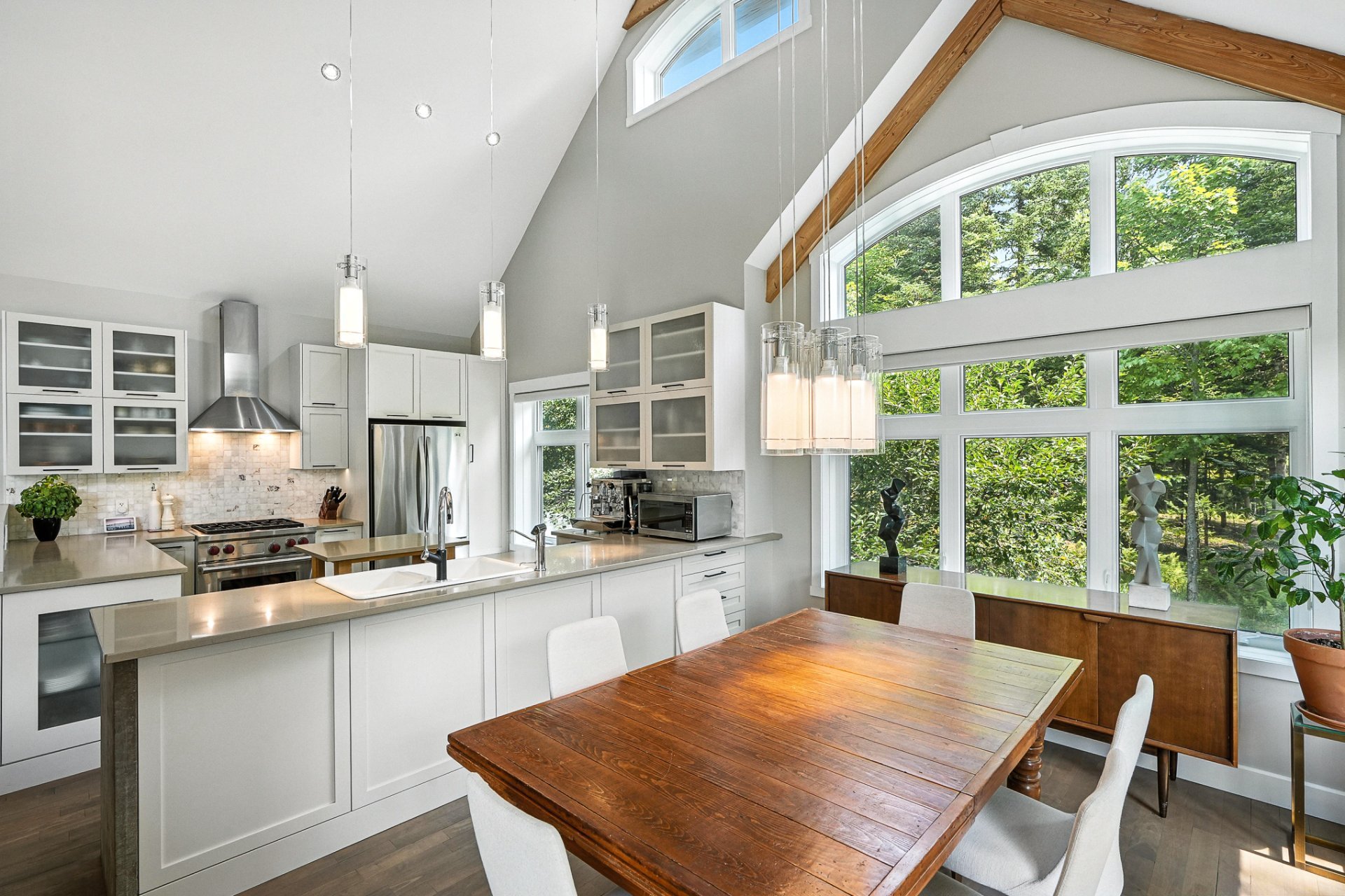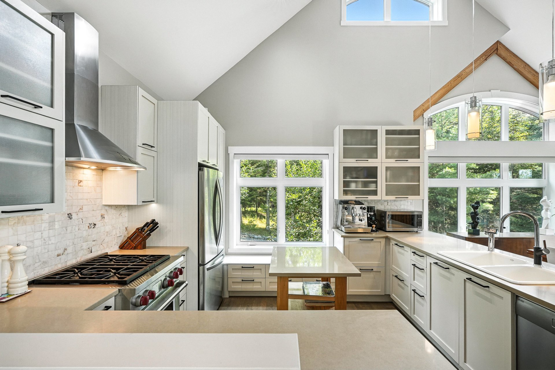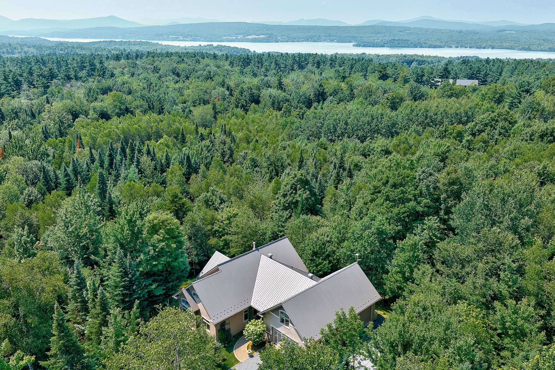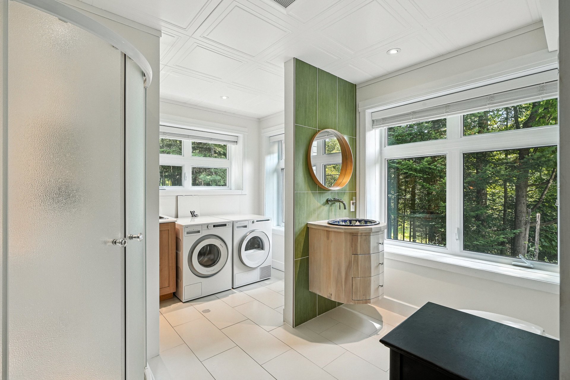 Architecture seamlessly integrated into its natural surroundings on 4.32 wooded acres with private trails. Light-filled volumes and clean contemporary lines, 16-foot cathedral ceilings, waxed maple floors with radiant heating on the main level and ceramic flooring on the garden level, living room with a wood-burning fireplace. Heated triple garage with a versatile room above, a spacious workshop offering the potential for an additional bedroom, and two covered terraces oriented toward sunset views. Fiber cement and stone cladding, steel roof, and superior insulation, located near Lake Memphrémagog, +- 7 km from Magog and 1.5 hours from MTL.